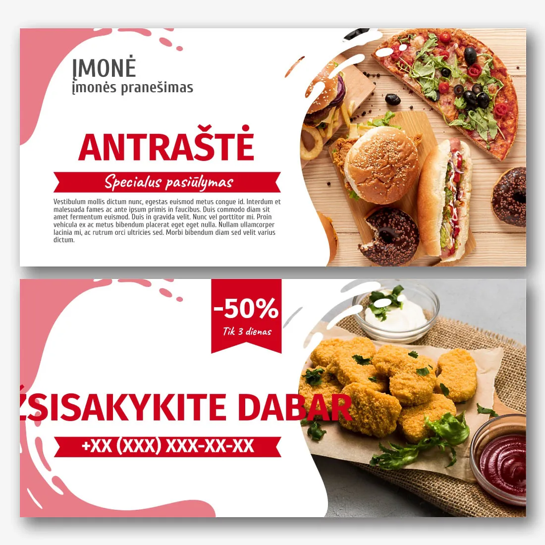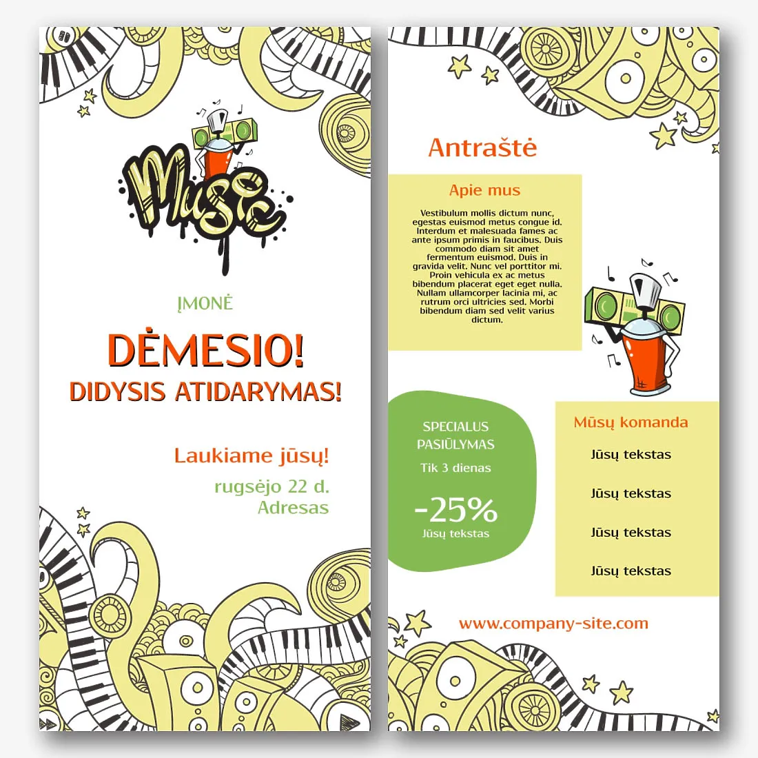 Antra, dizainas turi būti veiksmingas ir sukurtas profesionaliai. Lankstinukų ir skrajučių dizainas turi būti priderintas pagal įmonės stilių ir atitikti tikslą, kurio siekiama. Galite pasinaudoti mūsų internetiniu lankstinukų kūrimo įrankiu ir nemokamai susikurti savo lankstinukų maketą arba atsisiųsti nemokamus lankstinukų šablonus.