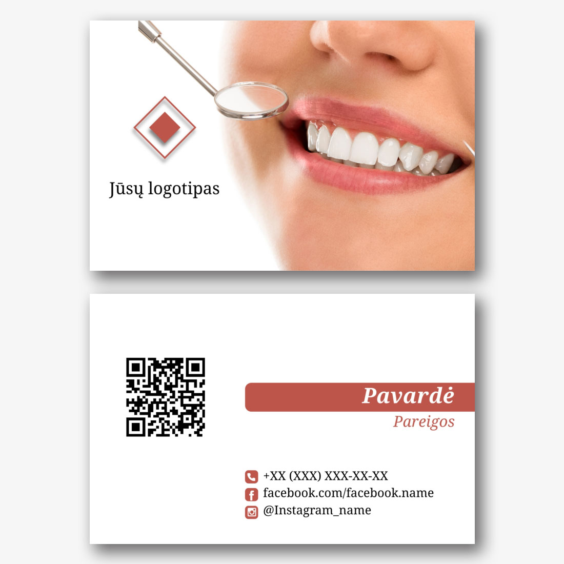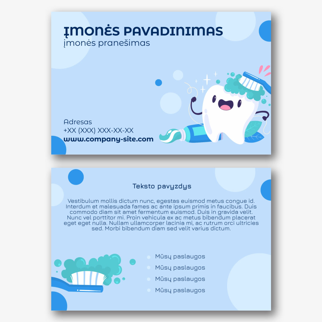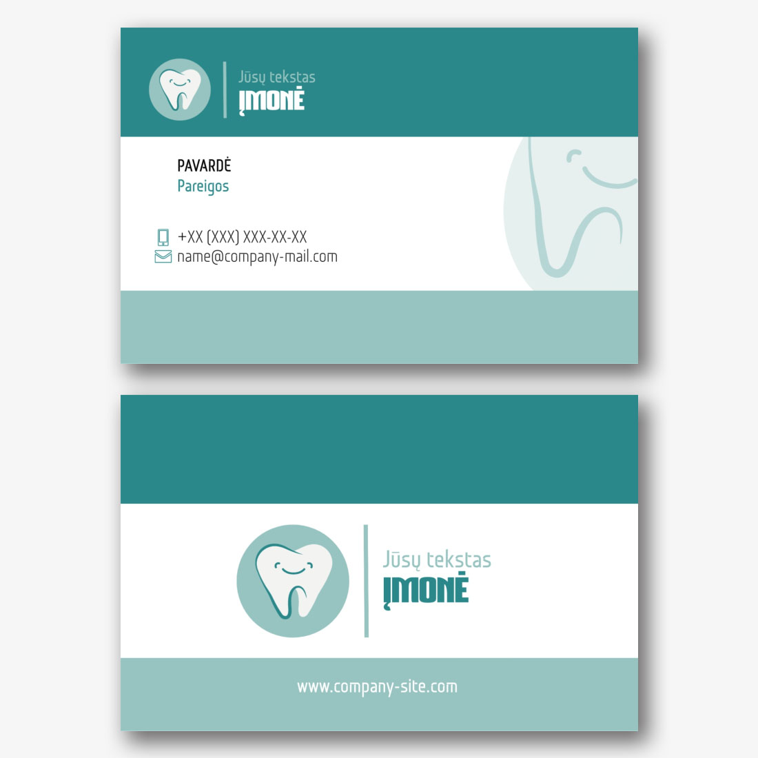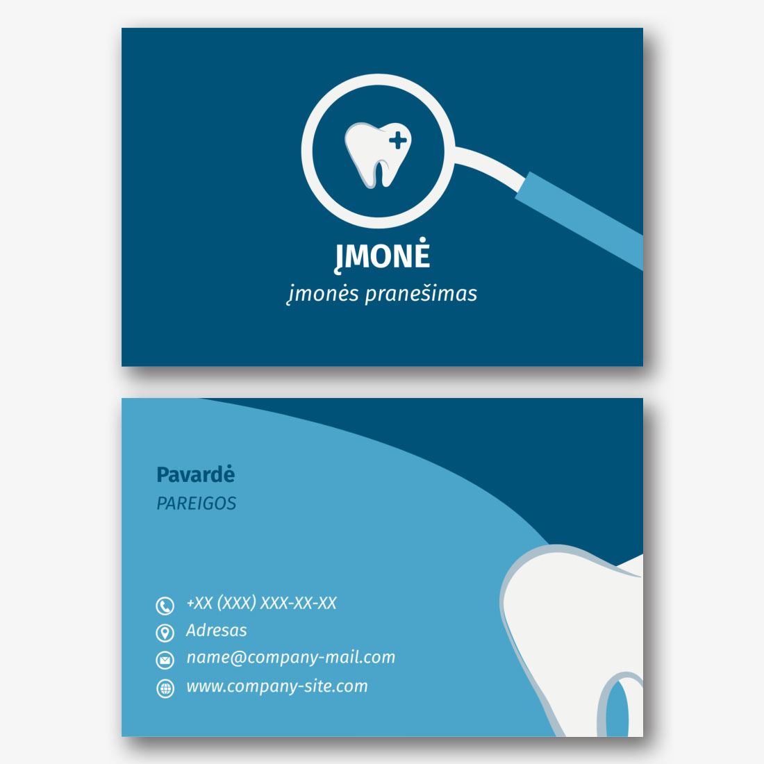 Nemokamas vizitinių kortelių šablonas odontologijai, odontologijos klinikai ir odontologams. Sukurkite vizitinės kortelės išdėstymą su savo rankomis vizitinės kortelės dizaineriu.
