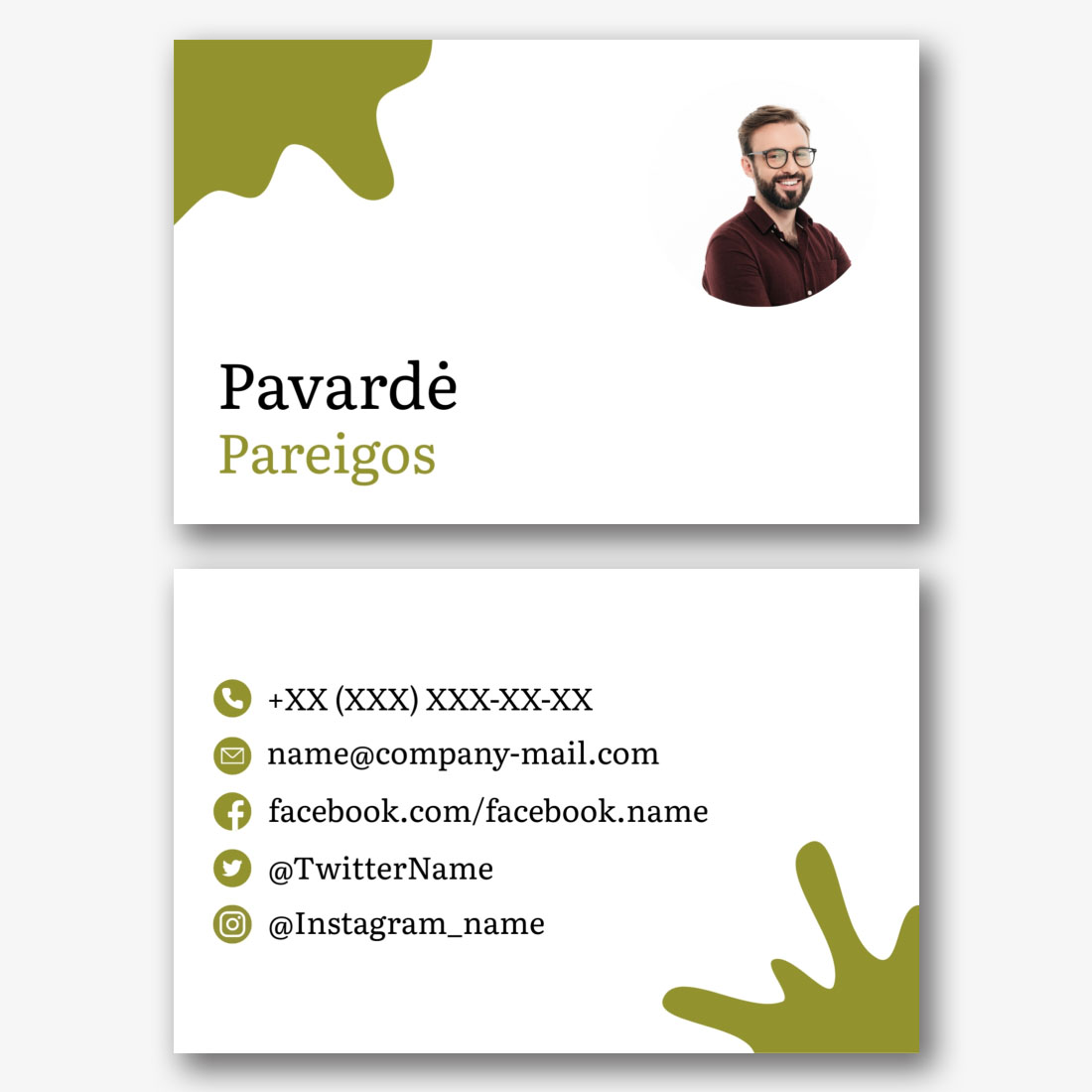 Nemokama asmeninė vizitinė kortelė šabloną su nuotraukomis. Sukurkite išdėstymą su savo rankomis vizitinės kortelės dizaineriu.