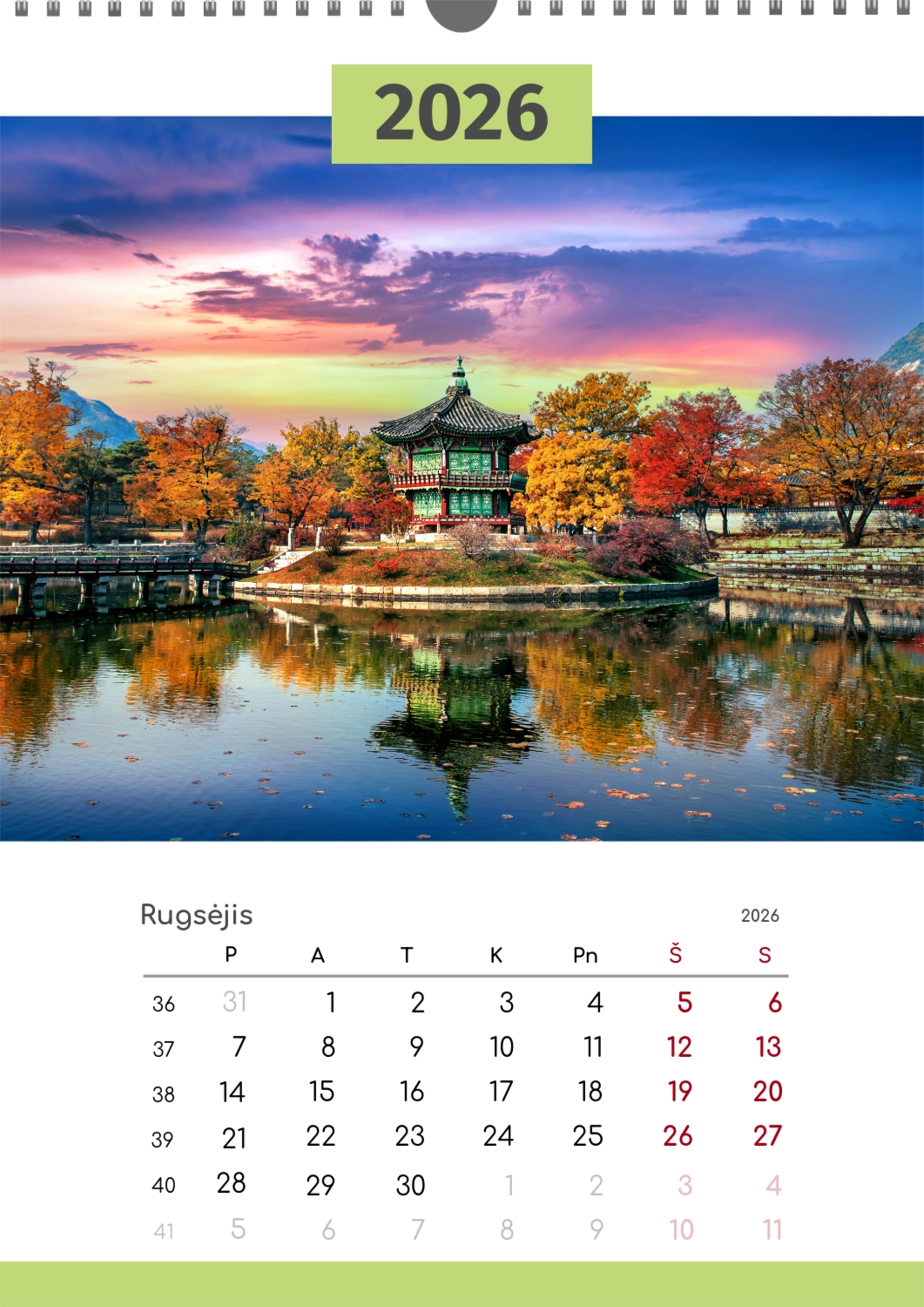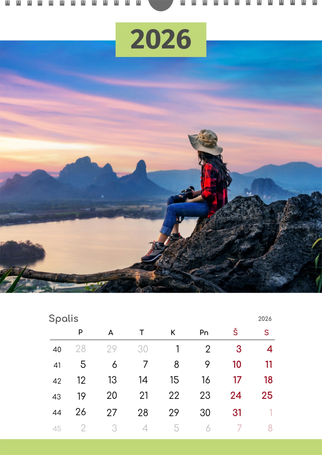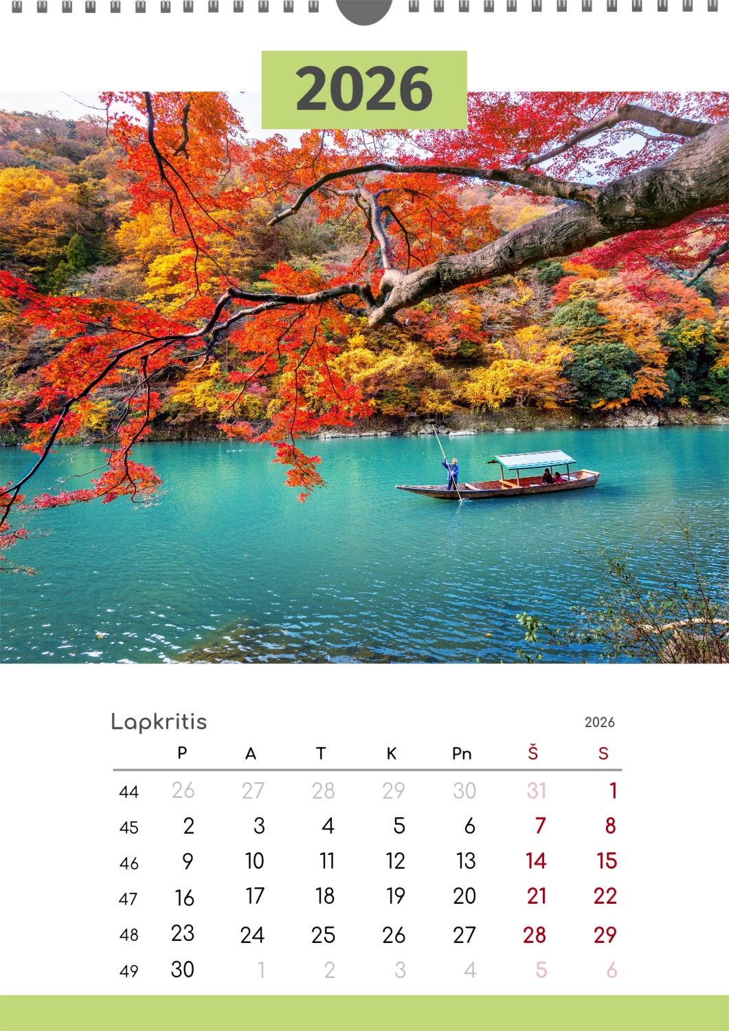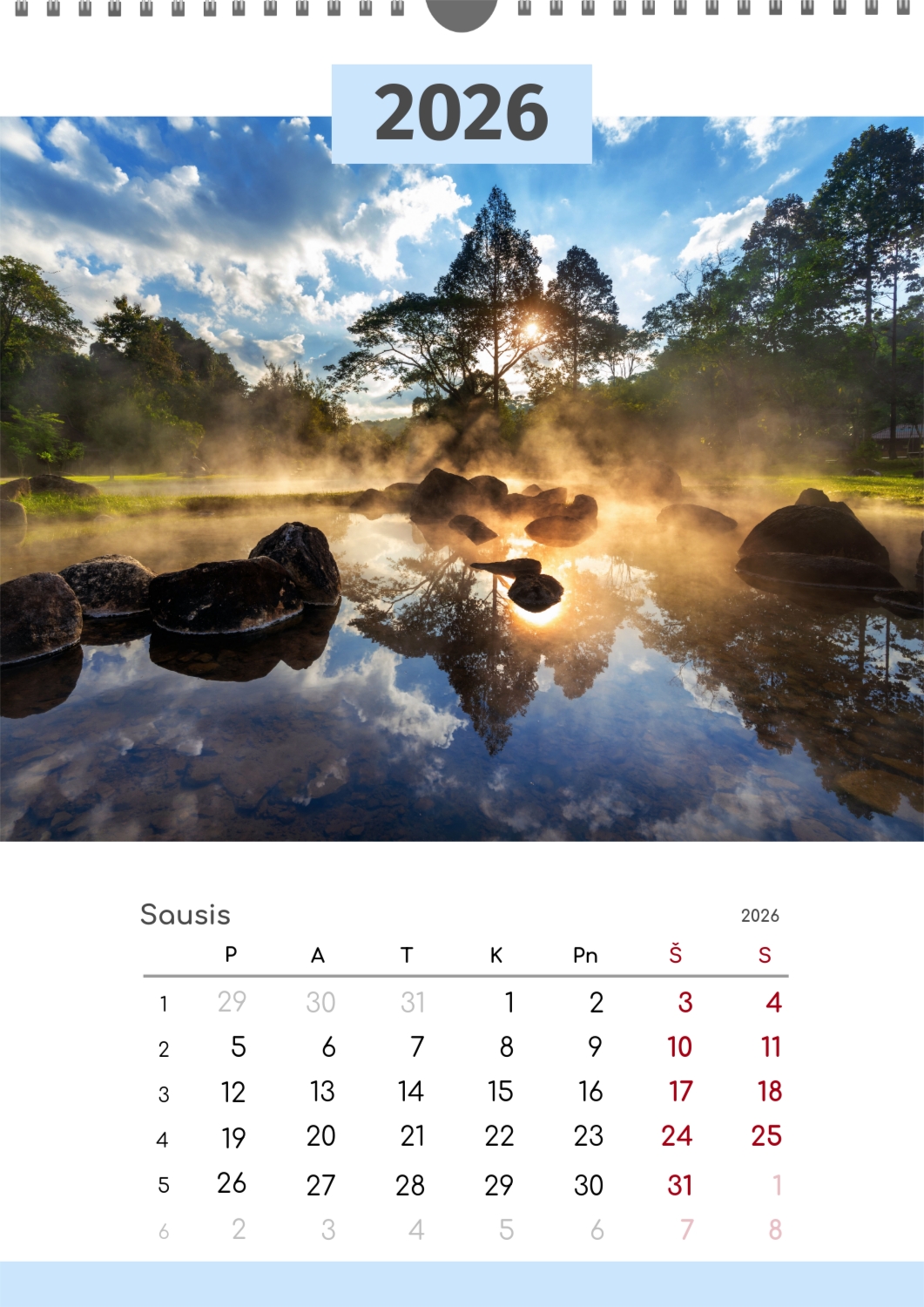 Nemokamas sieninio kalendoriaus šablonas su peizažais ir nuostabiais gamtos vaizdais. Sukurkite išdėstymą su savo rankomis internetiniame kalendoriaus dizaineryje.