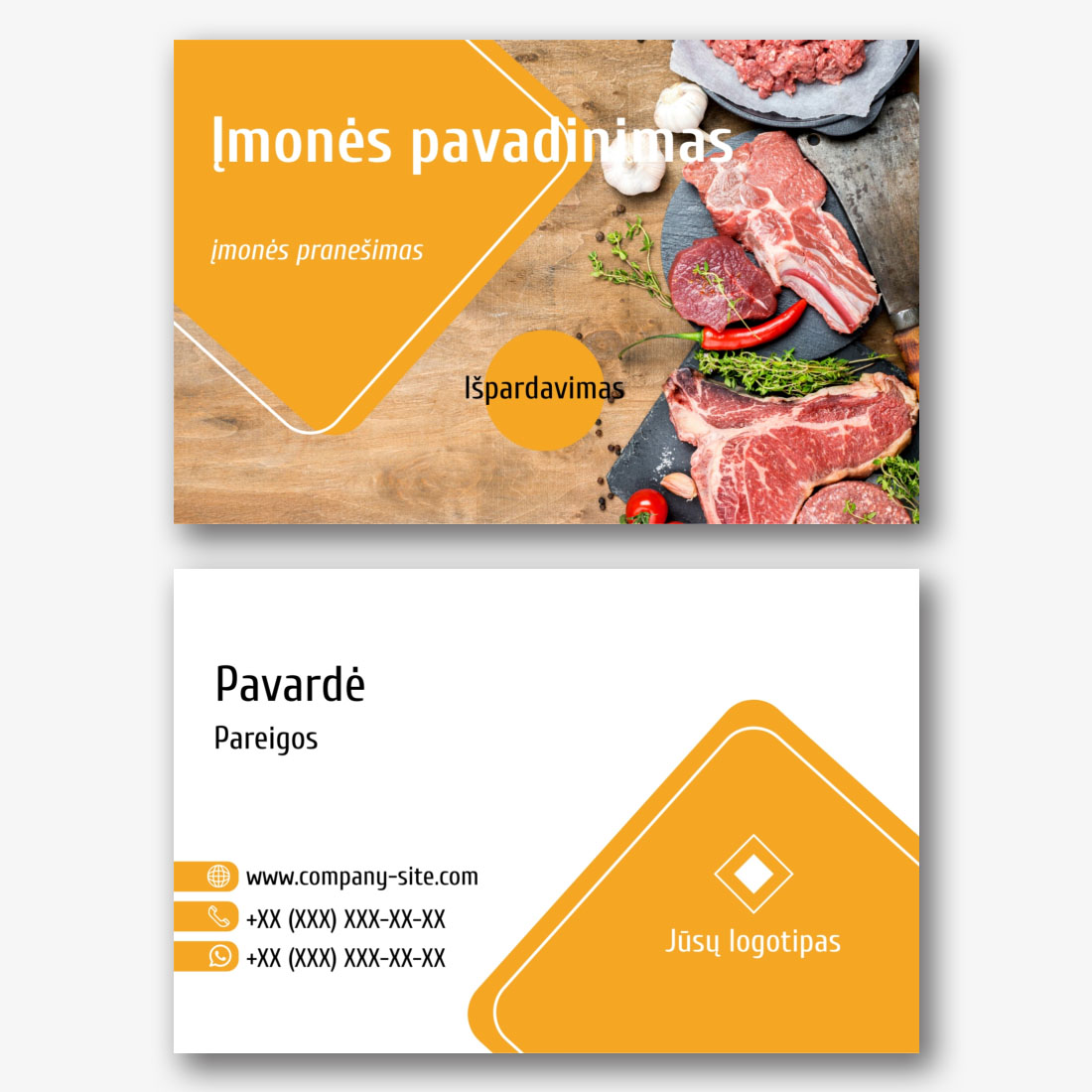 Nemokamas vizitinės kortelės Šablonas mėsos tiekėjui, mėsos paviljonui, mėsos platintojui. Sukurkite išdėstymą su savo rankomis vizitinės kortelės dizaineriu.