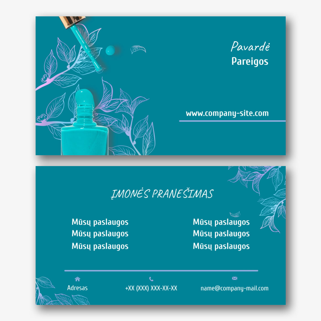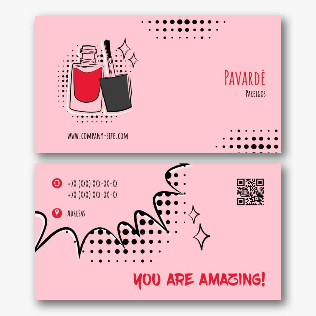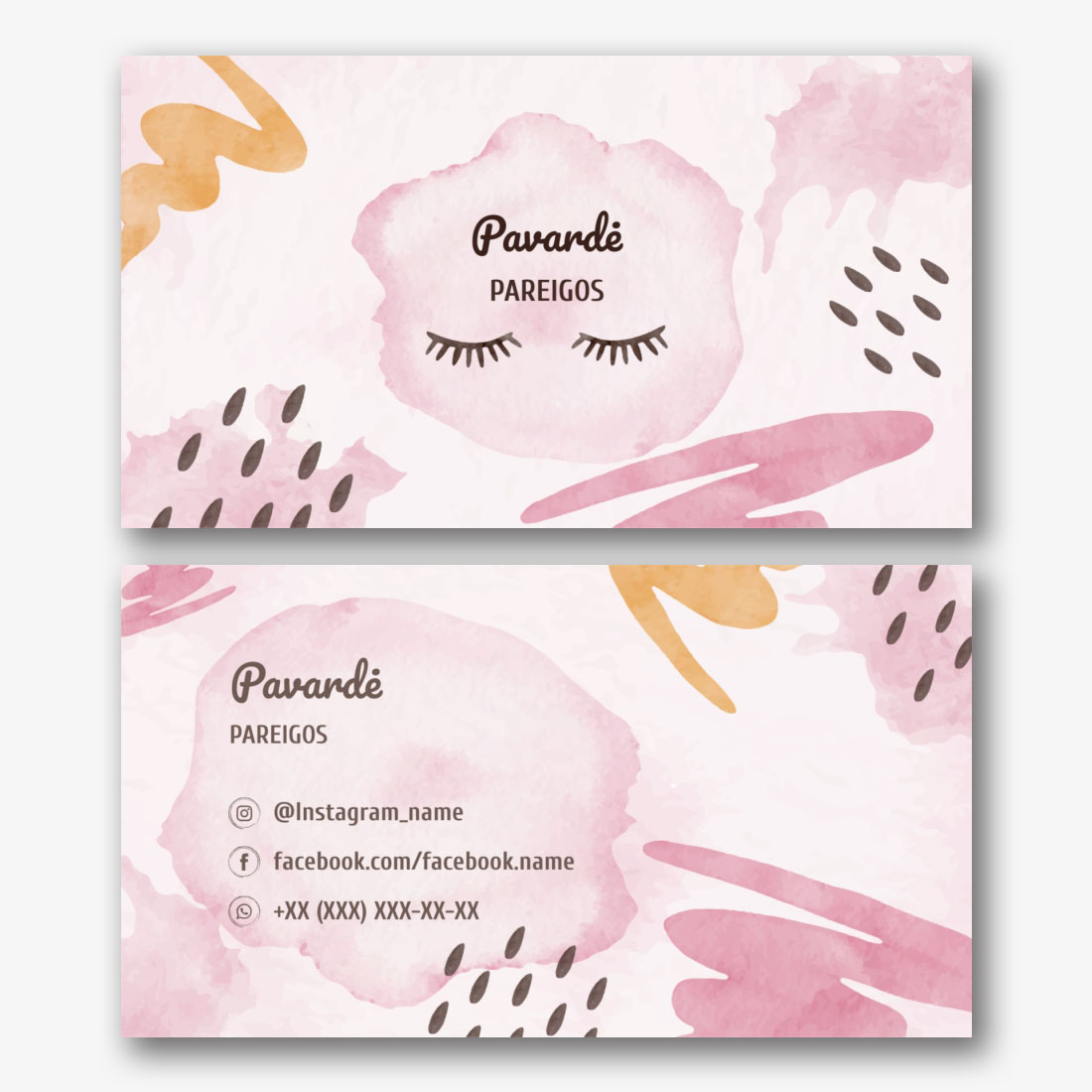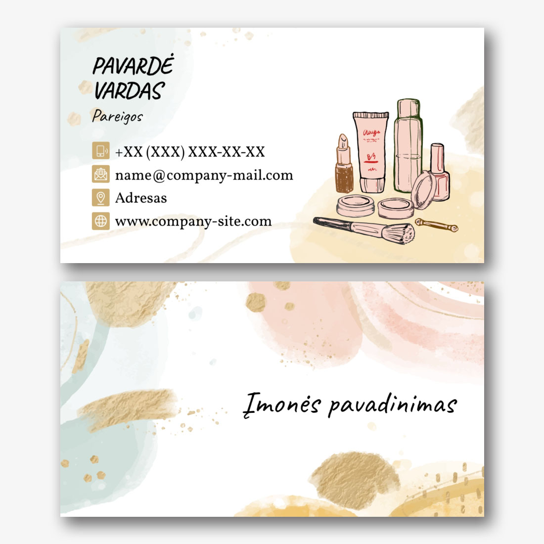 Nemokamas vizitinių kortelių šablonas kosmetologui, viliojimo kosmetikos parduotuvei, spa salonui. Sukurkite išdėstymą su savo rankomis vizitinės kortelės dizaineriu.