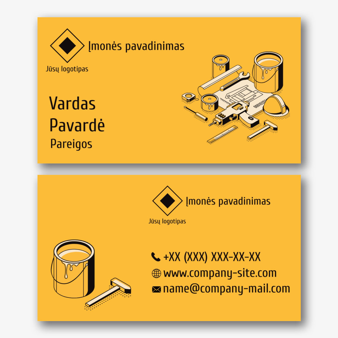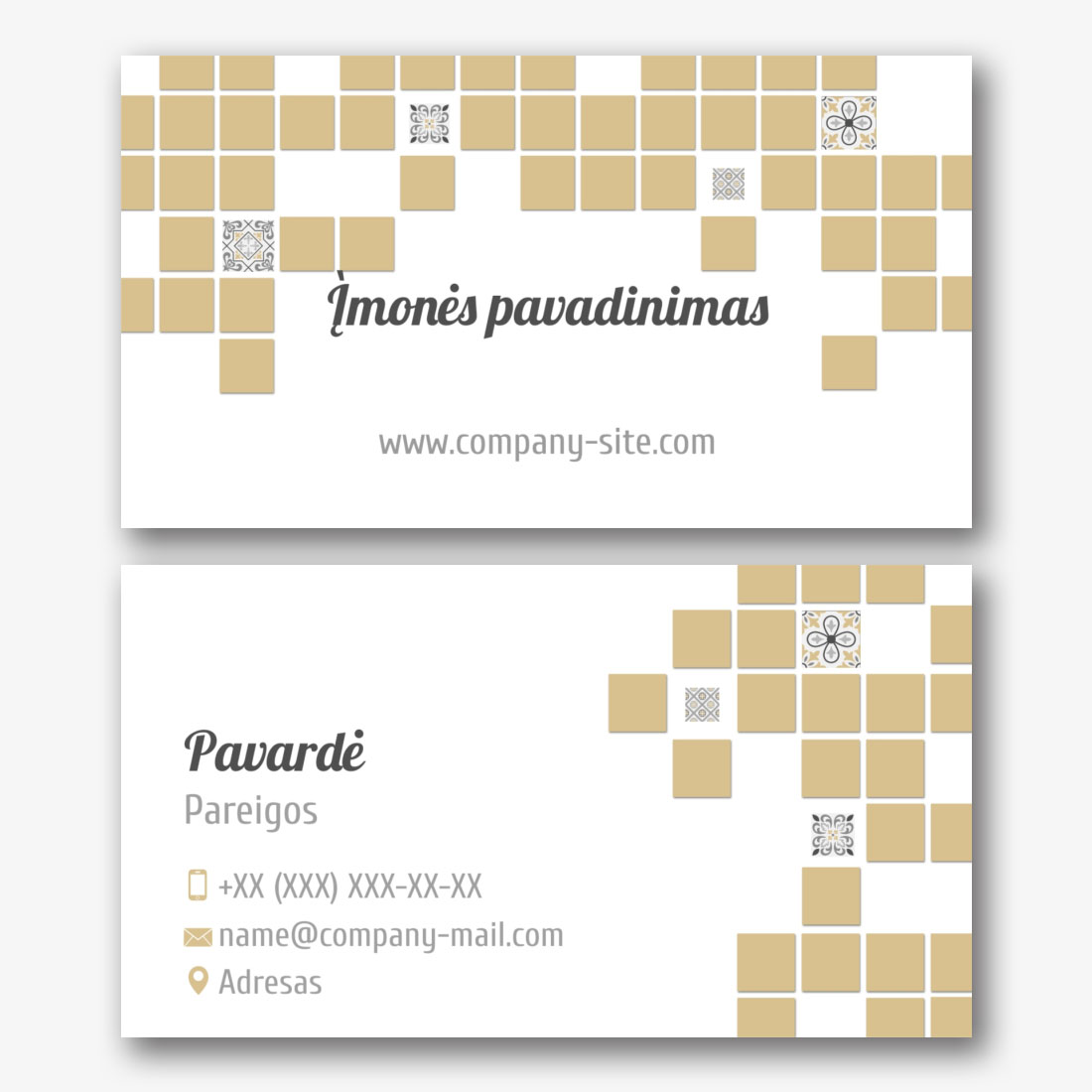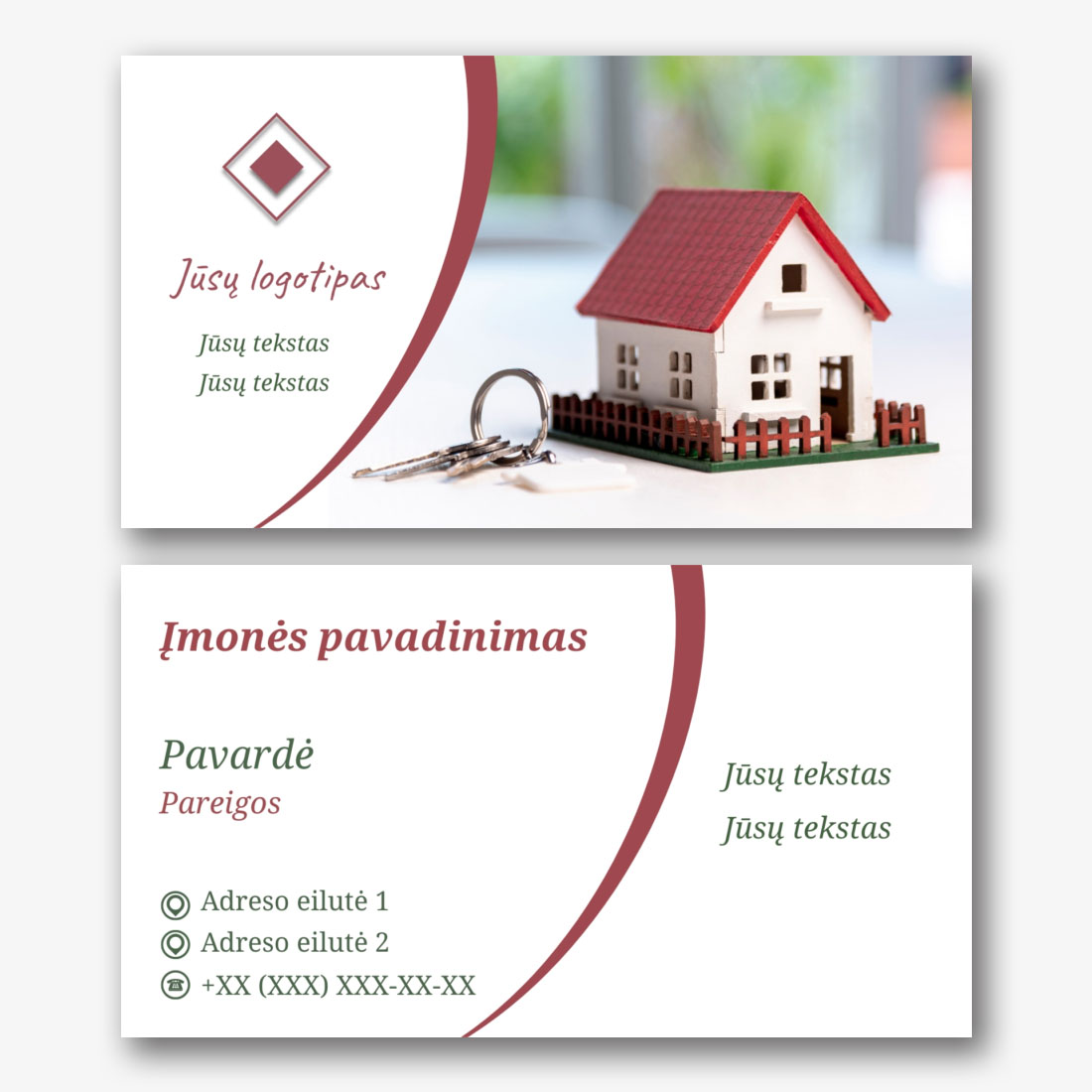 Nemokamas vizitinės kortelės Šablonas nekilnojamojo turto agentūrai, vystytojui, makleriui, brokeriui. Sukurkite išdėstymą su savo rankomis vizitinės kortelės dizaineriu.
