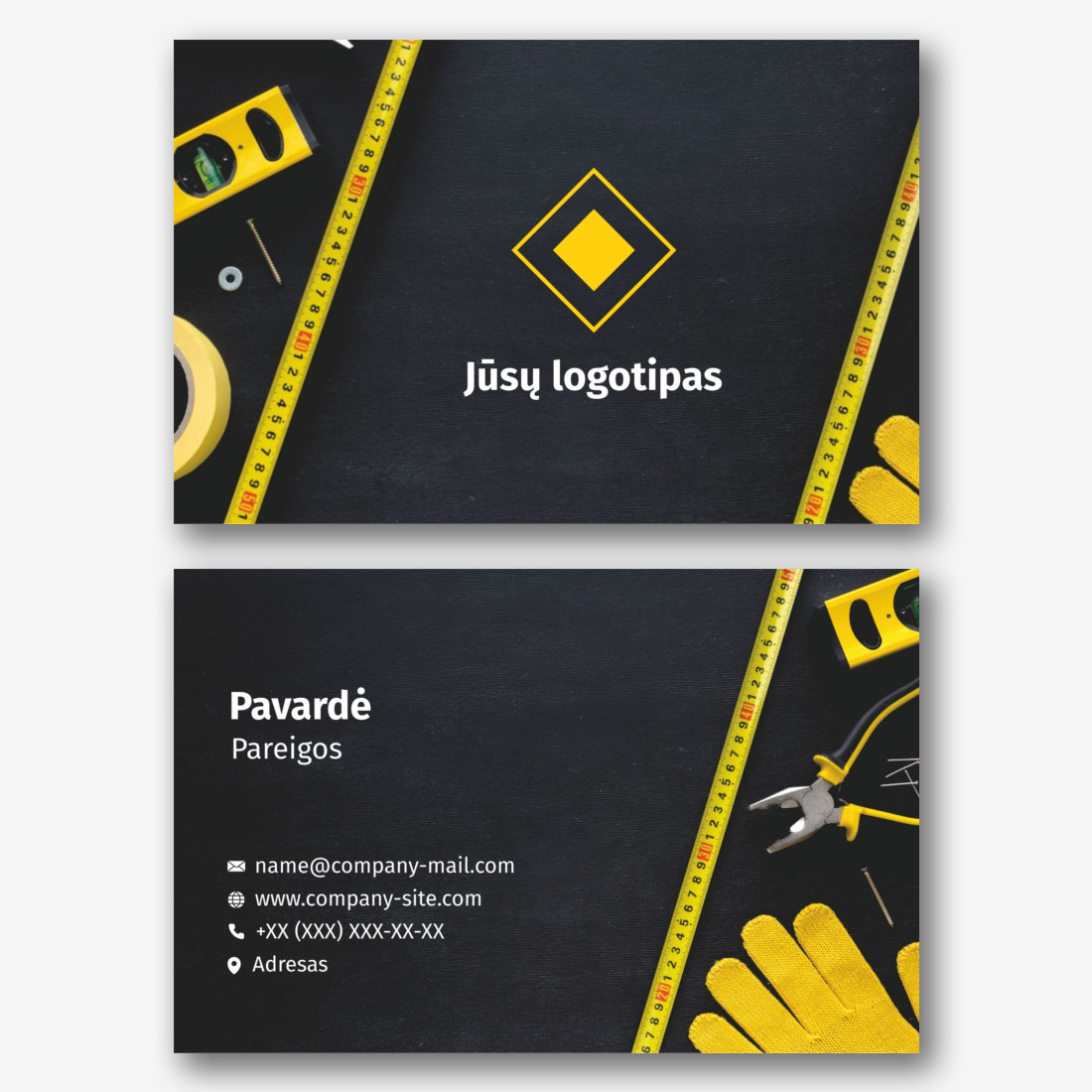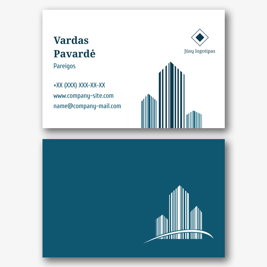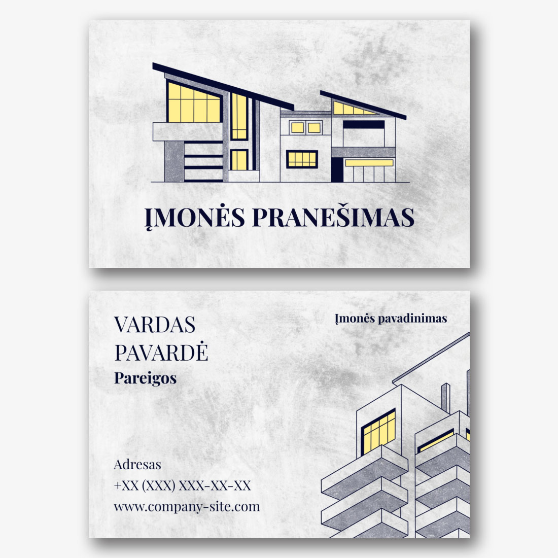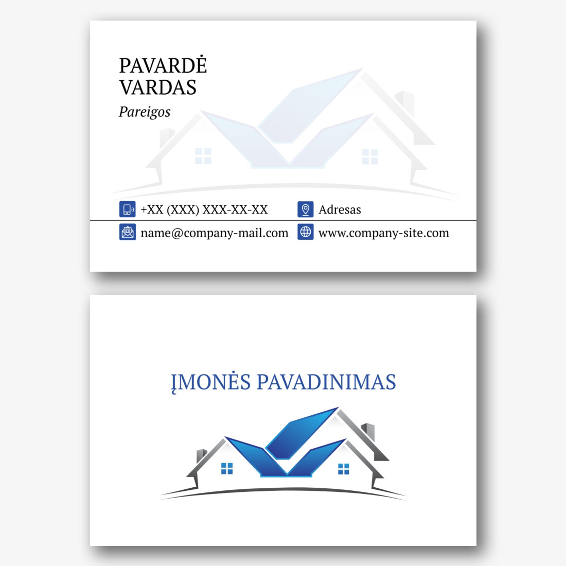 Nemokamas vizitinės kortelės Šablonas statybų įmonei, vystytojui, makleriui, nekilnojamojo turto agentūrai. Sukurkite išdėstymą su savo rankomis vizitinės kortelės dizaineriu.