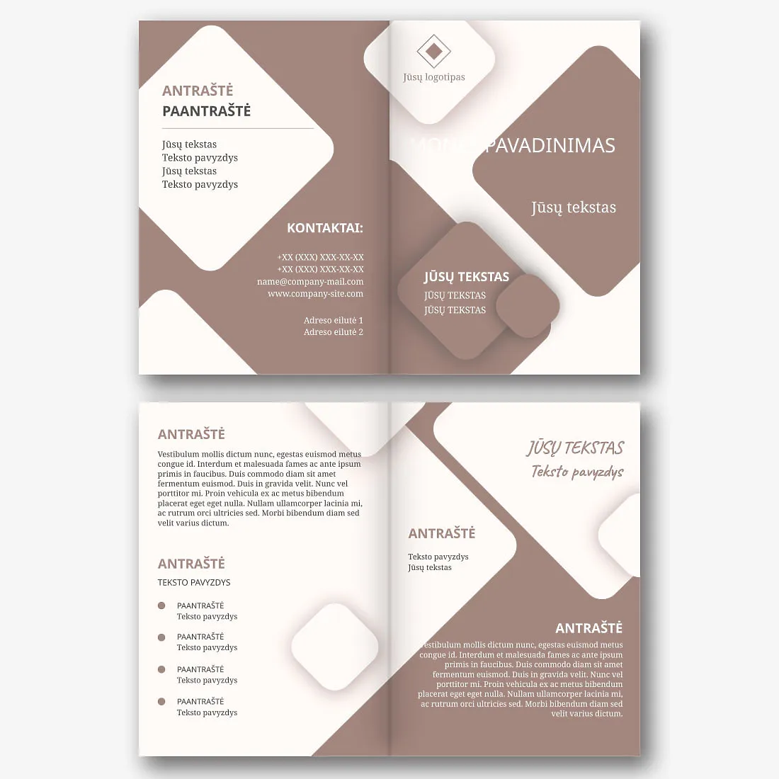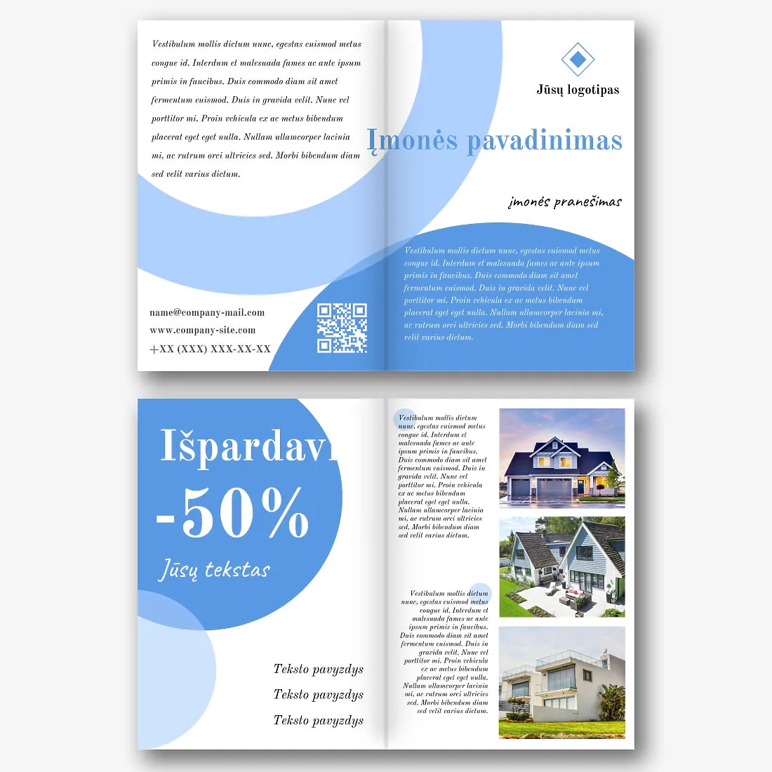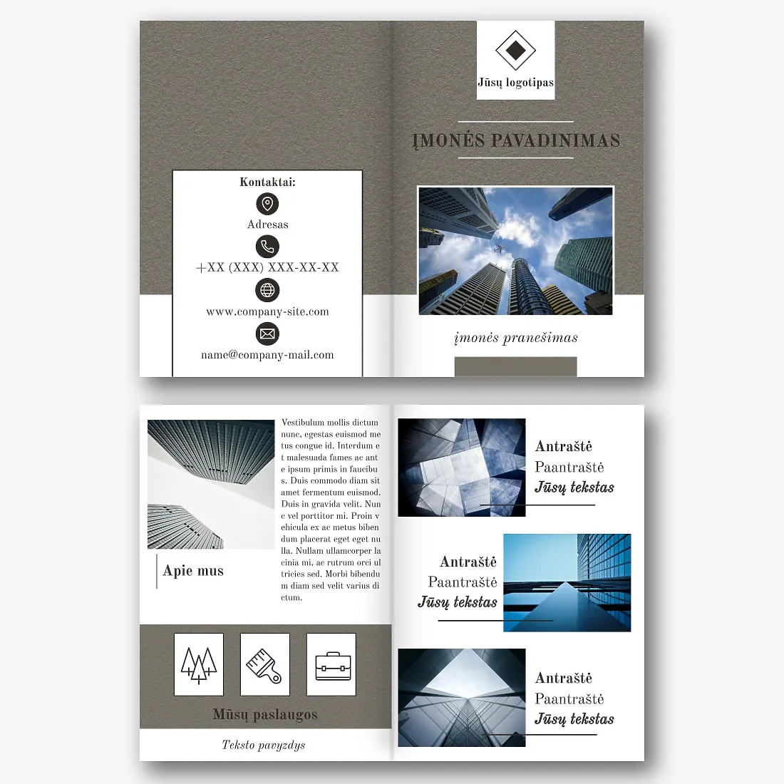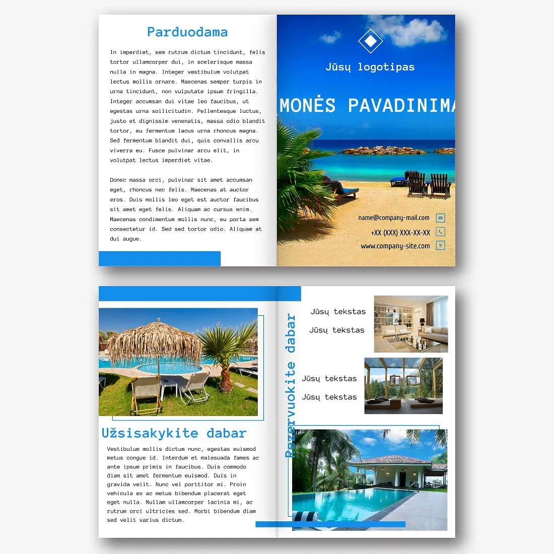 Nemokamas informacinės brošiūros šablonas internetinei nekilnojamojo turto įmonei, vystytojui, vystytojui. Sukurkite brošiūros išdėstymą su savo rankomis internetiniame dizaineryje.