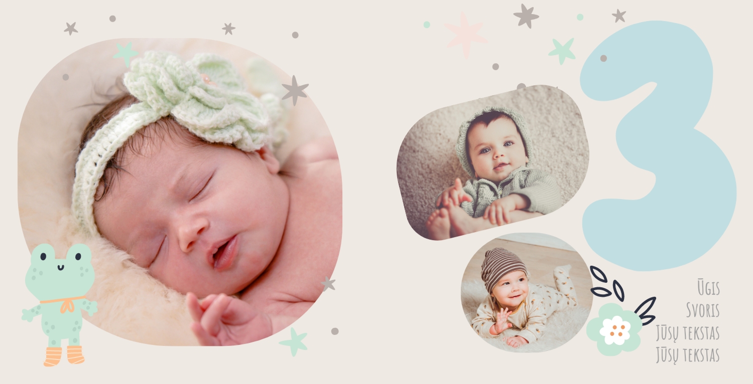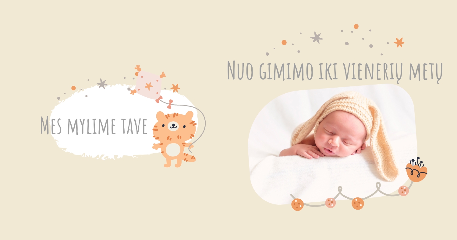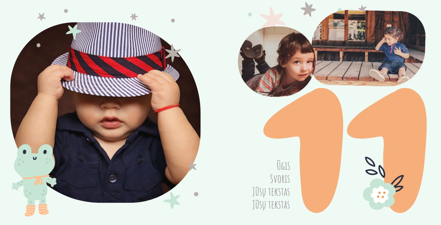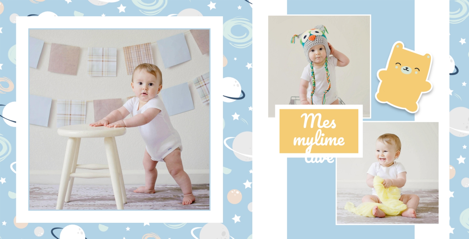 Nemokamas vaikų nuotraukų knygos šablonas nuo gimimo iki metų. Sukurkite išdėstymą su savo rankomis internetinėje nuotraukų knygų dizaineriu.