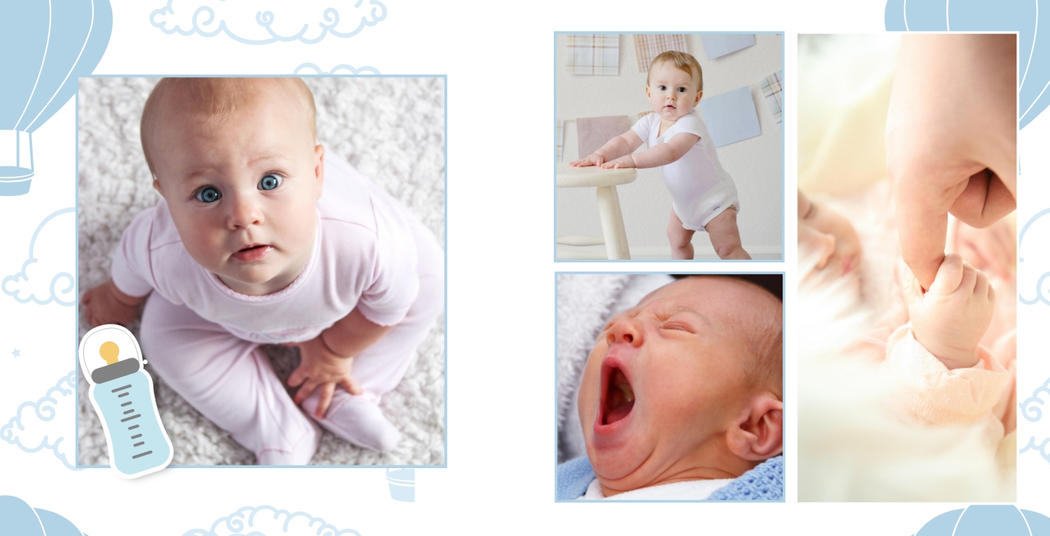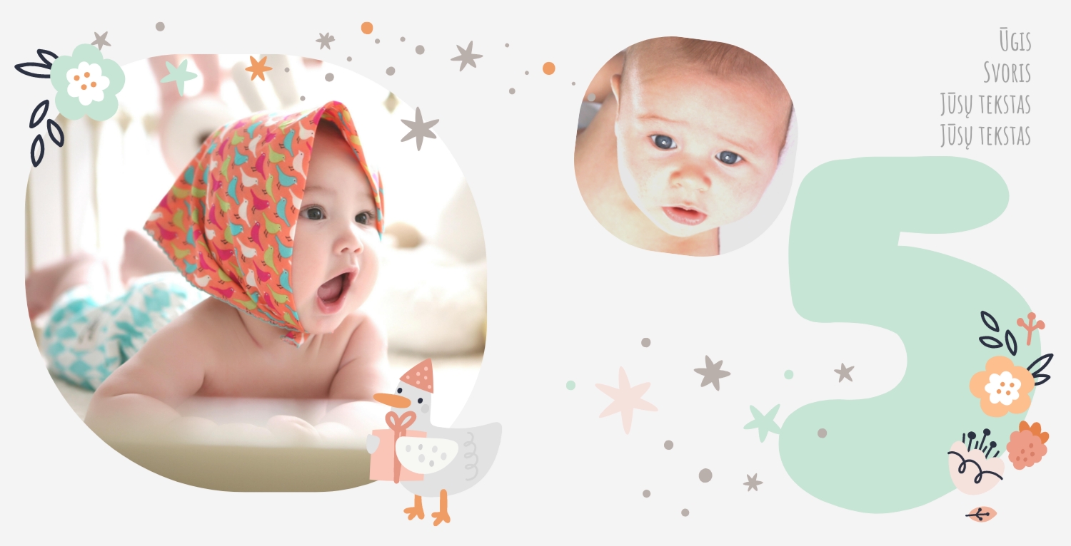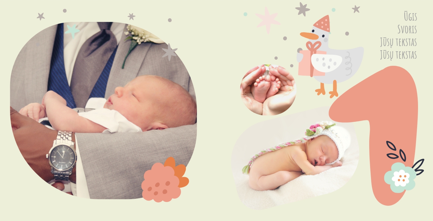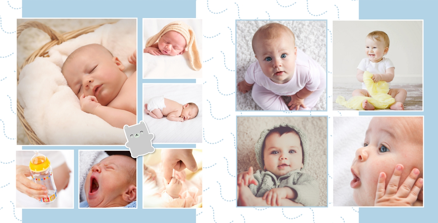 Nemokamas vaikų nuotraukų knygos šablonas nuo gimimo iki metų. Sukurkite išdėstymą su savo rankomis internetinėje nuotraukų knygų dizaineriu.