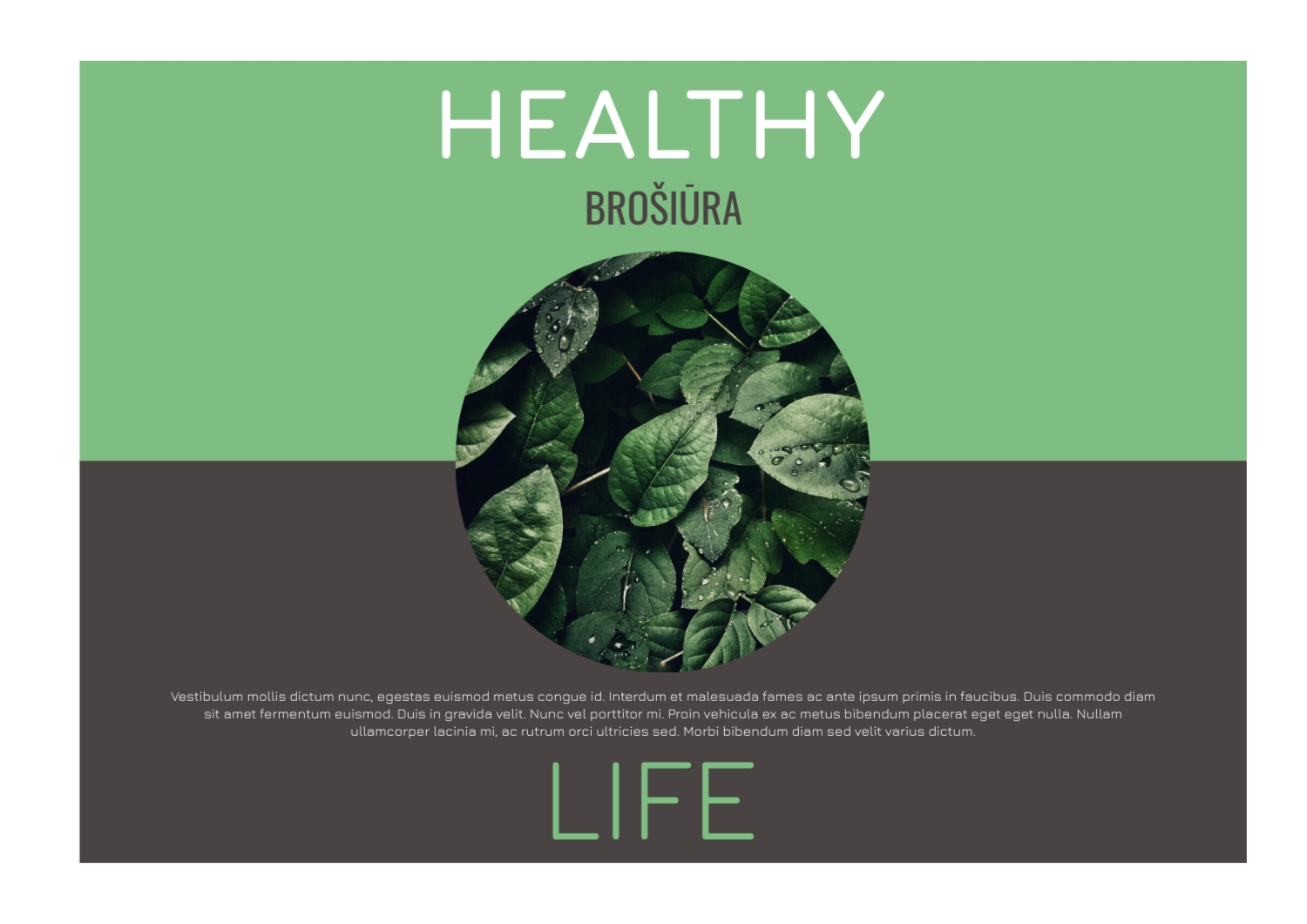 Nemokamas informacinės brošiūros apie sveiką gyvenimo būdą šablonas. Sukurkite išdėstymą su savo rankomis internetiniame brošiūros dizaineryje.