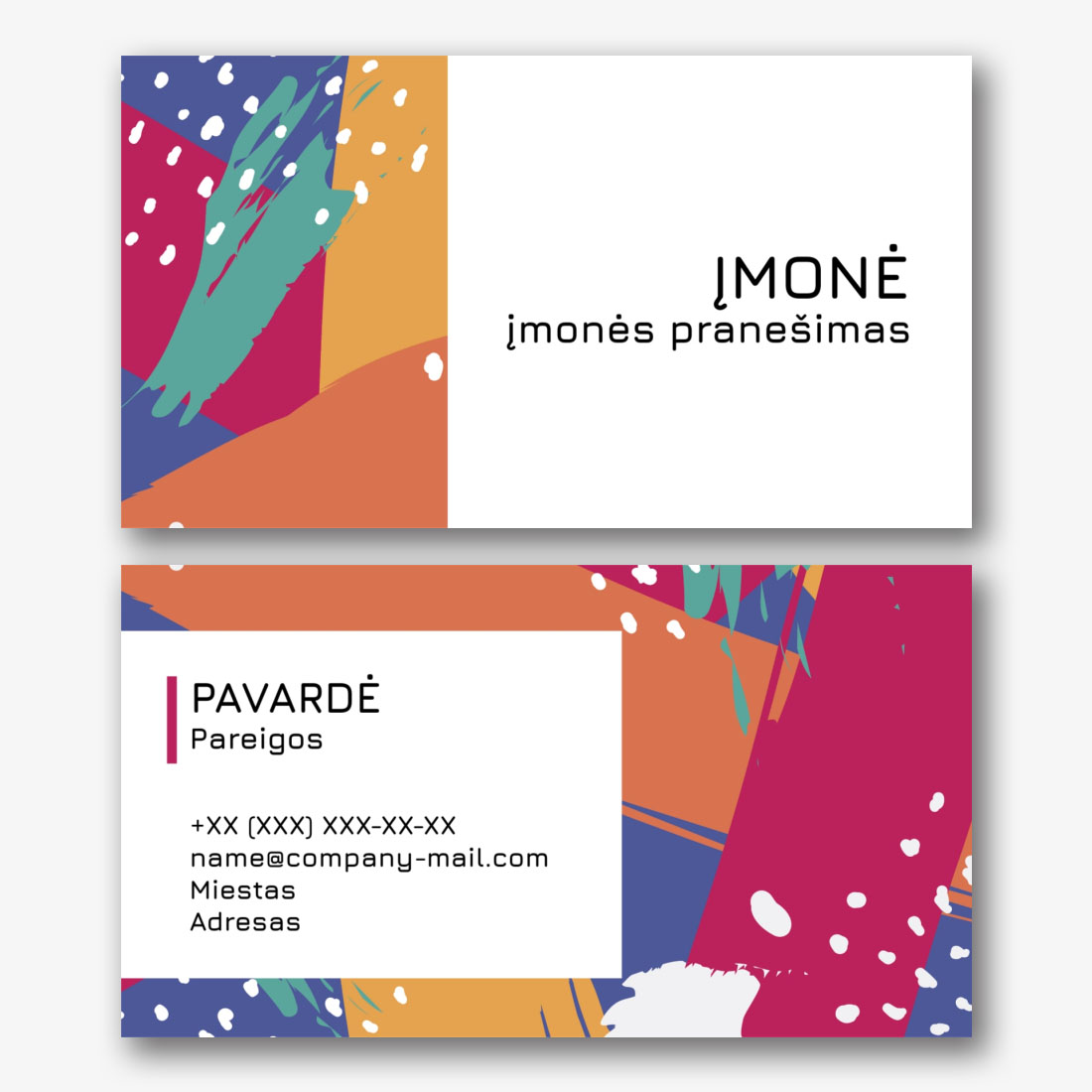 Nemokamas vertikalus įmonės vizitinės kortelės Šablonas su ryškiu fonu įmonės atstovams. Sukurkite vizitinės kortelės išdėstymą savo rankomis internetiniame vizitinių kortelių dizaineryje.