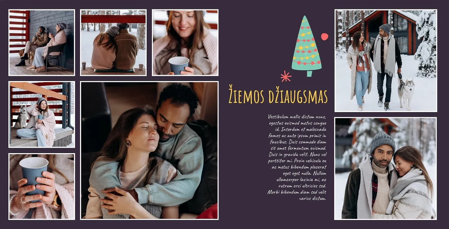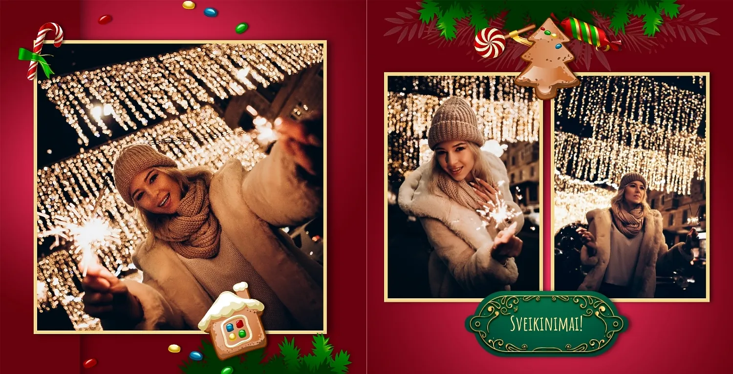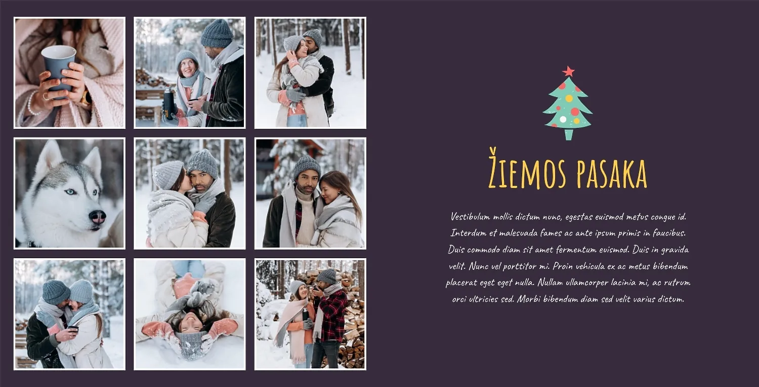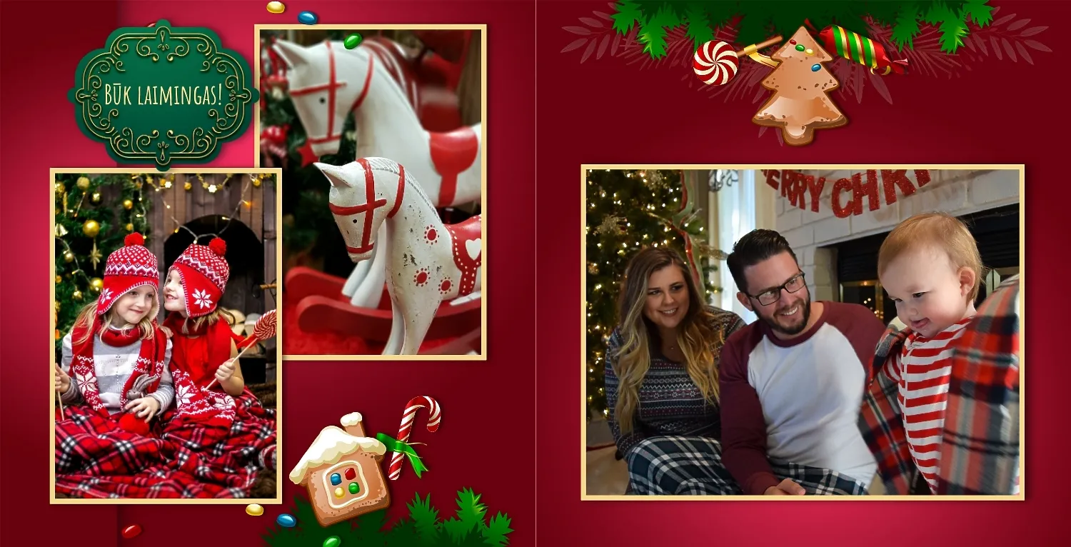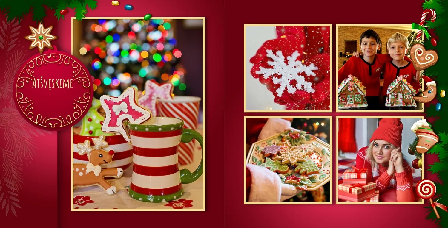 Nemokamas fotoknygos šablonas geriems prisiminimams apie Naujuosius metus, Kalėdas, žiemos šventes su šeima. Sukurkite kvadratinės nuotraukų knygos išdėstymą su savo rankomis internetiniame nuotraukų knygų dizaineryje.