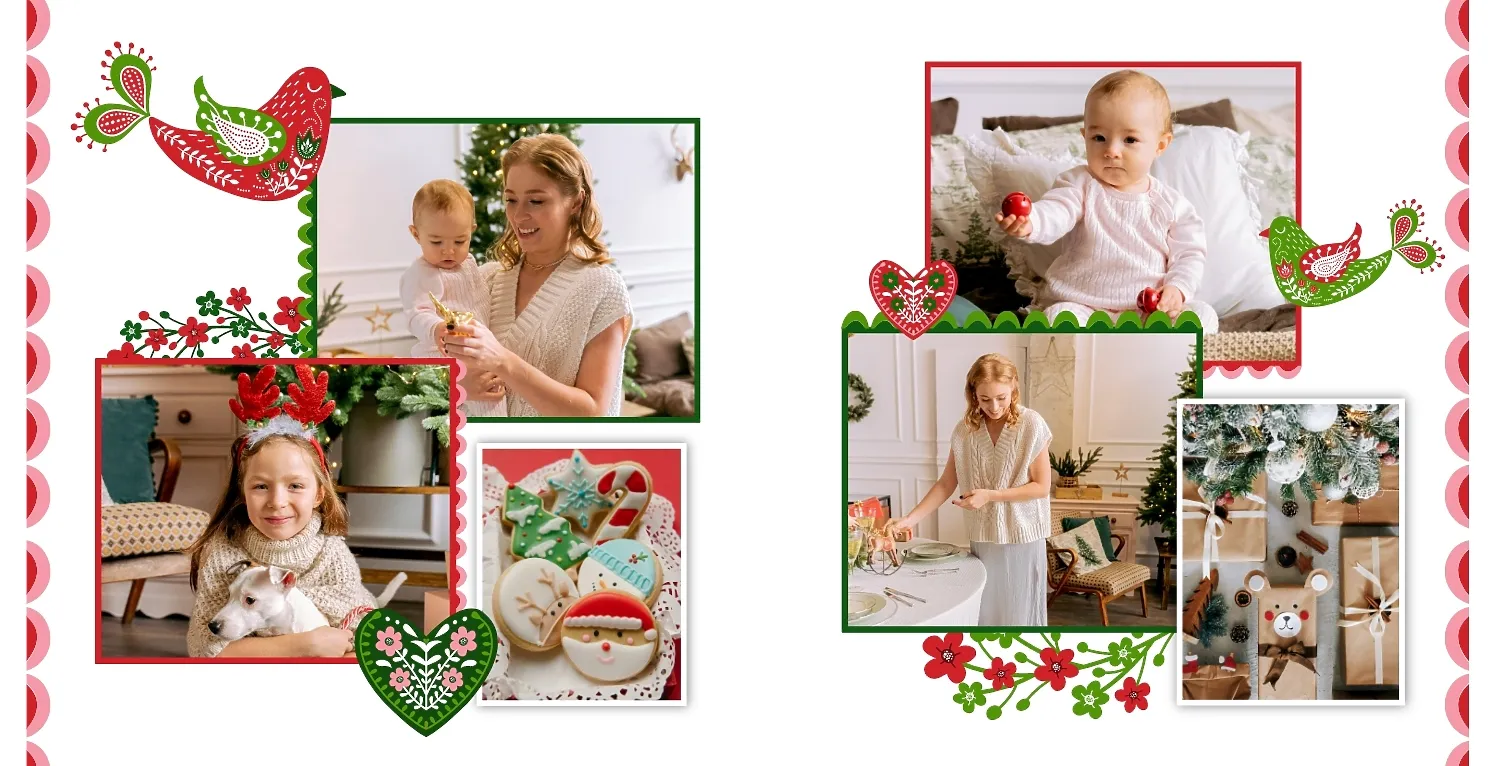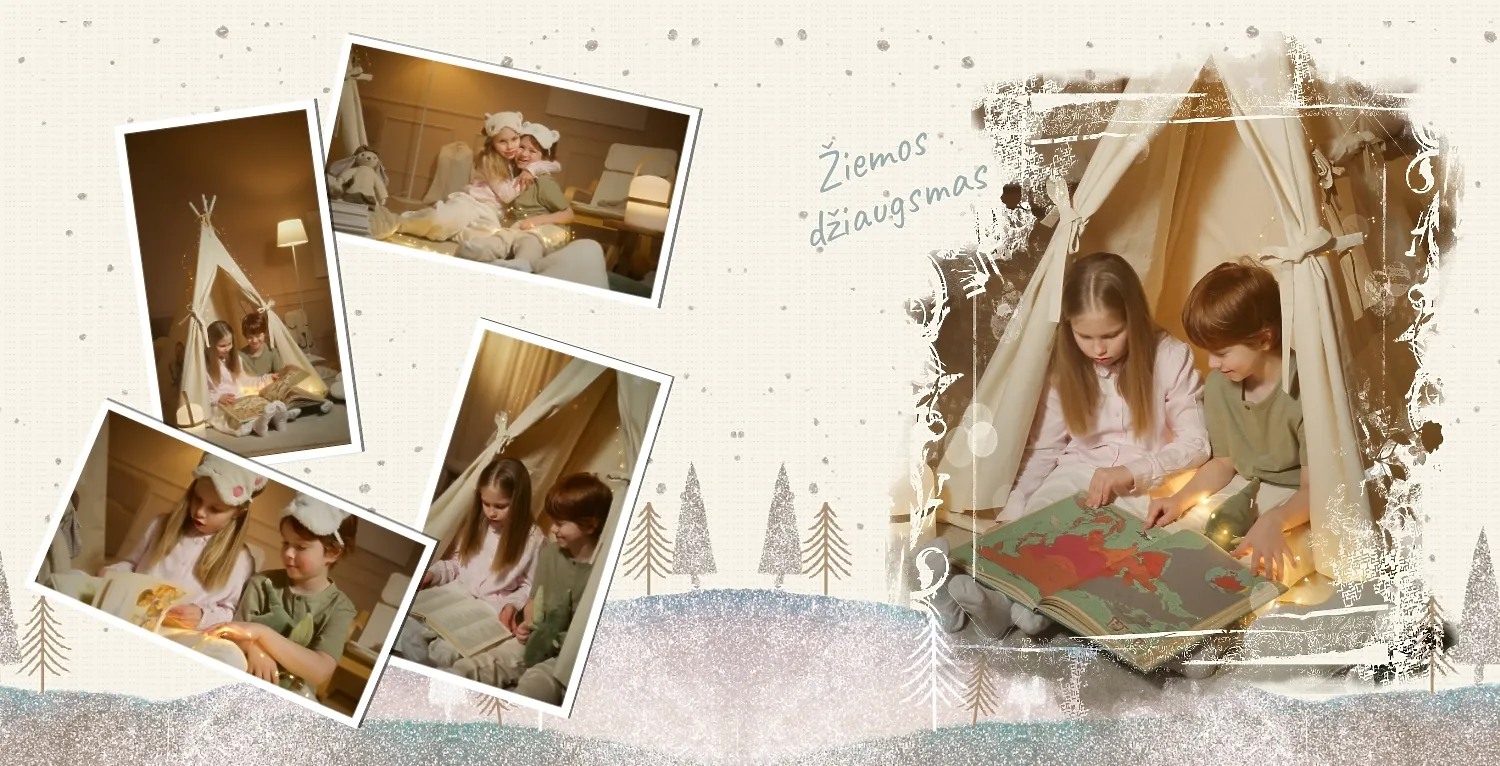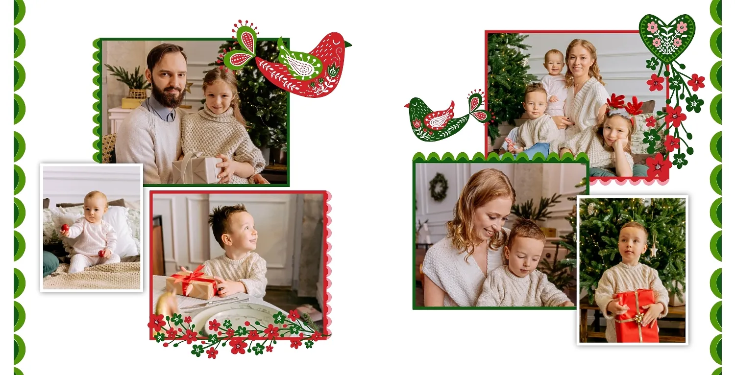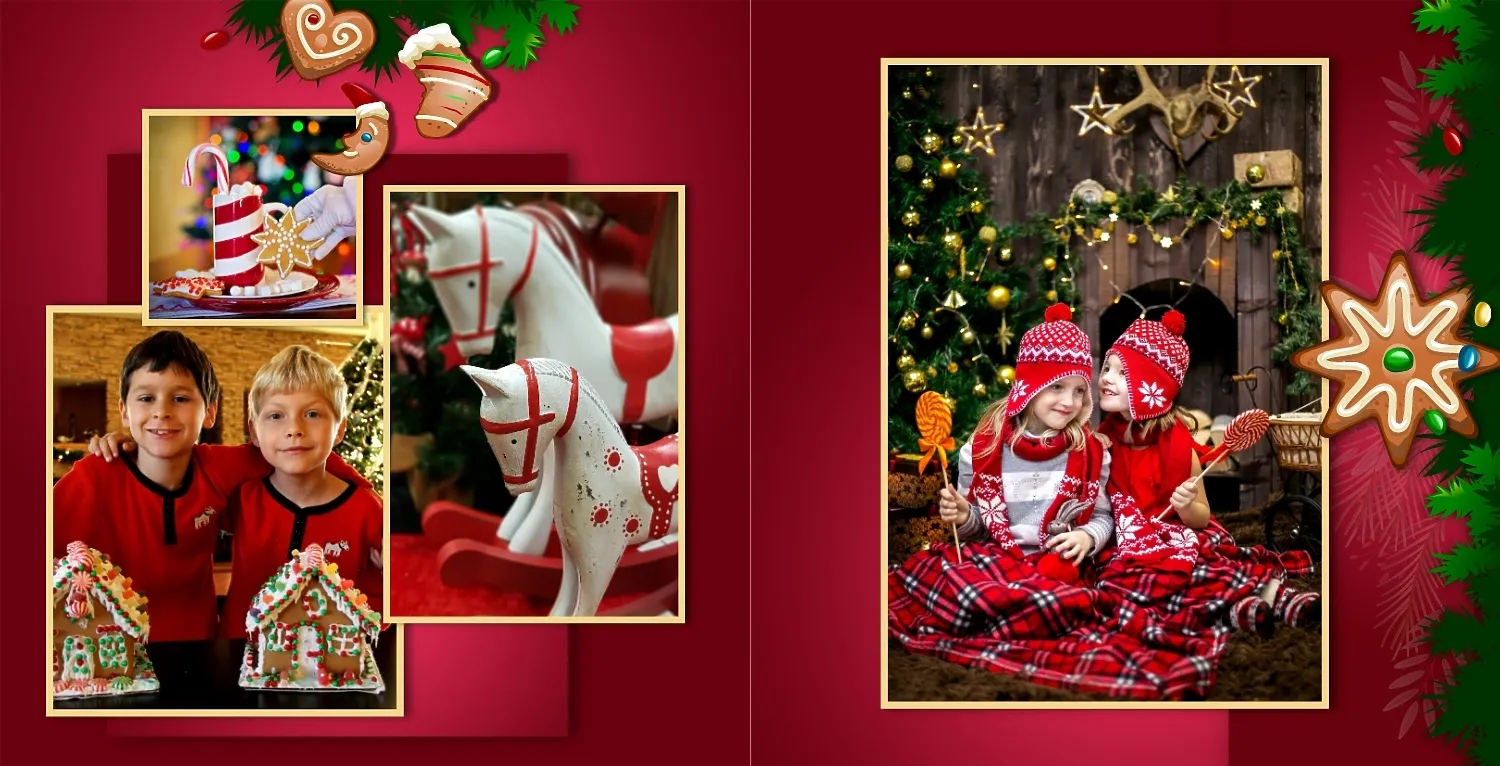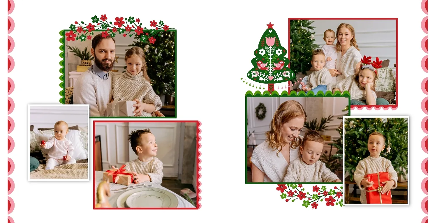 Nemokamas fotoknygos šablonas geriems prisiminimams apie Naujuosius metus, Kalėdas, žiemos šventes su šeima. Sukurkite kvadratinės nuotraukų knygos išdėstymą su savo rankomis internetiniame nuotraukų knygų dizaineryje.