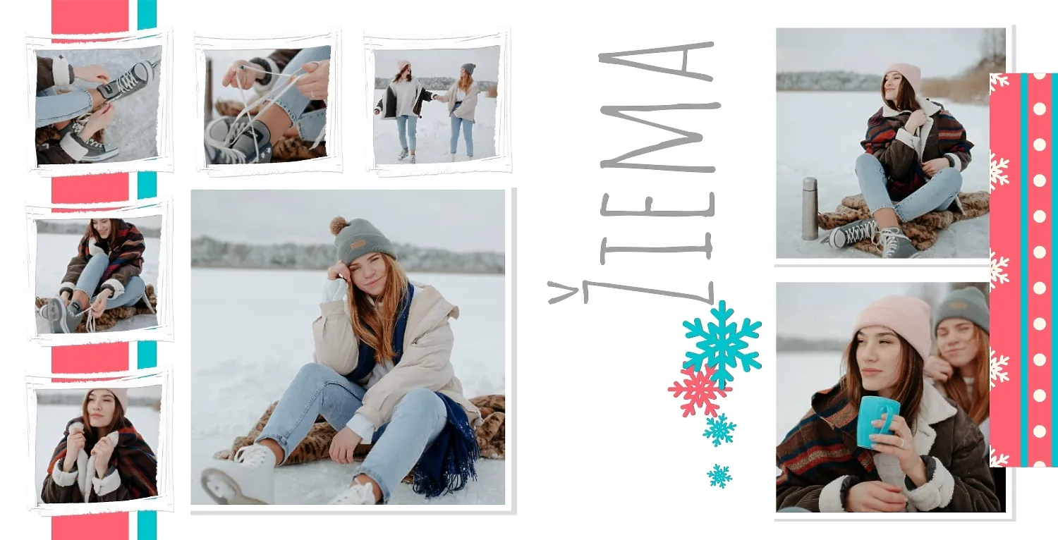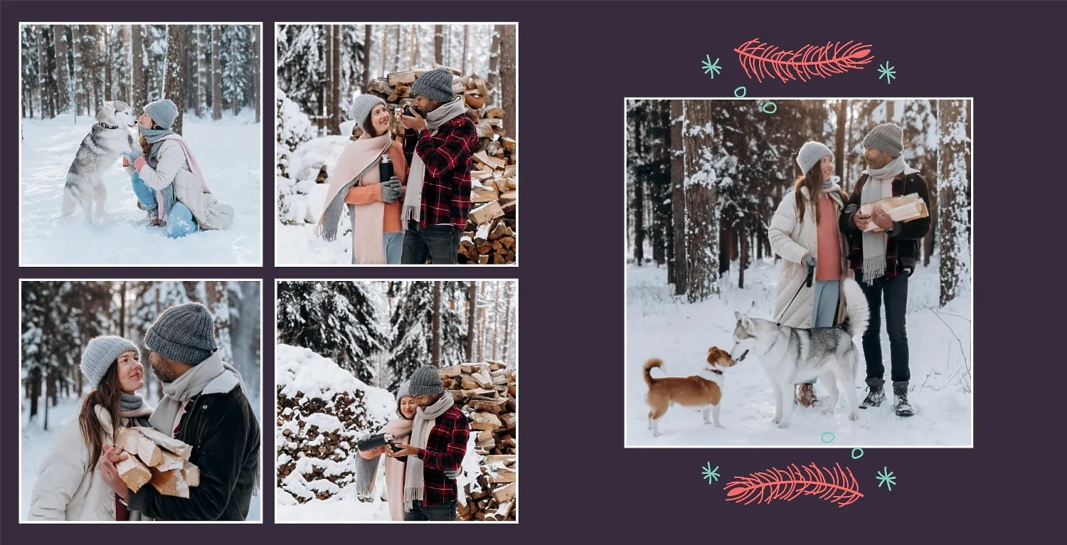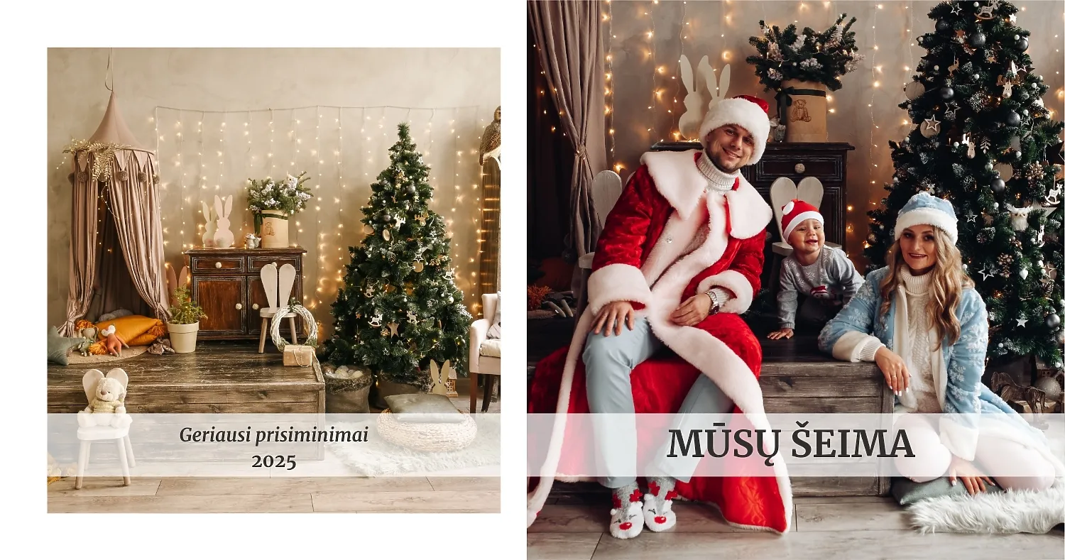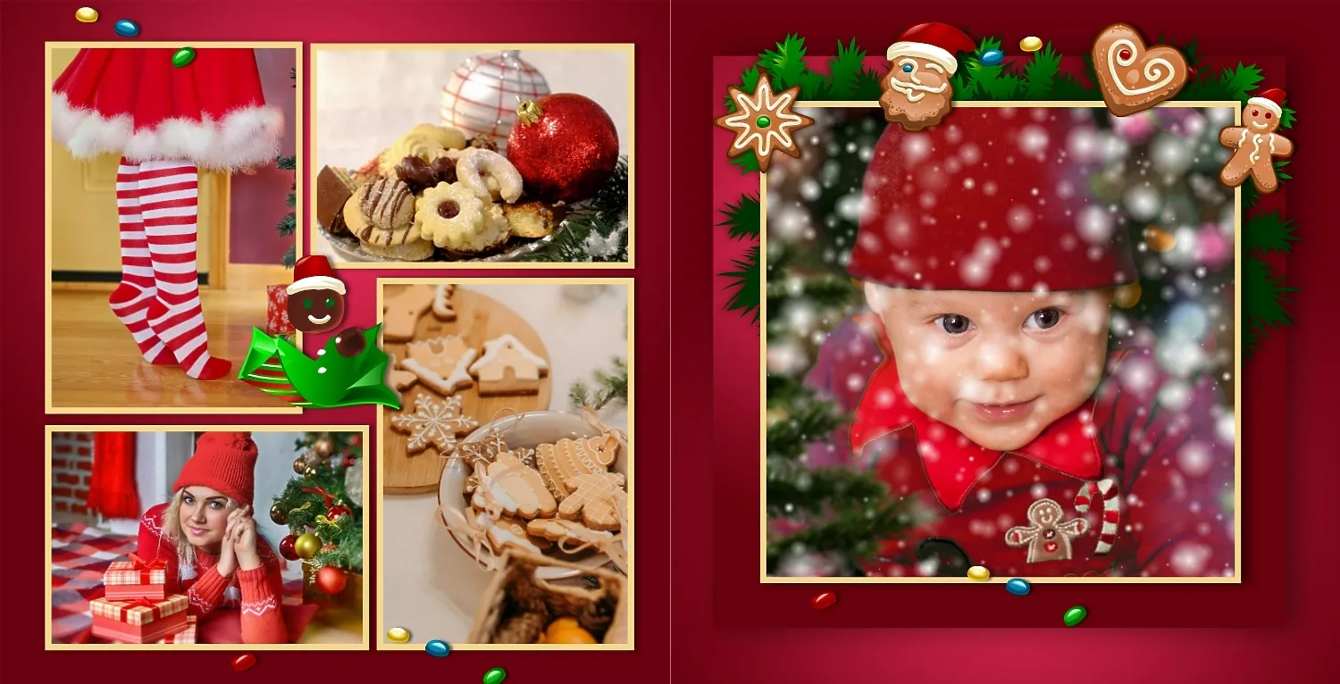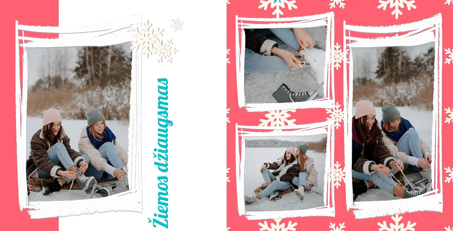 Nemokamas fotoknygos šablonas geriems prisiminimams apie Naujuosius metus, Kalėdas, žiemos šventes su šeima. Sukurkite kvadratinės nuotraukų knygos išdėstymą su savo rankomis internetiniame nuotraukų knygų dizaineryje.
