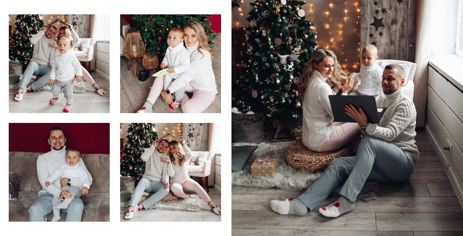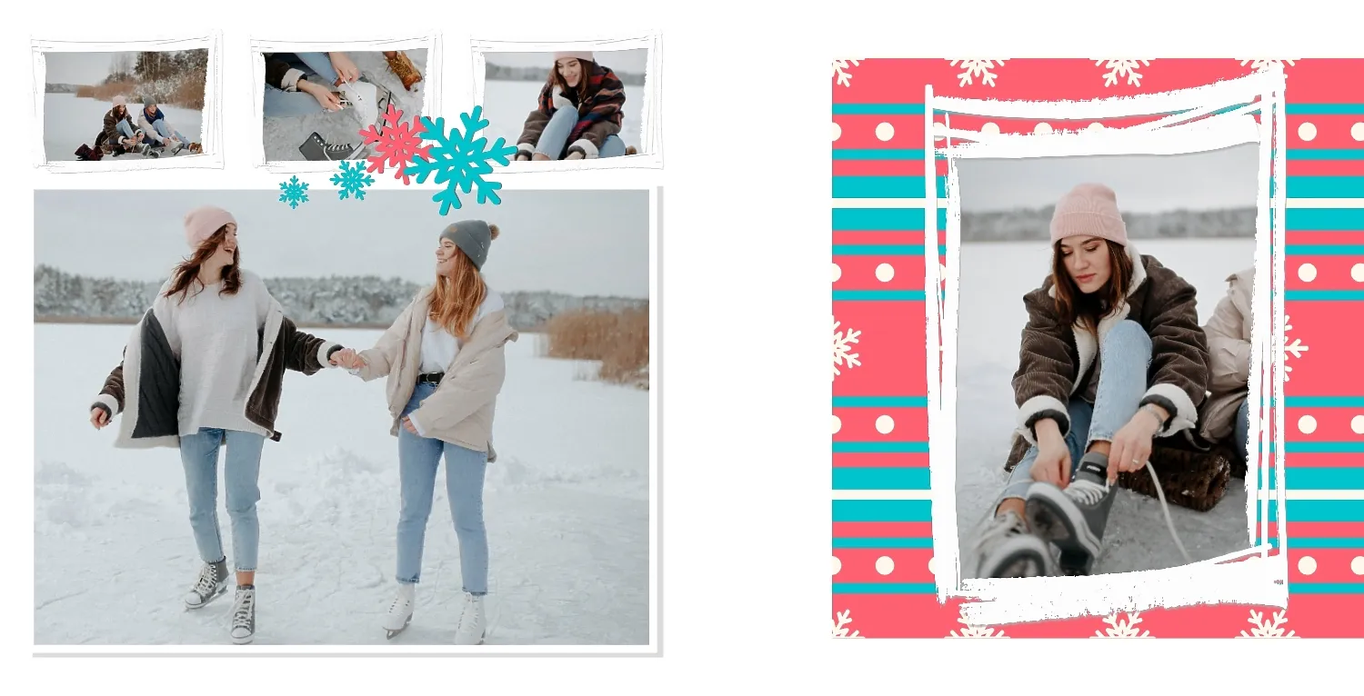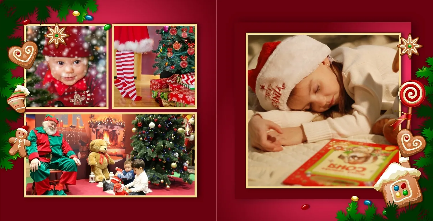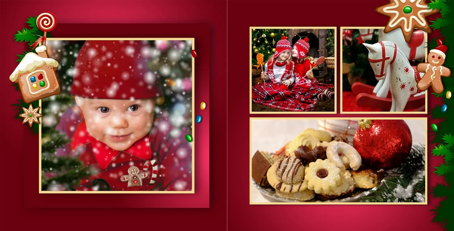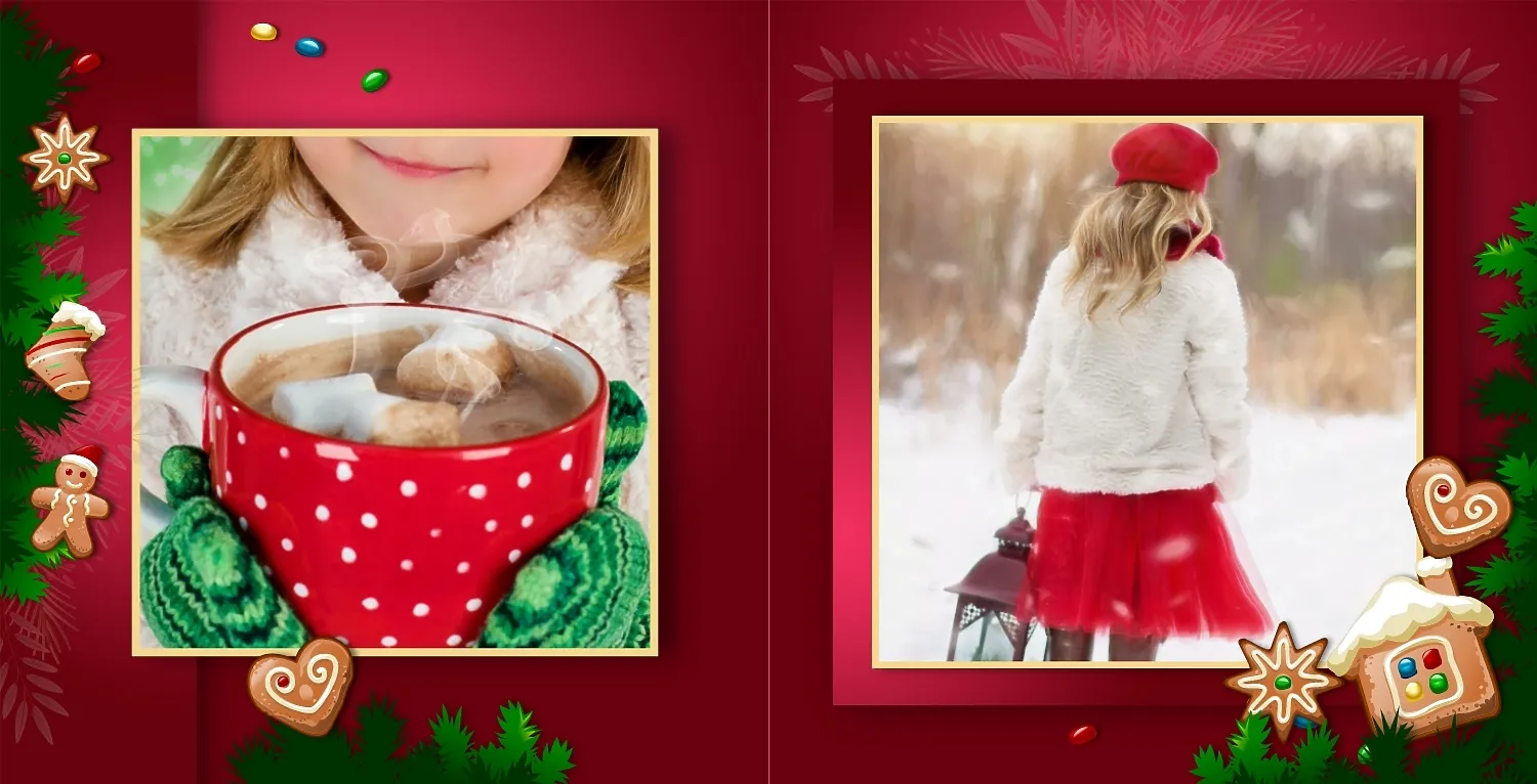 Nemokamas fotoknygos šablonas geriems prisiminimams apie Naujuosius metus, Kalėdas, žiemos šventes su šeima. Sukurkite kvadratinės nuotraukų knygos išdėstymą su savo rankomis internetiniame nuotraukų knygų dizaineryje.