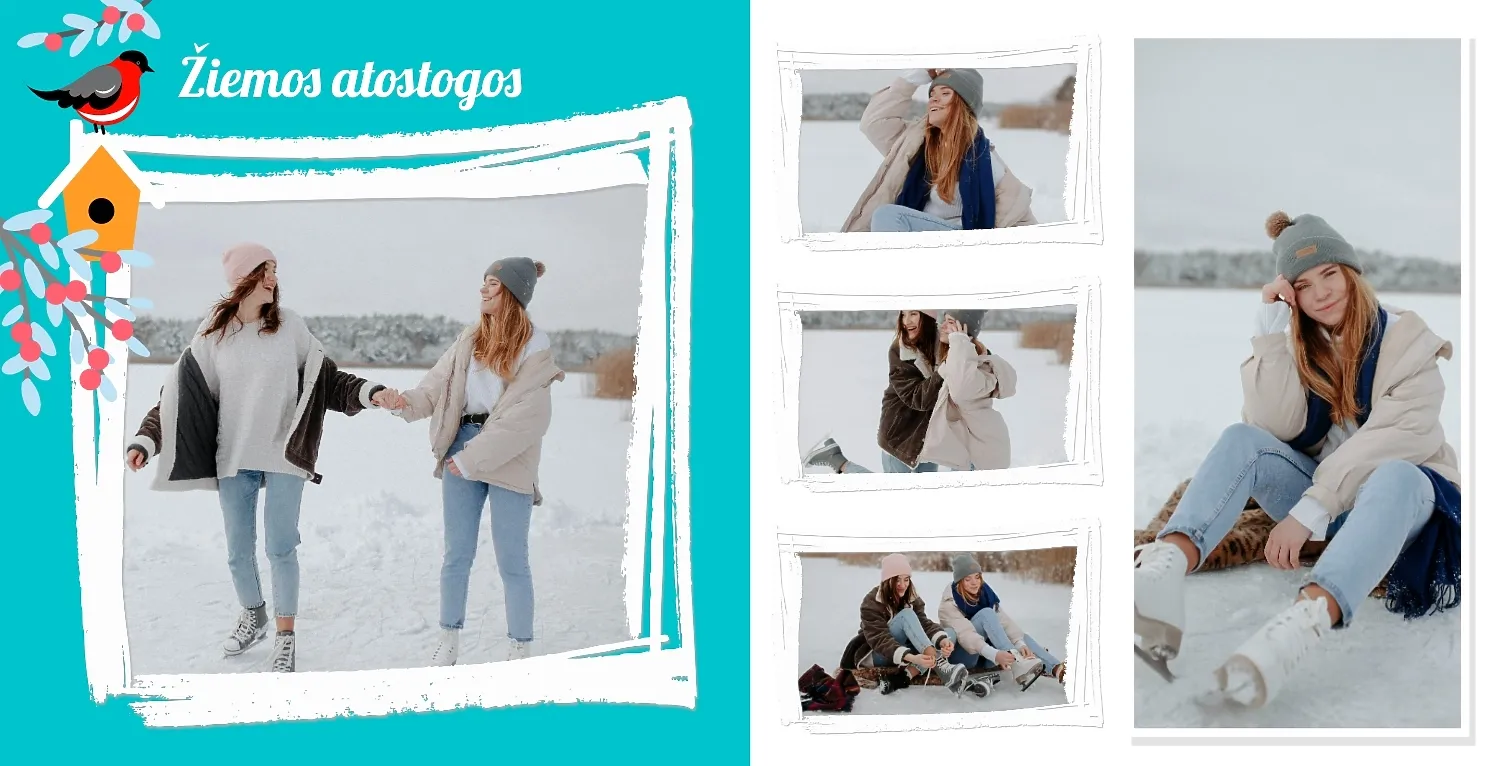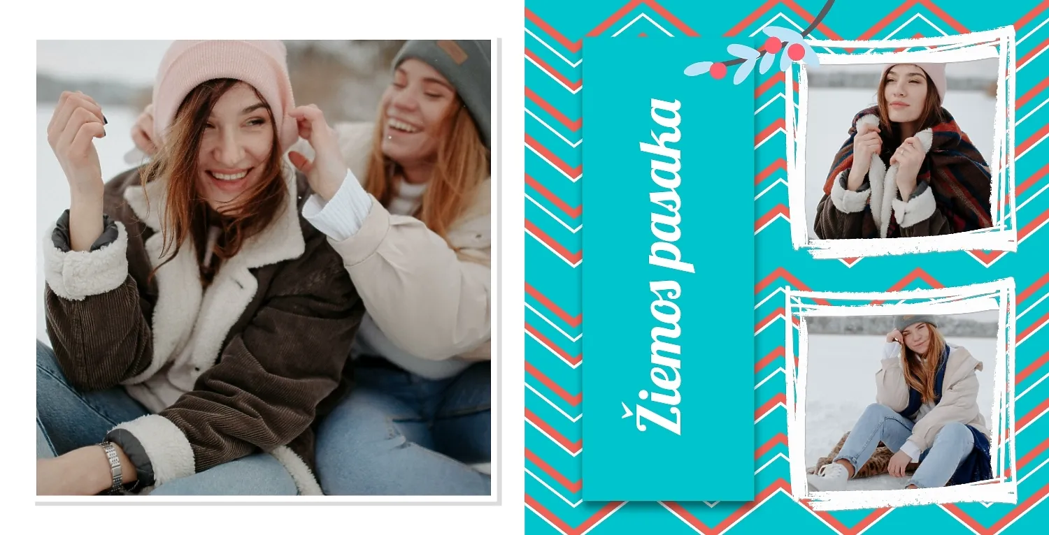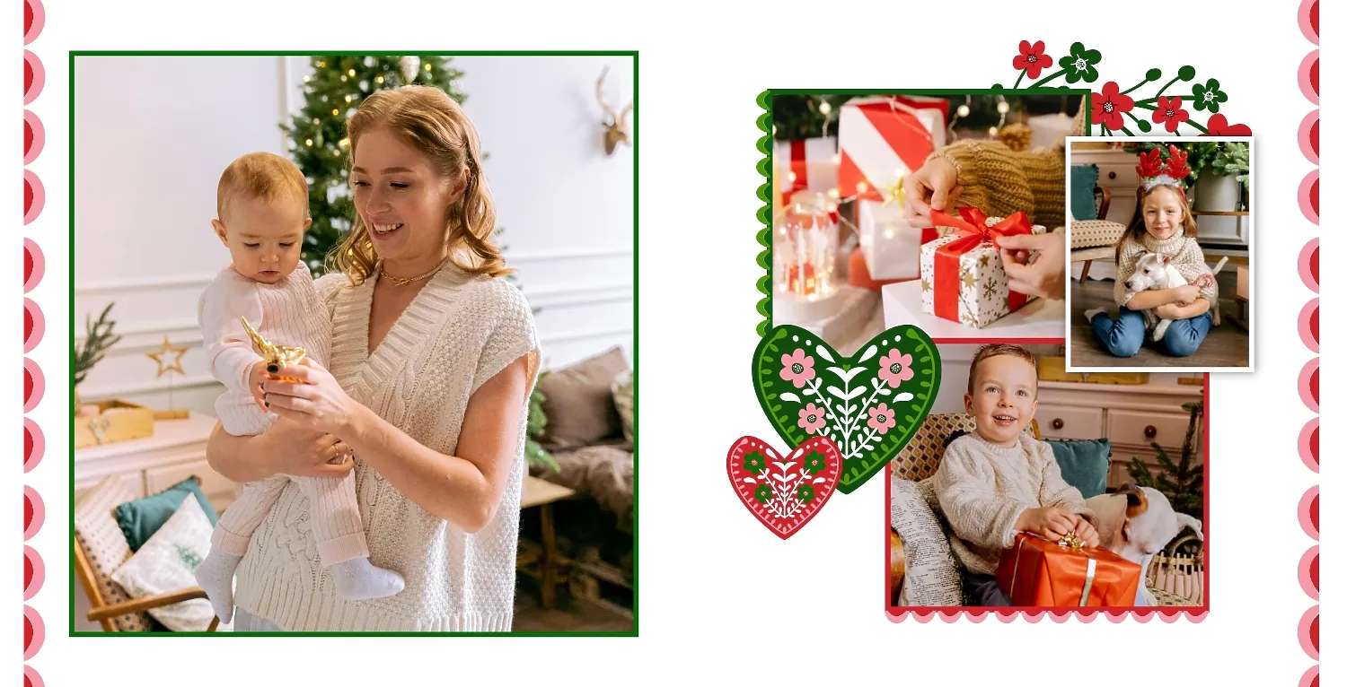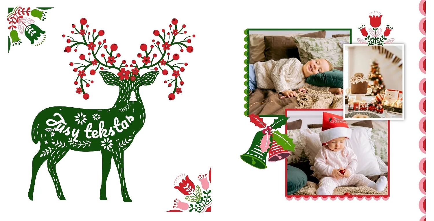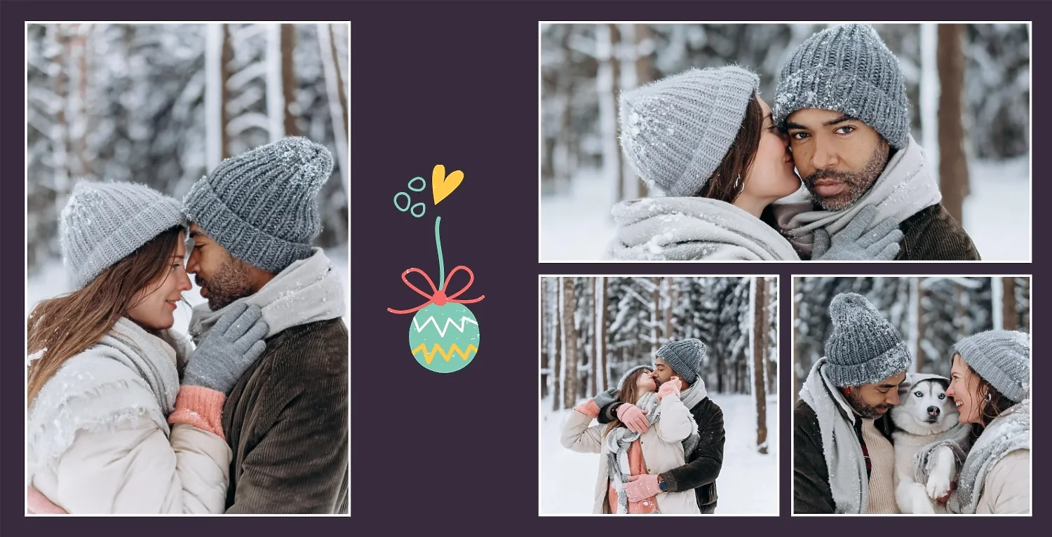 Nemokamas fotoknygos šablonas geriems prisiminimams apie Naujuosius metus, Kalėdas, žiemos šventes su šeima. Sukurkite kvadratinės nuotraukų knygos išdėstymą su savo rankomis internetiniame nuotraukų knygų dizaineryje.
