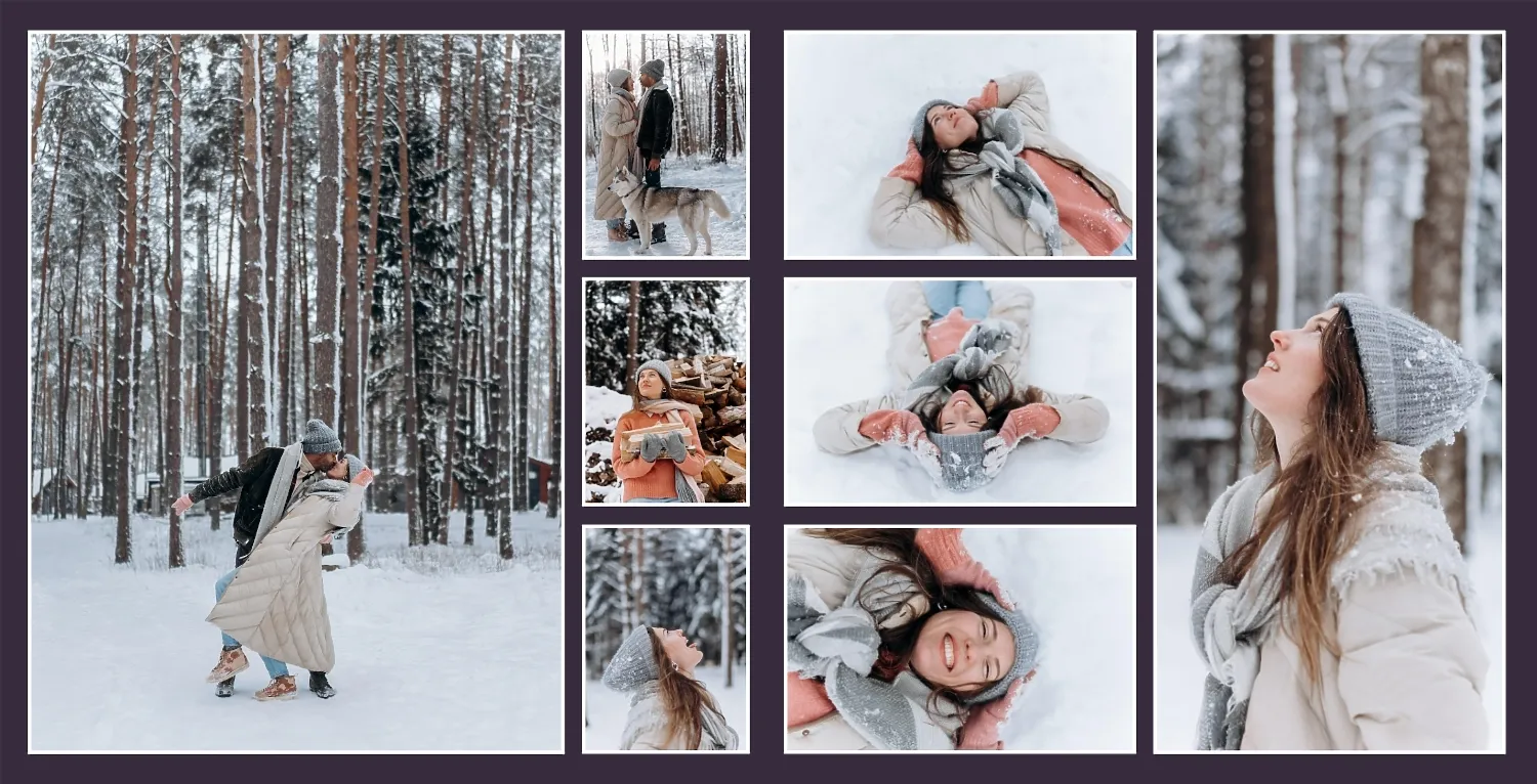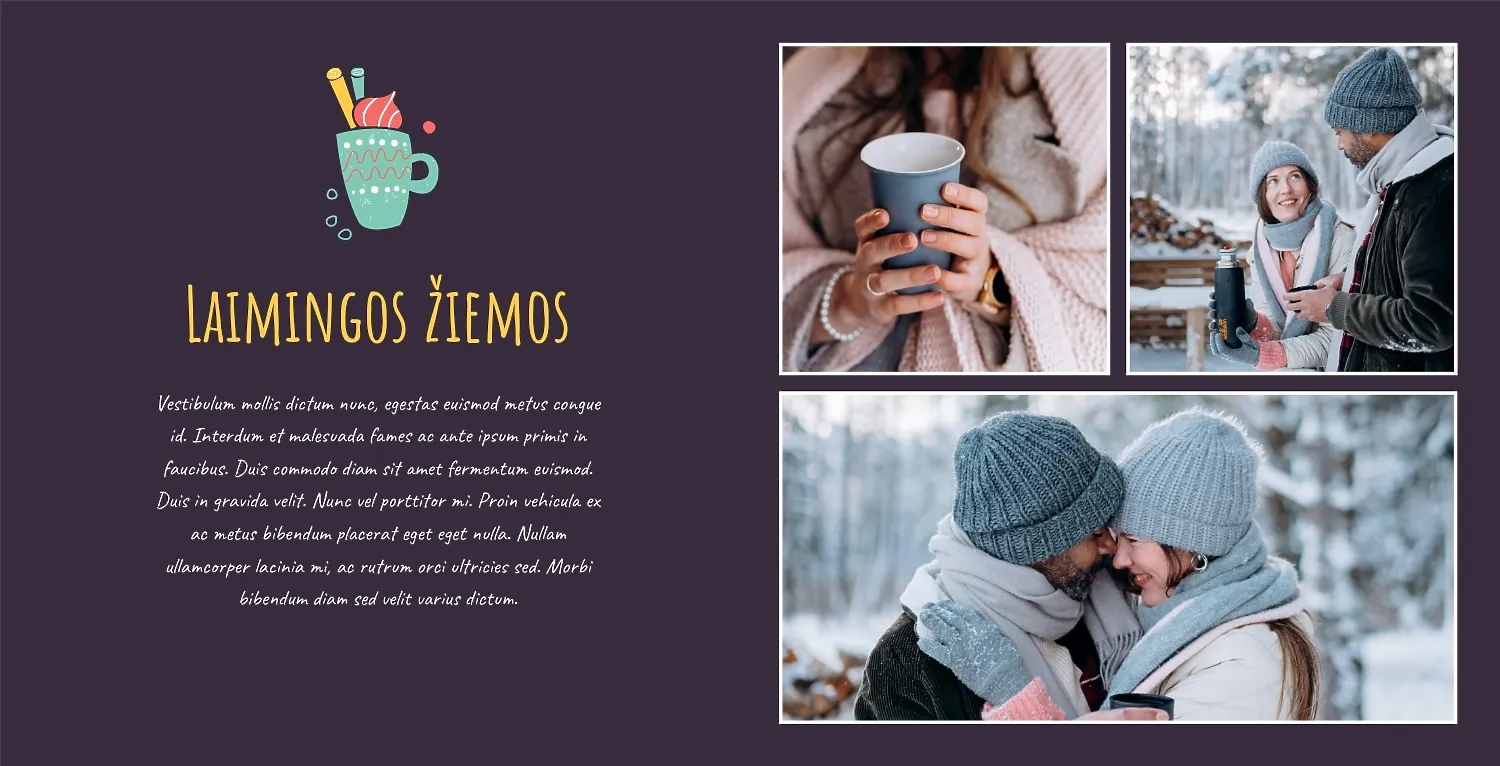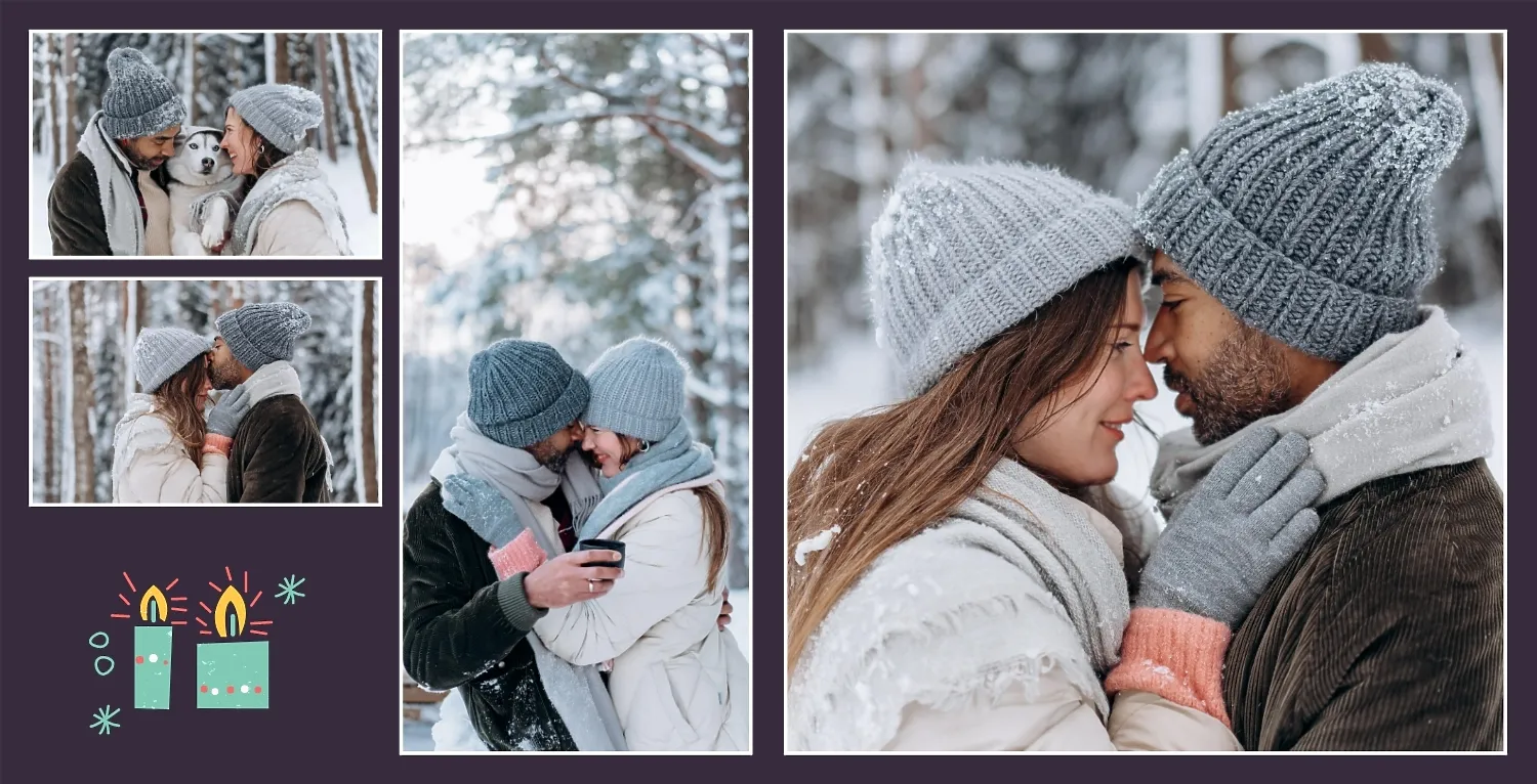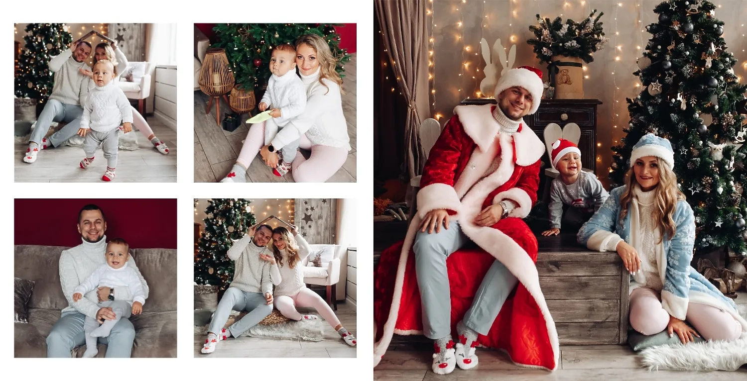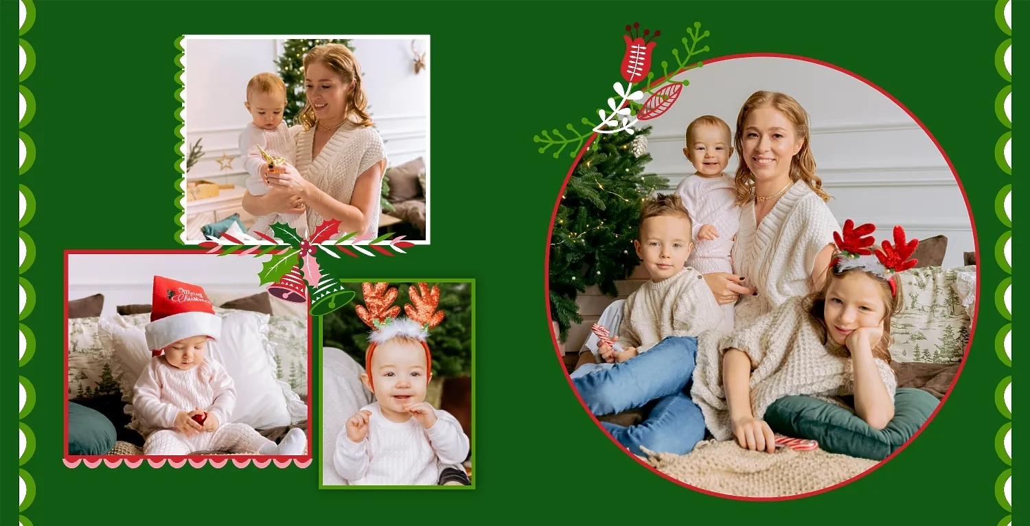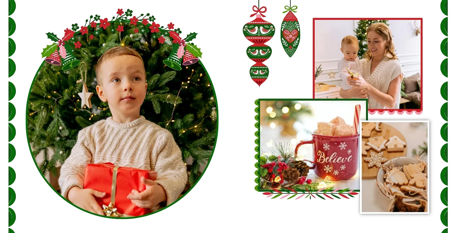 Nemokamas fotoknygos šablonas geriems prisiminimams apie Naujuosius metus, Kalėdas, žiemos šventes su šeima. Sukurkite kvadratinės nuotraukų knygos išdėstymą su savo rankomis internetiniame nuotraukų knygų dizaineryje.