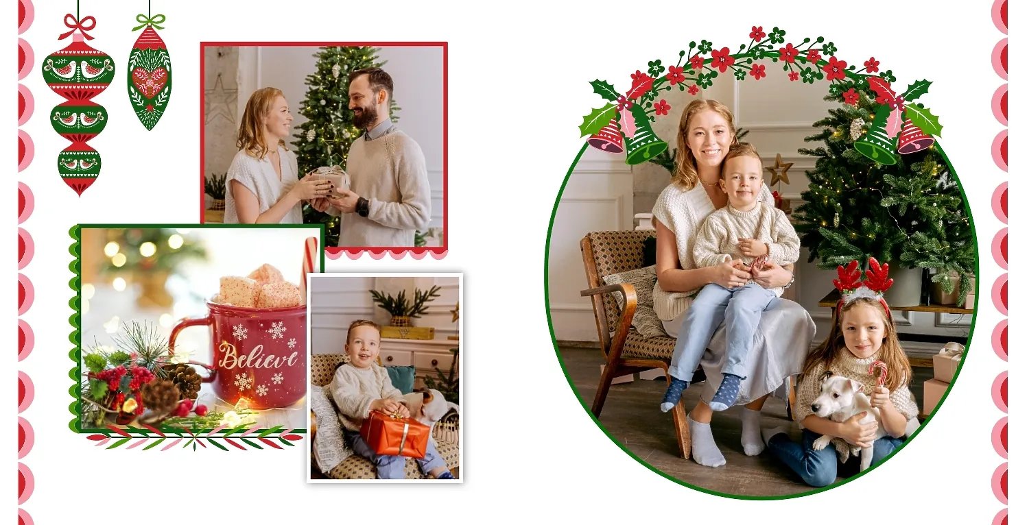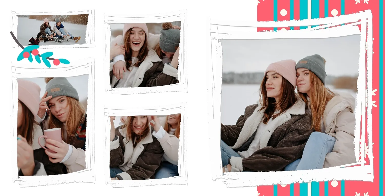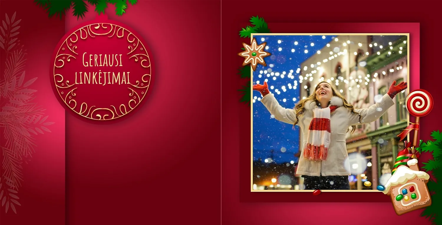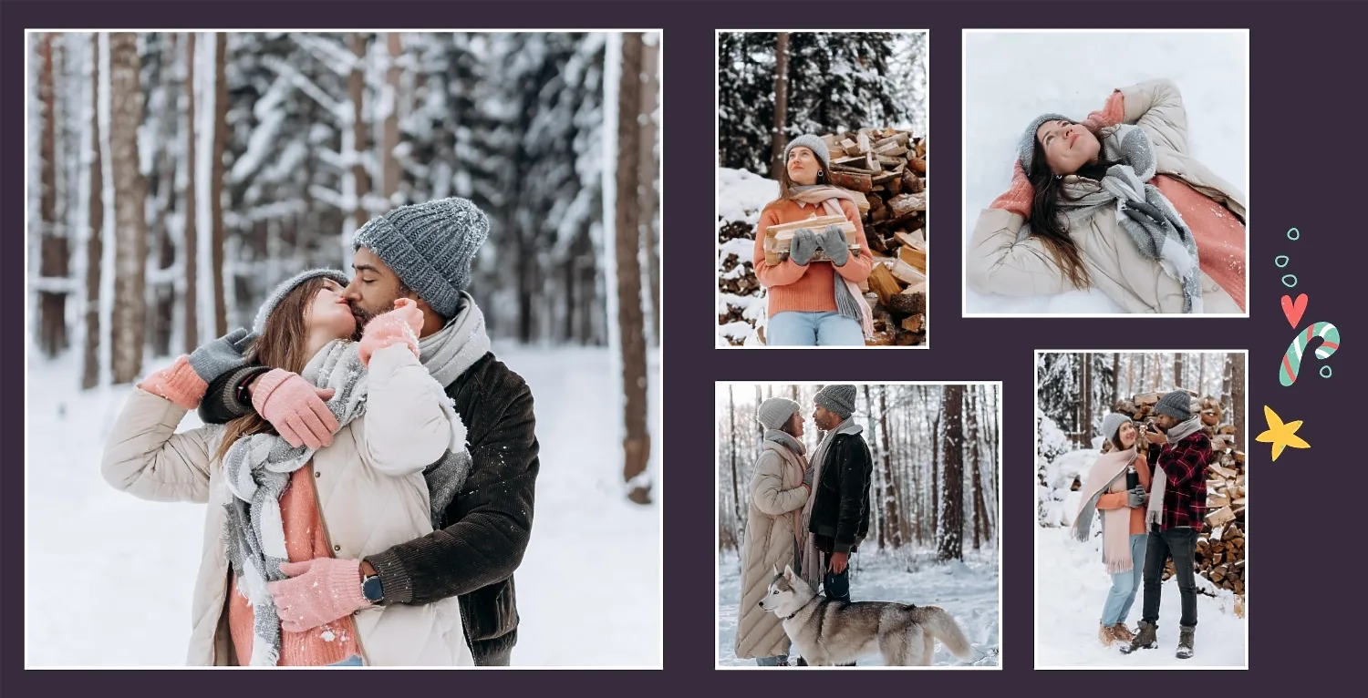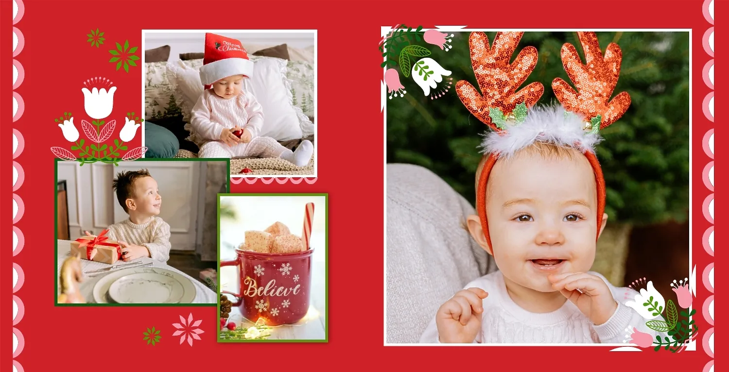 Nemokamas fotoknygos šablonas geriems prisiminimams apie Naujuosius metus, Kalėdas, žiemos šventes su šeima. Sukurkite kvadratinės nuotraukų knygos išdėstymą su savo rankomis internetiniame nuotraukų knygų dizaineryje.