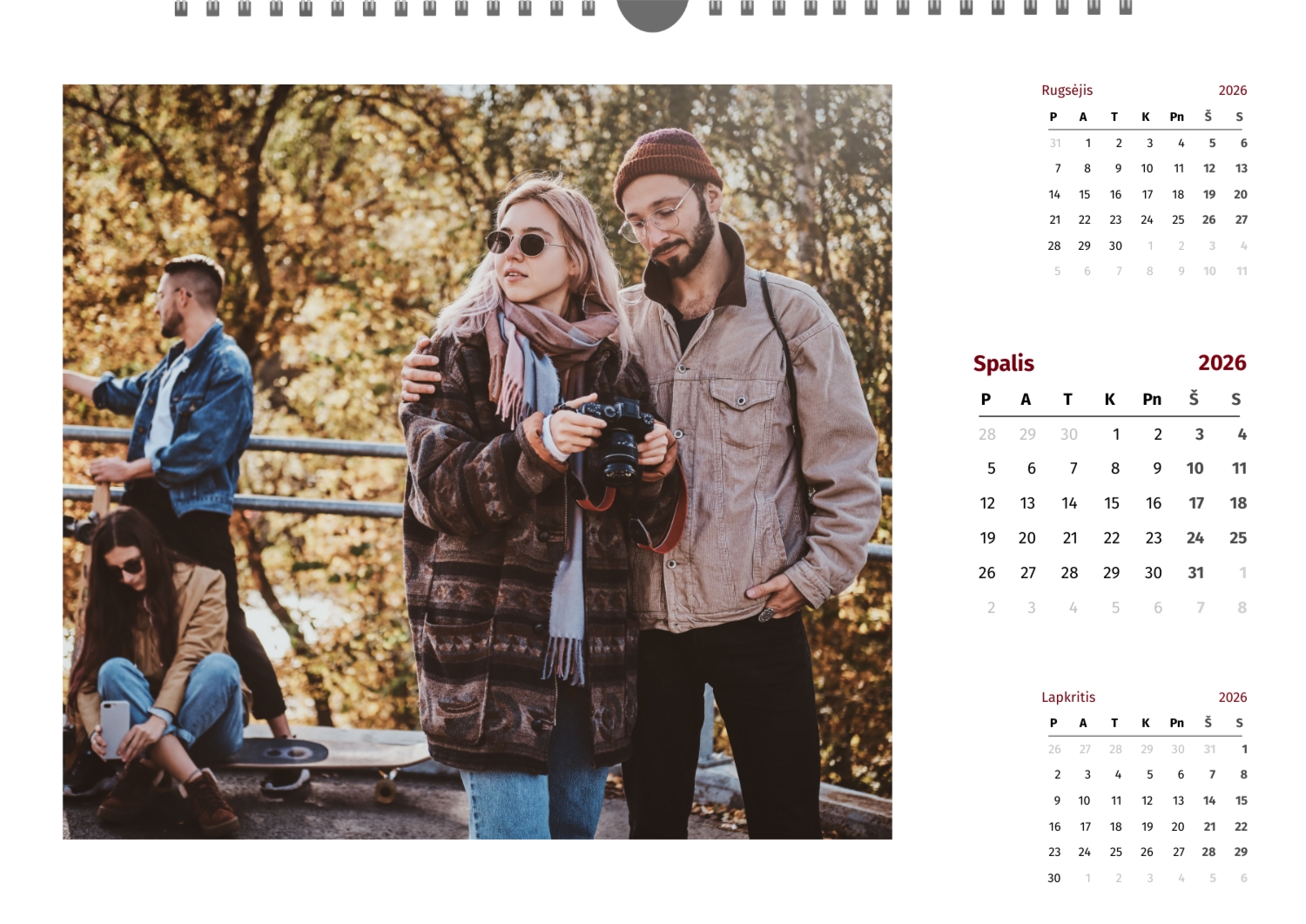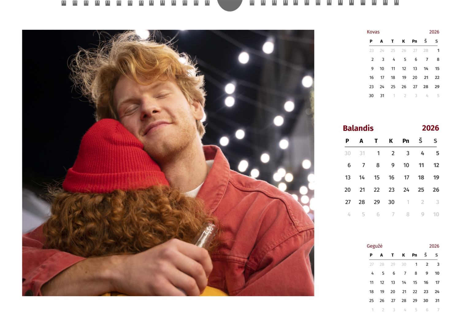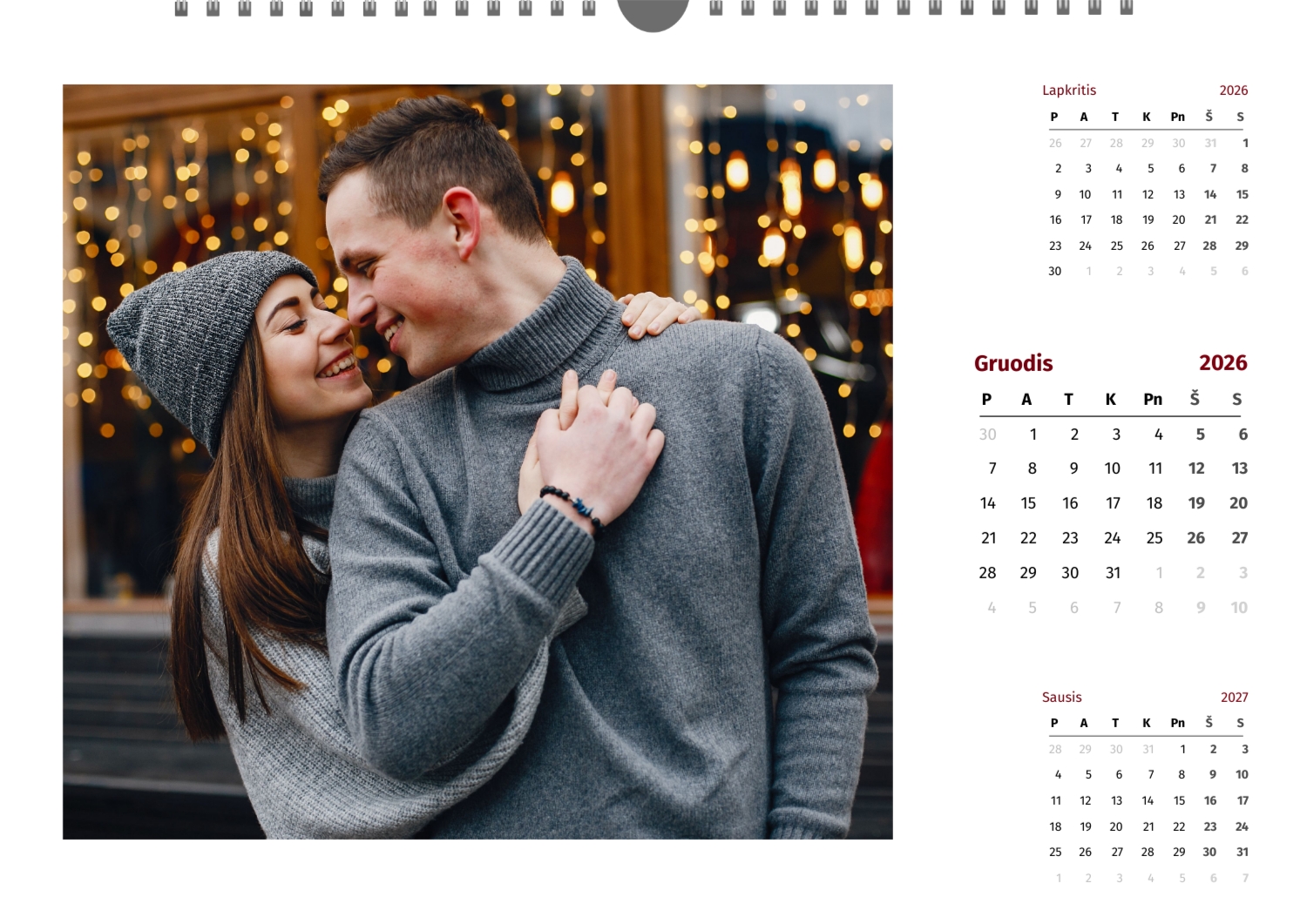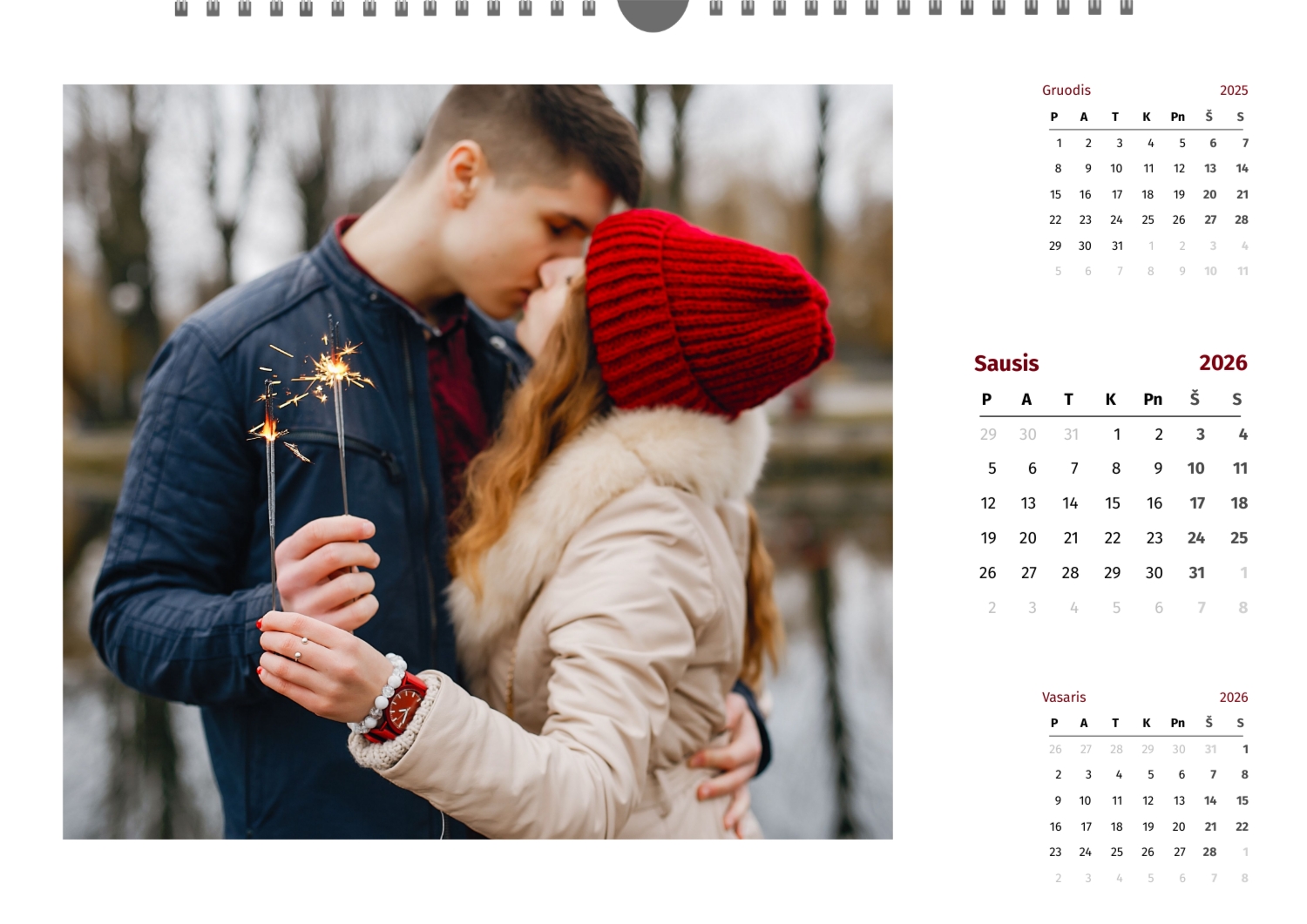 Nemokamas kalendoriaus šablonas su romantiška fotosesija mėgėjams. Sukurkite išdėstymą su savo rankomis internetiniame kalendoriaus dizaineryje.