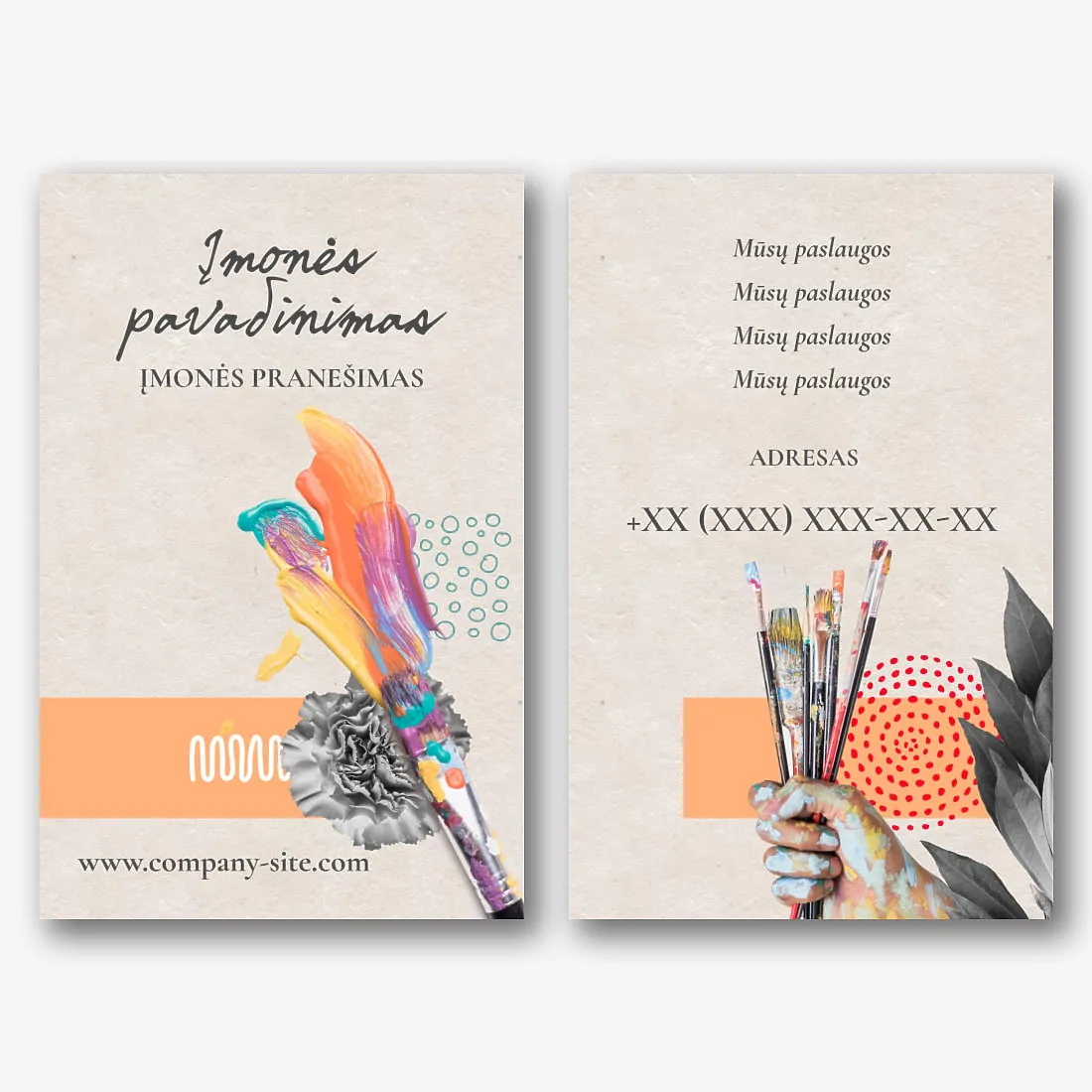 Nemokamas vizitinės kortelės Šablonas meno mokyklai, menininkams, piešimo ir tapybos kursams. Sukurkite išdėstymą su savo rankomis vizitinės kortelės dizaineriu.
