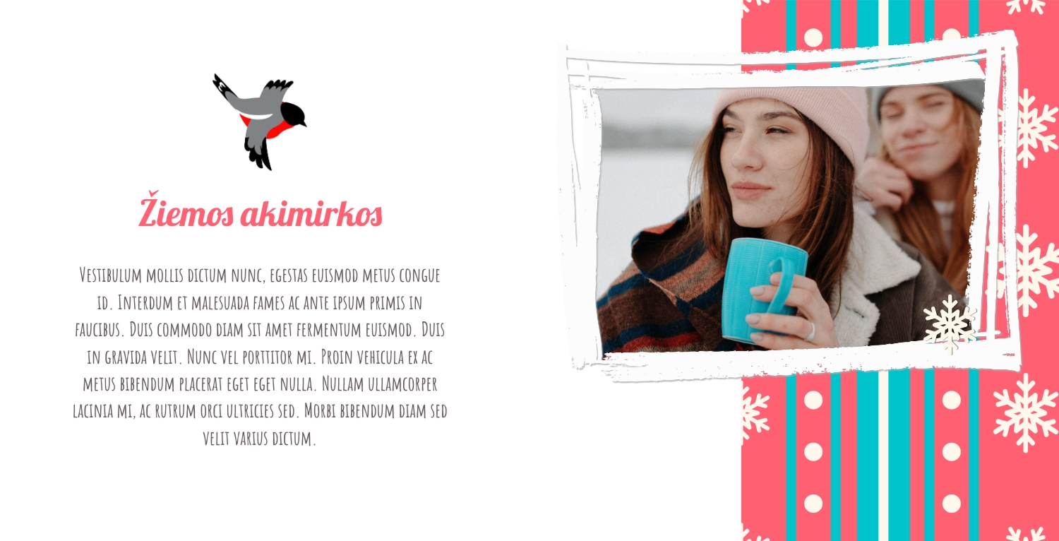 Nemokamas nuotraukų knygos šablonas žiemos atostogų prisiminimams. Sukurkite nuotraukų knygos išdėstymą su savo rankomis internetiniame nuotraukų knygų dizaineryje.