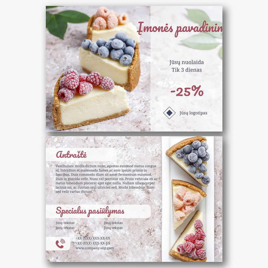 Nemokamas skrajutės šablonas, skirtas konditerijos virėjo, konditerijos parduotuvės, kepimo parduotuvės paslaugoms reklamuoti. Sukurkite lankstinuko išdėstymą su savo rankomis internetiniame lankstinukų dizaineryje.