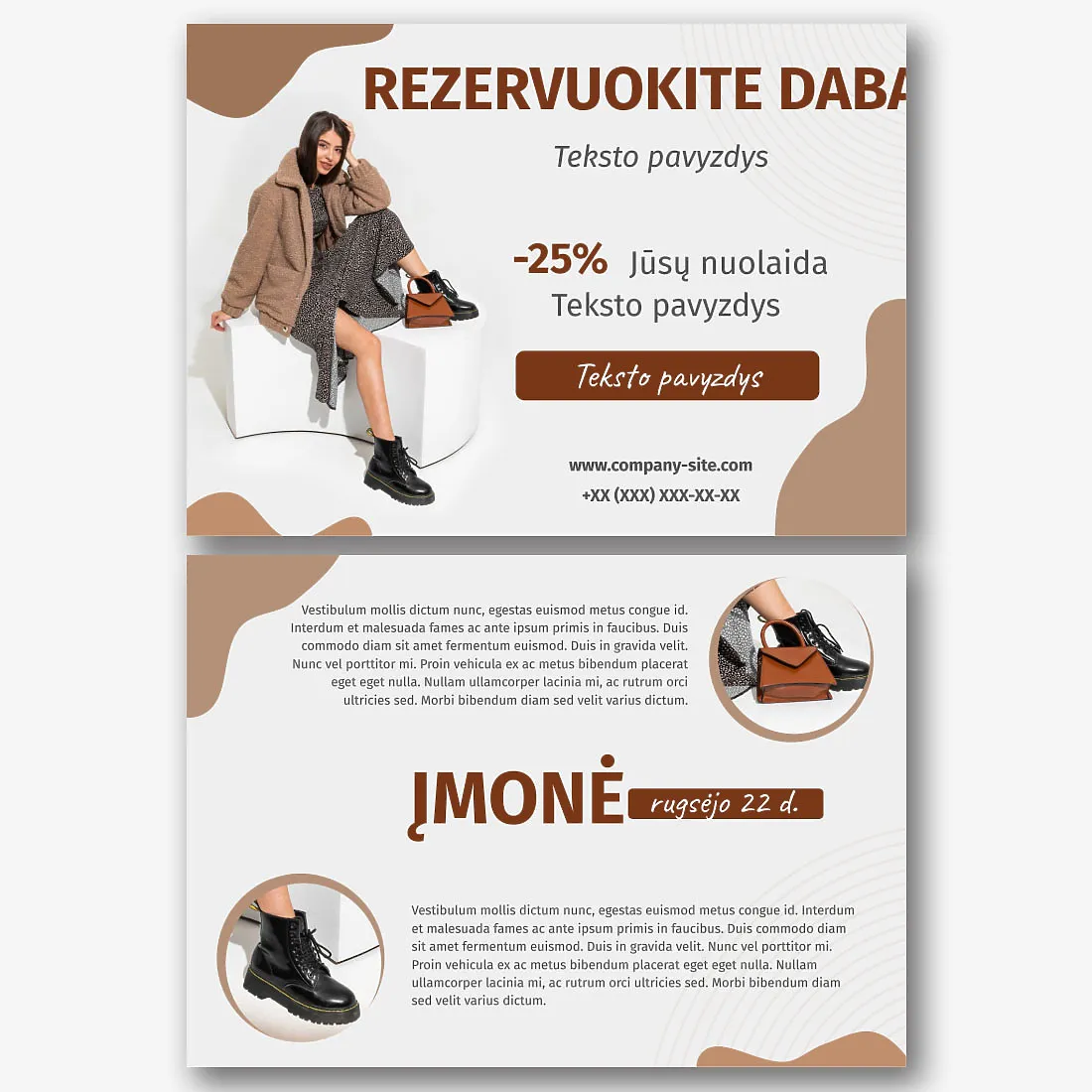 Nemokamas skrajutės šablonas, skirtas reklamuoti drabužių parduotuvę, saloną, moterų internetinę parduotuvę. Sukurkite lankstinuko išdėstymą su savo rankomis internetiniame lankstinukų dizaineryje.