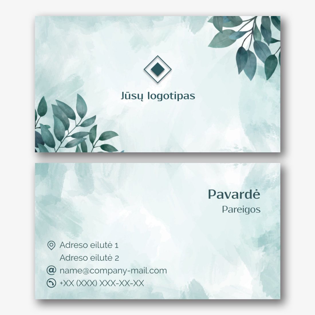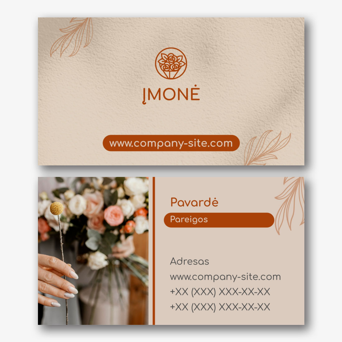 Nemokamas klasikinės vizitinės kortelės modelis fitodizaineriui, floristui ar gėlių pardavėjui. Ryškus ir gražus gėlių puokštė kartu su atogrąžų augalų elementais apibūdina įmonę, kuri užsiima fitodizainu, ir žino, kaip sujungti amžinai žaliuojančius augalus su gėlėmis, sukuriant unikalias kompozicijas. Vizitinės kortelės Šablonas subtiliomis rožinėmis spalvomis-gražus ir unikalus, pabrėžs jūsų individualų stilių ir originalumą.