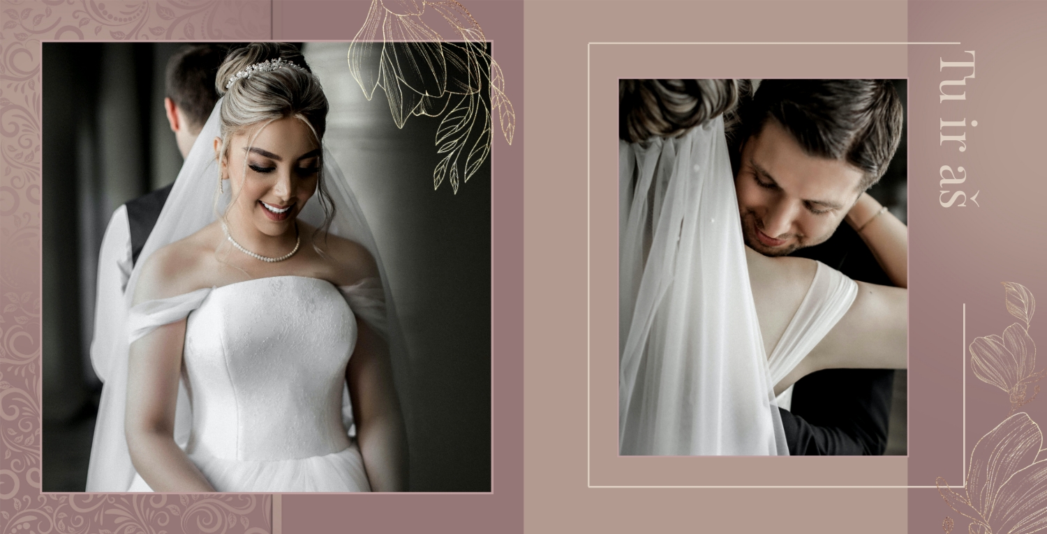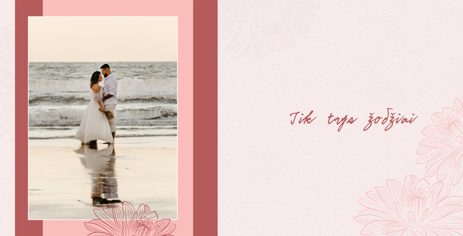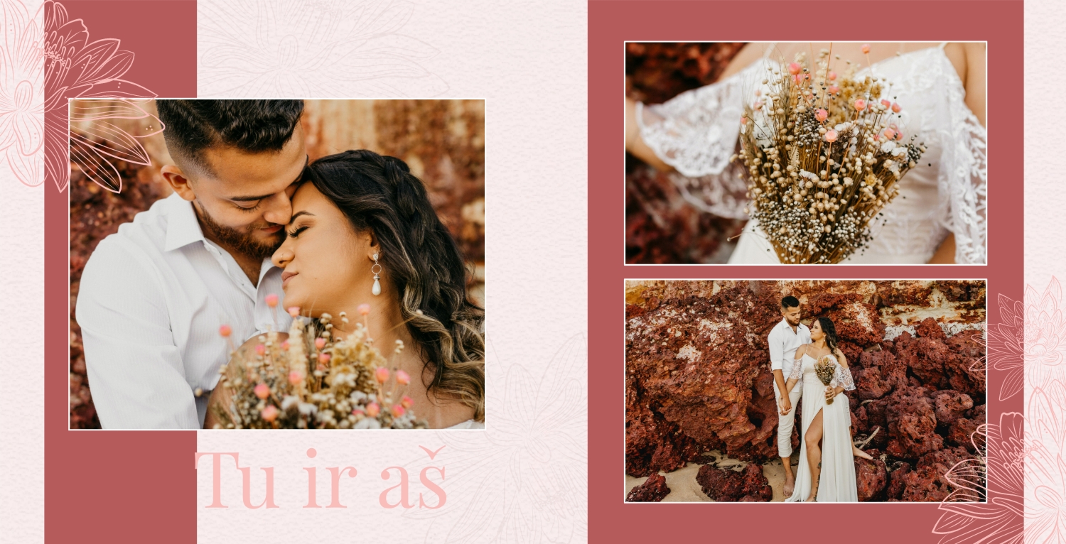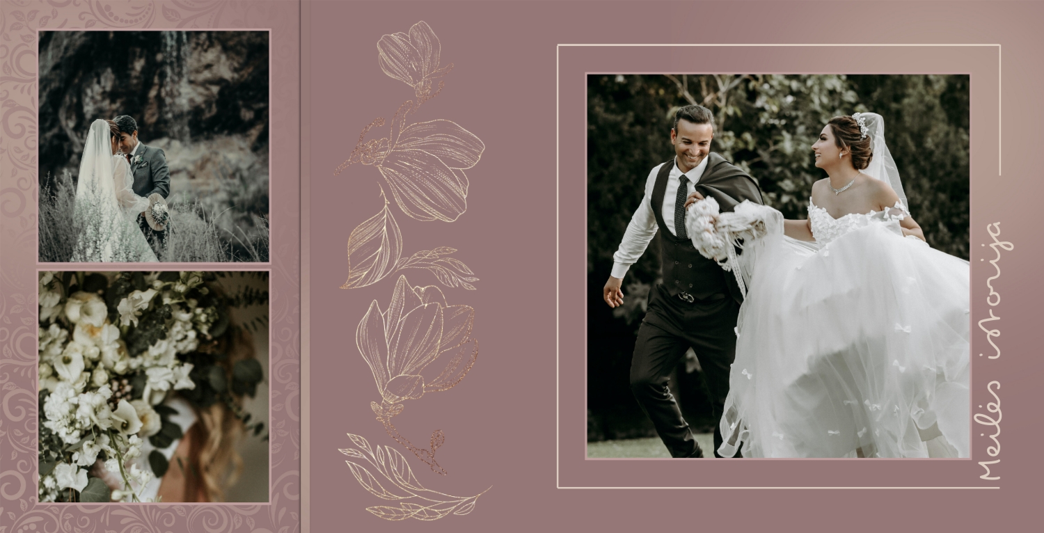 Vestuvių fotografijų fotoknygos šablonas yra paruoštas dizainas, kurį galite naudoti internetiniame dizaineryje, kad sukurtumėte savo unikalų vestuvių nuotraukų albumą. Šis šablonas suteikia pagrindą jūsų albumui apipavidalinti, įskaitant nuotraukų talpinimą, šriftų stilių pasirinkimą, elementų paskirstymą ir bendros estetikos kūrimą. Šablonas apima įvairius nuotraukų išdėstymo maketus. Galite pridėti parašus nuotraukoms, vestuvių akimirkų aprašymams ar pasakojimui apie tai, kaip susipažinote ir įsimylėjote. Naudodami tokį kvadratinį fotoknygos šabloną kietame viršelyje, galite lengvai sukurti savo unikalų vestuvių albumą. Tiesiog įkelkite savo nuotraukas, įklijuokite tekstą ir pritaikykite dizainą pagal savo pageidavimus. Internetinis dizaineris turi platų įrankių pasirinkimą, kad jūsų fotoknyga taptų tikrai ypatinga ir įsimintina.
