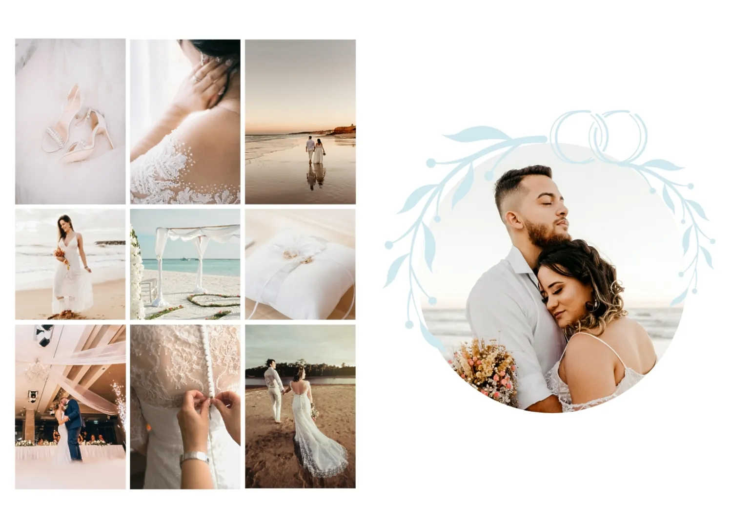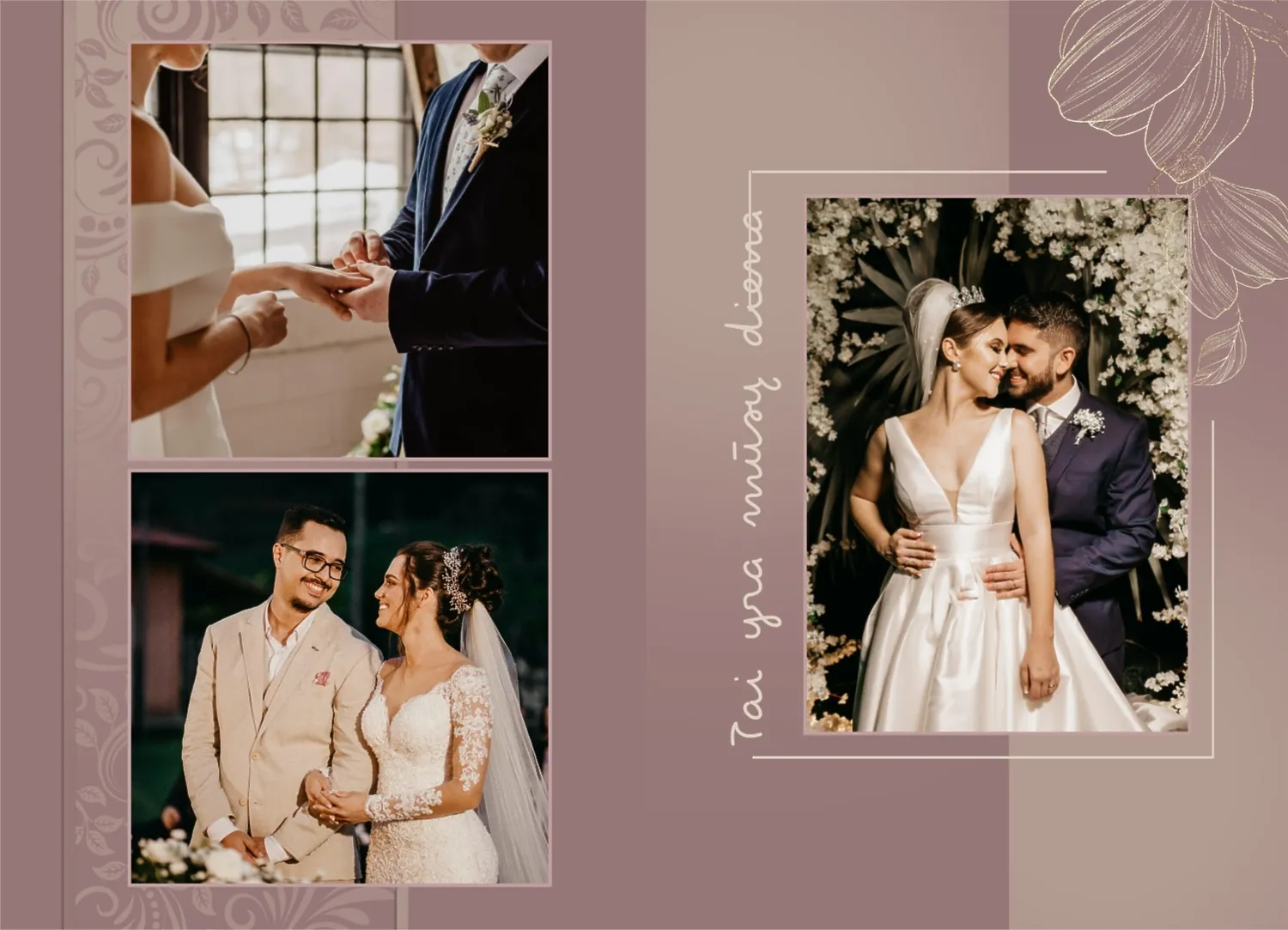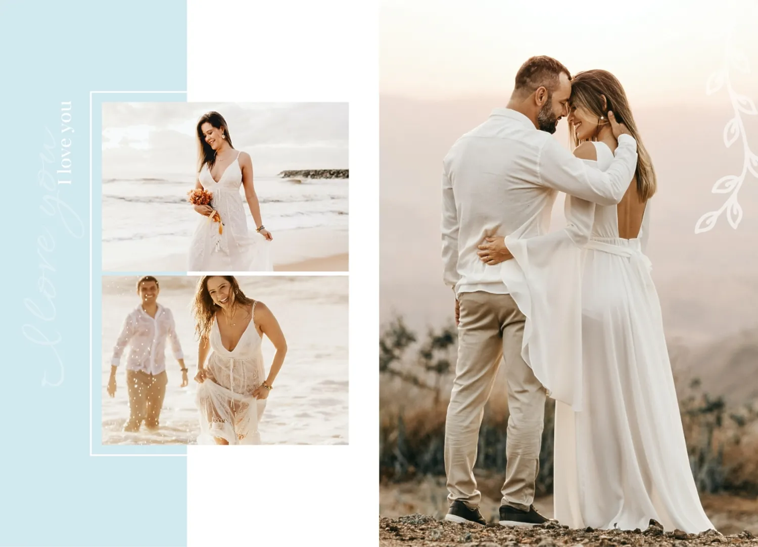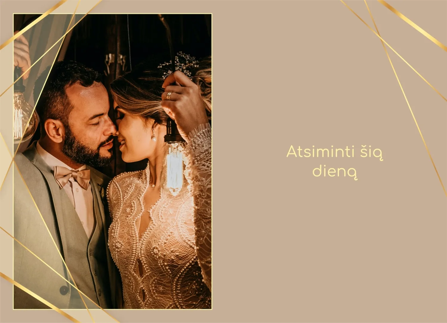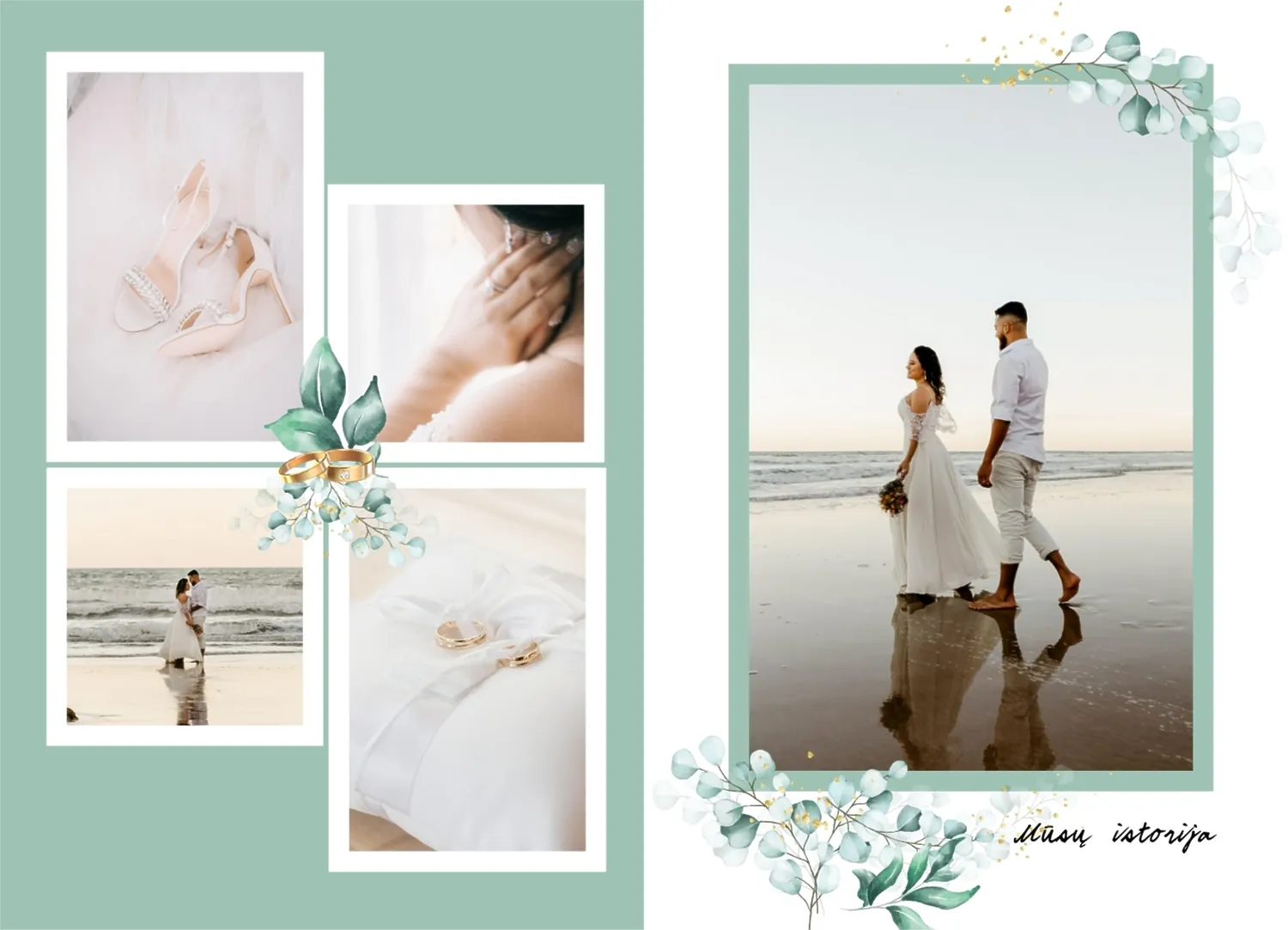 Vestuvių fotografijų fotoknygos šablonas yra paruoštas dizainas, kurį galite naudoti internetiniame dizaineryje, kad sukurtumėte savo unikalų vestuvių nuotraukų albumą. Šis šablonas suteikia pagrindą jūsų albumui apipavidalinti, įskaitant nuotraukų talpinimą, šriftų stilių pasirinkimą, elementų paskirstymą ir bendros estetikos kūrimą. Šablonas apima įvairius nuotraukų išdėstymo maketus. Galite pridėti parašus į nuotraukas, vestuvių momentų aprašymus. Naudodami šį šabloną galite lengvai sukurti savo unikalią vestuvių fotoknygą kietu viršeliu. Tiesiog įkelkite savo nuotraukas, įklijuokite tekstą ir pritaikykite dizainą pagal savo pageidavimus. Internetinis dizaineris turi platų šablonų ir įrankių pasirinkimą, kad jūsų fotoknyga taptų tikrai ypatinga ir įsimintina.