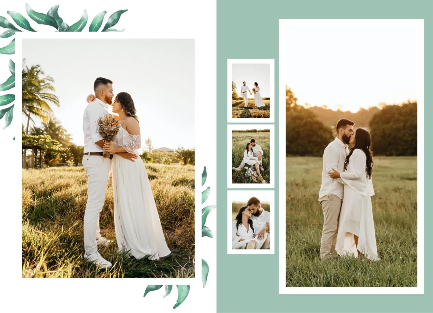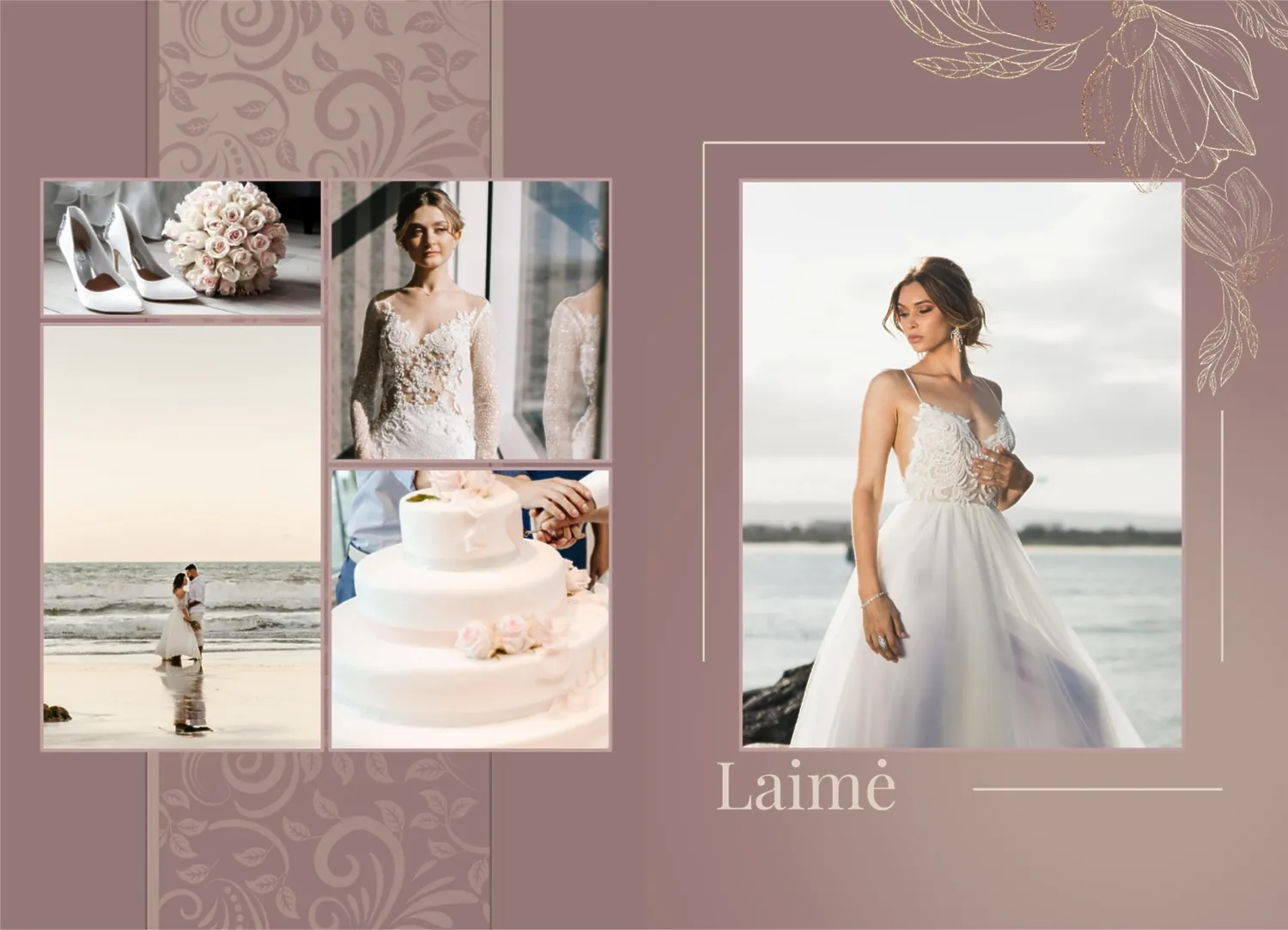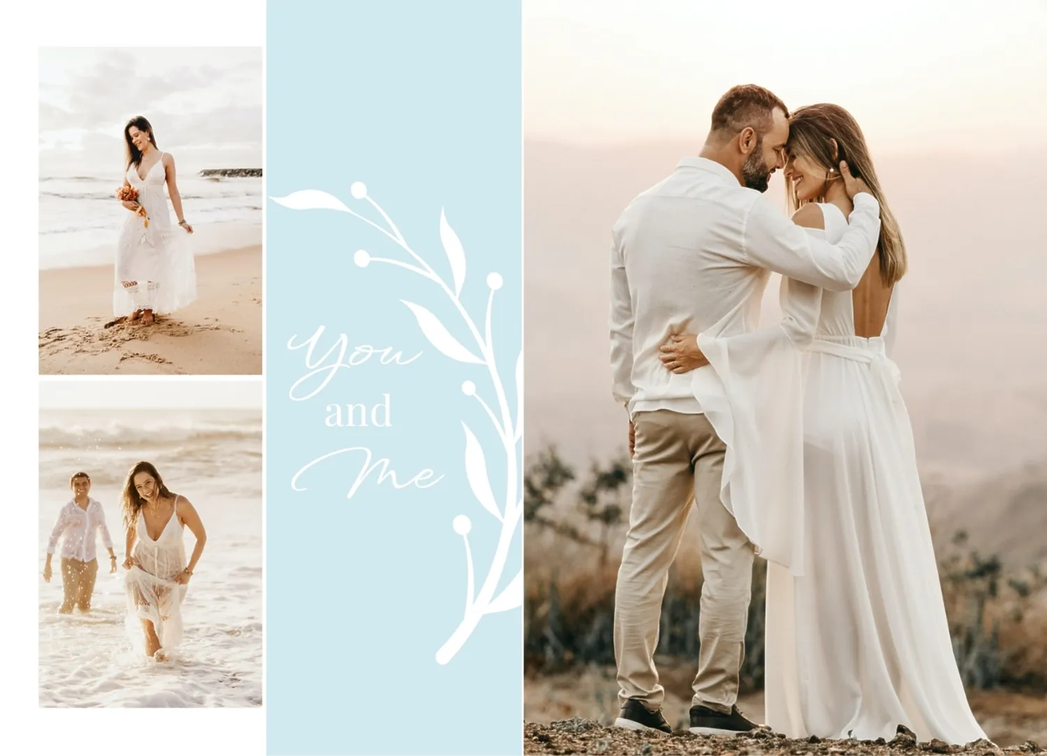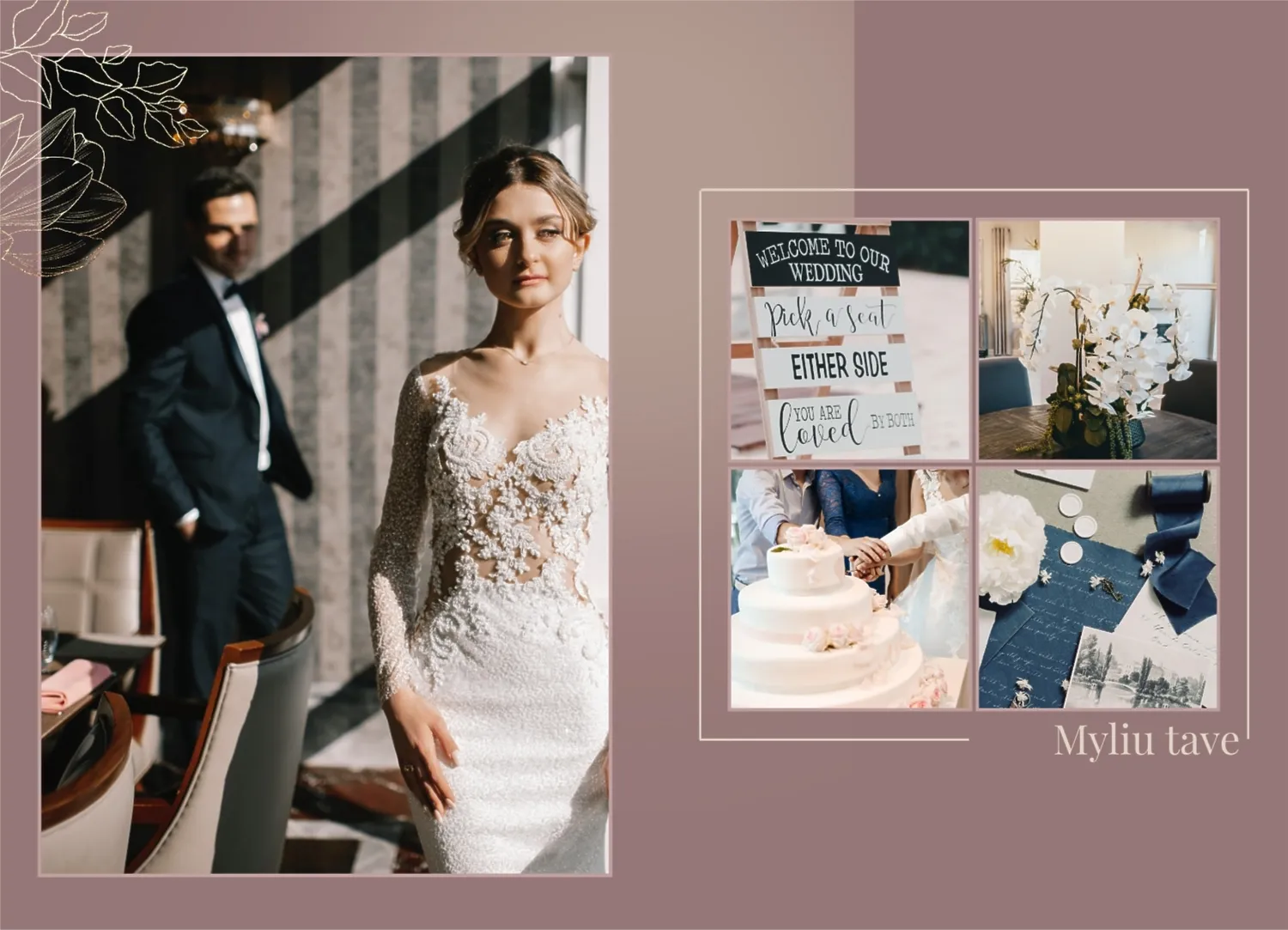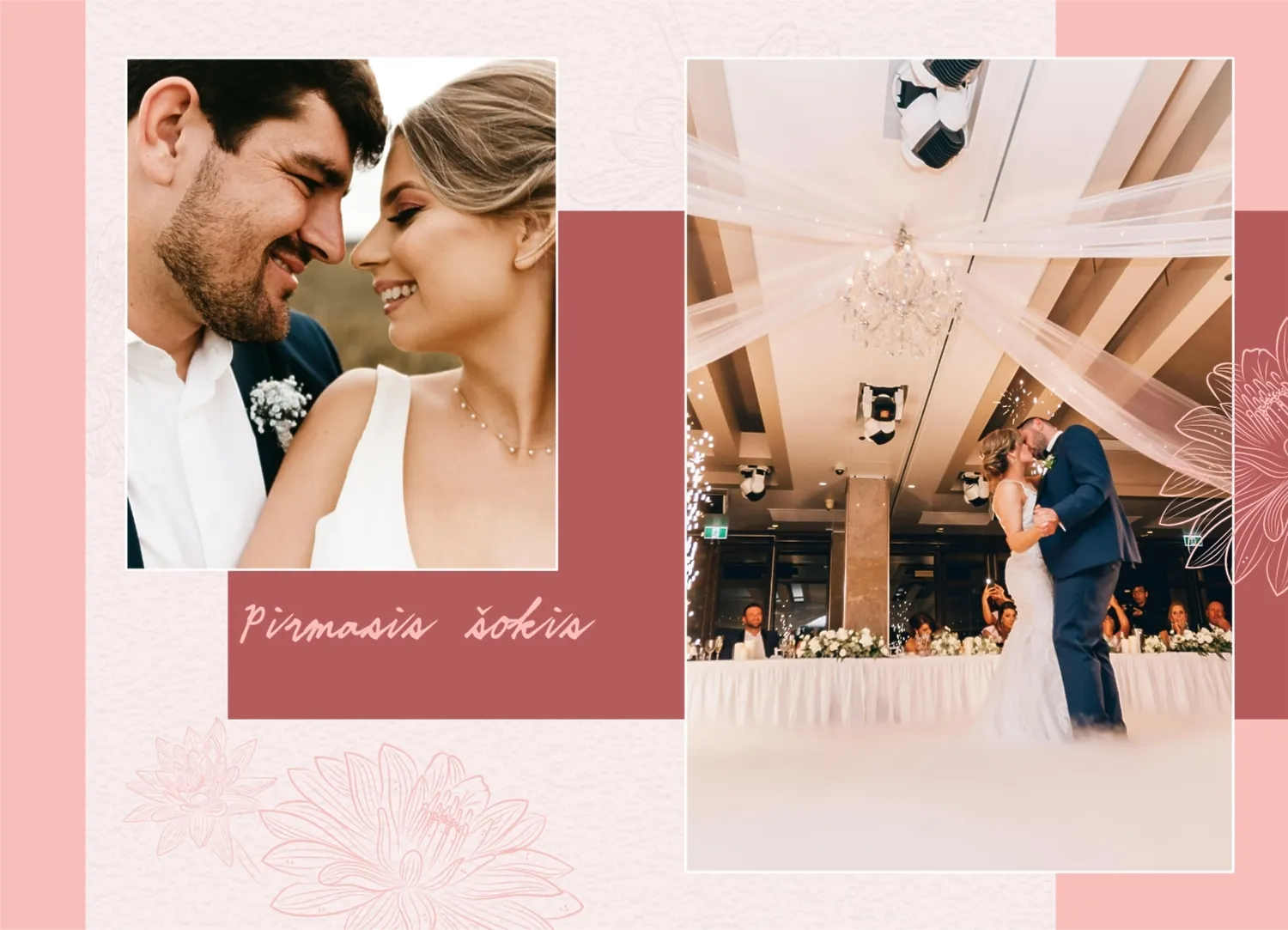 Vestuvių fotografijų fotoknygos šablonas yra paruoštas dizainas, kurį galite naudoti internetiniame dizaineryje, kad sukurtumėte savo unikalų vestuvių nuotraukų albumą. Šis šablonas suteikia pagrindą jūsų albumui apipavidalinti, įskaitant nuotraukų talpinimą, šriftų stilių pasirinkimą, elementų paskirstymą ir bendros estetikos kūrimą. Šablonas apima įvairius nuotraukų išdėstymo maketus. Galite pridėti parašus į nuotraukas, vestuvių momentų aprašymus. Naudodami šį šabloną galite lengvai sukurti savo unikalią vestuvių fotoknygą kietu viršeliu. Tiesiog įkelkite savo nuotraukas, įklijuokite tekstą ir pritaikykite dizainą pagal savo pageidavimus. Internetinis dizaineris turi platų šablonų ir įrankių pasirinkimą, kad jūsų fotoknyga taptų tikrai ypatinga ir įsimintina.