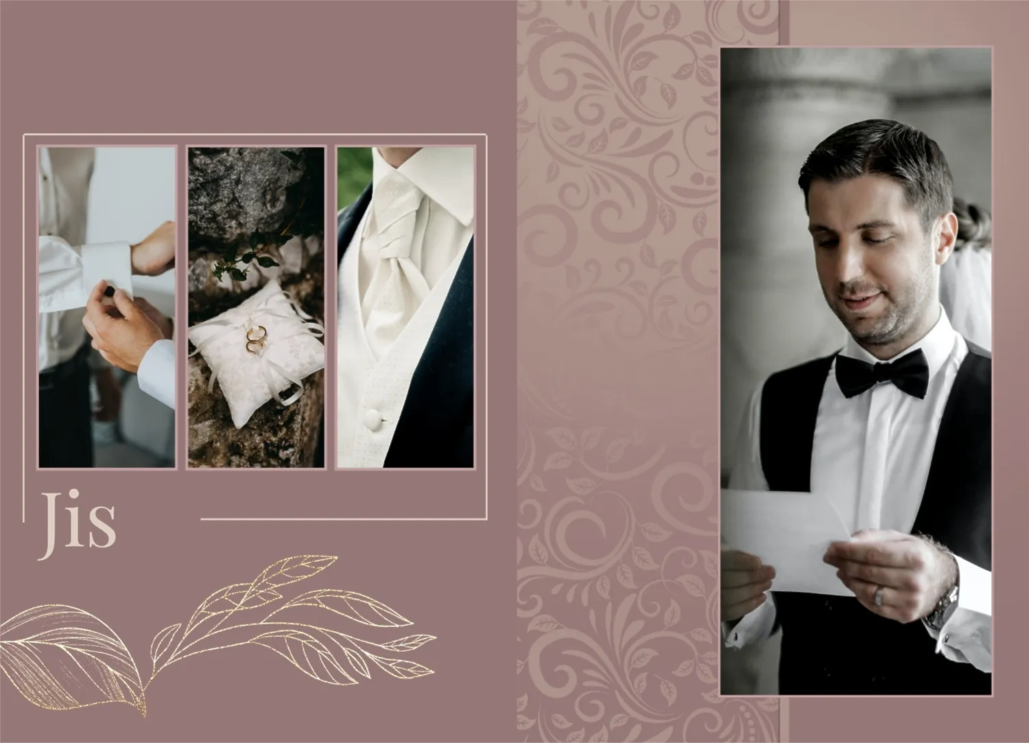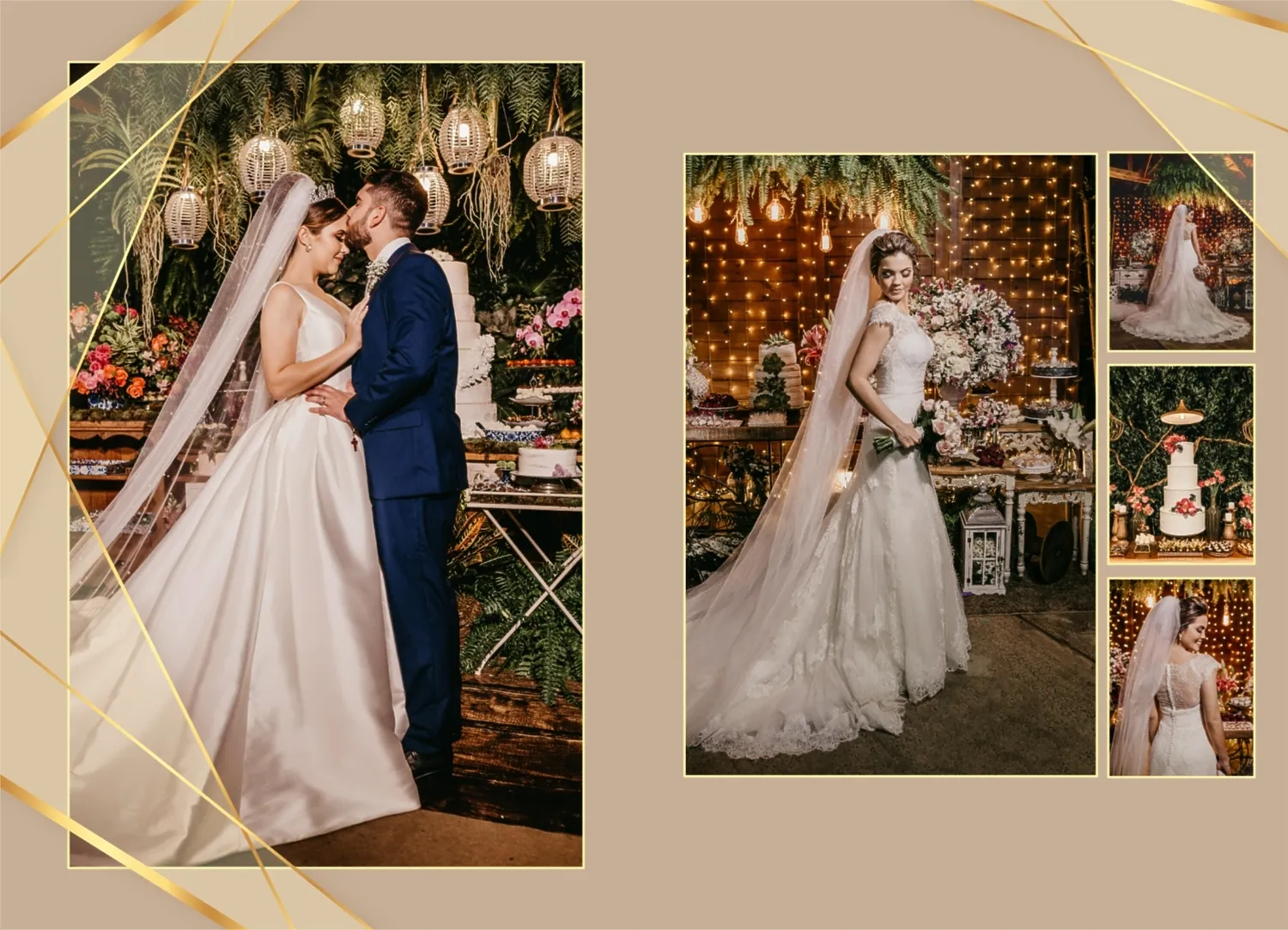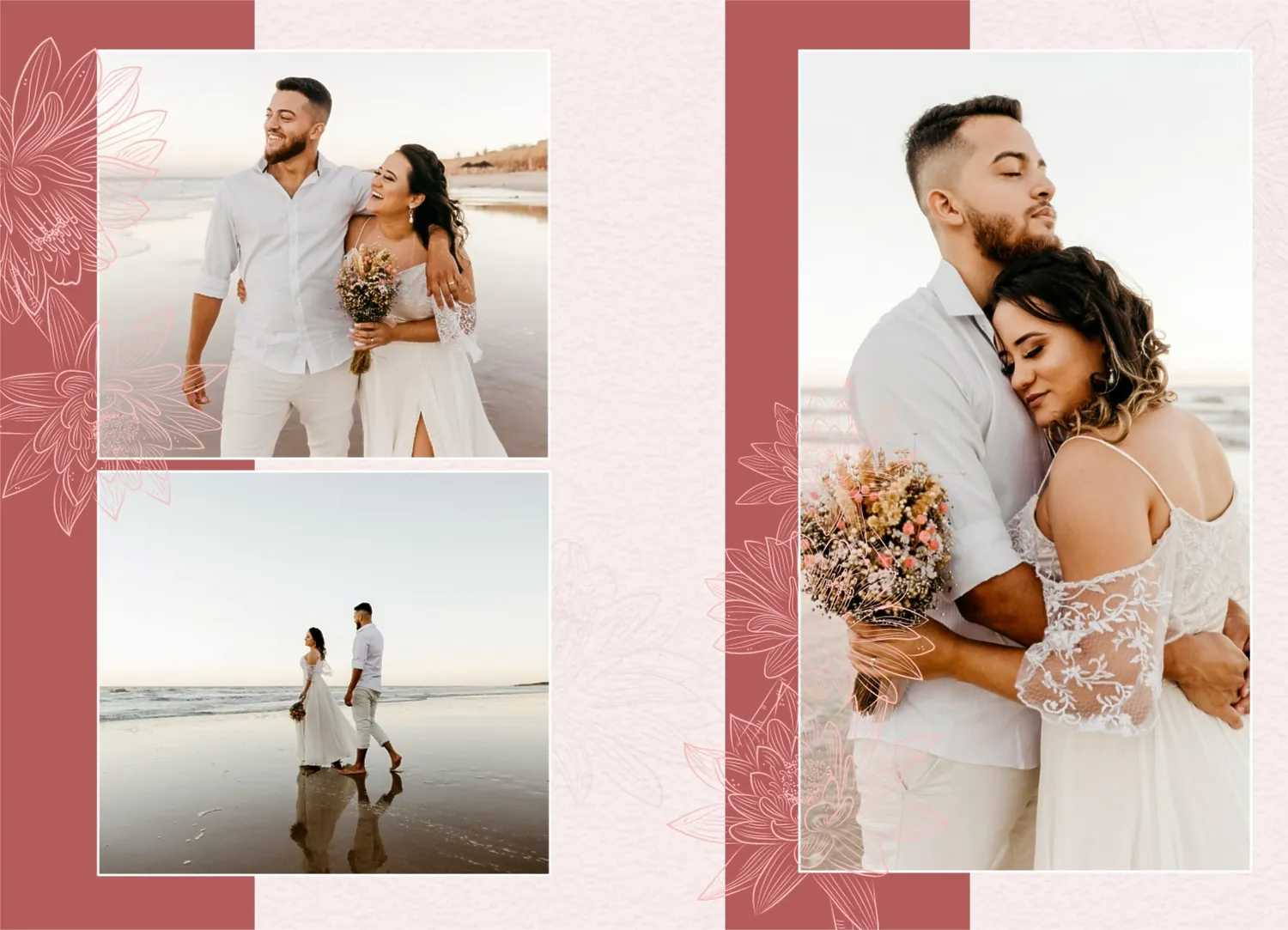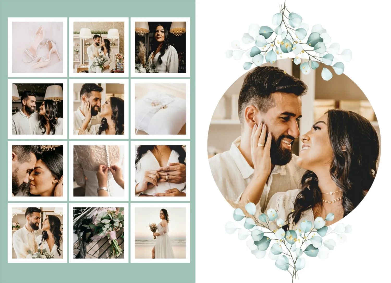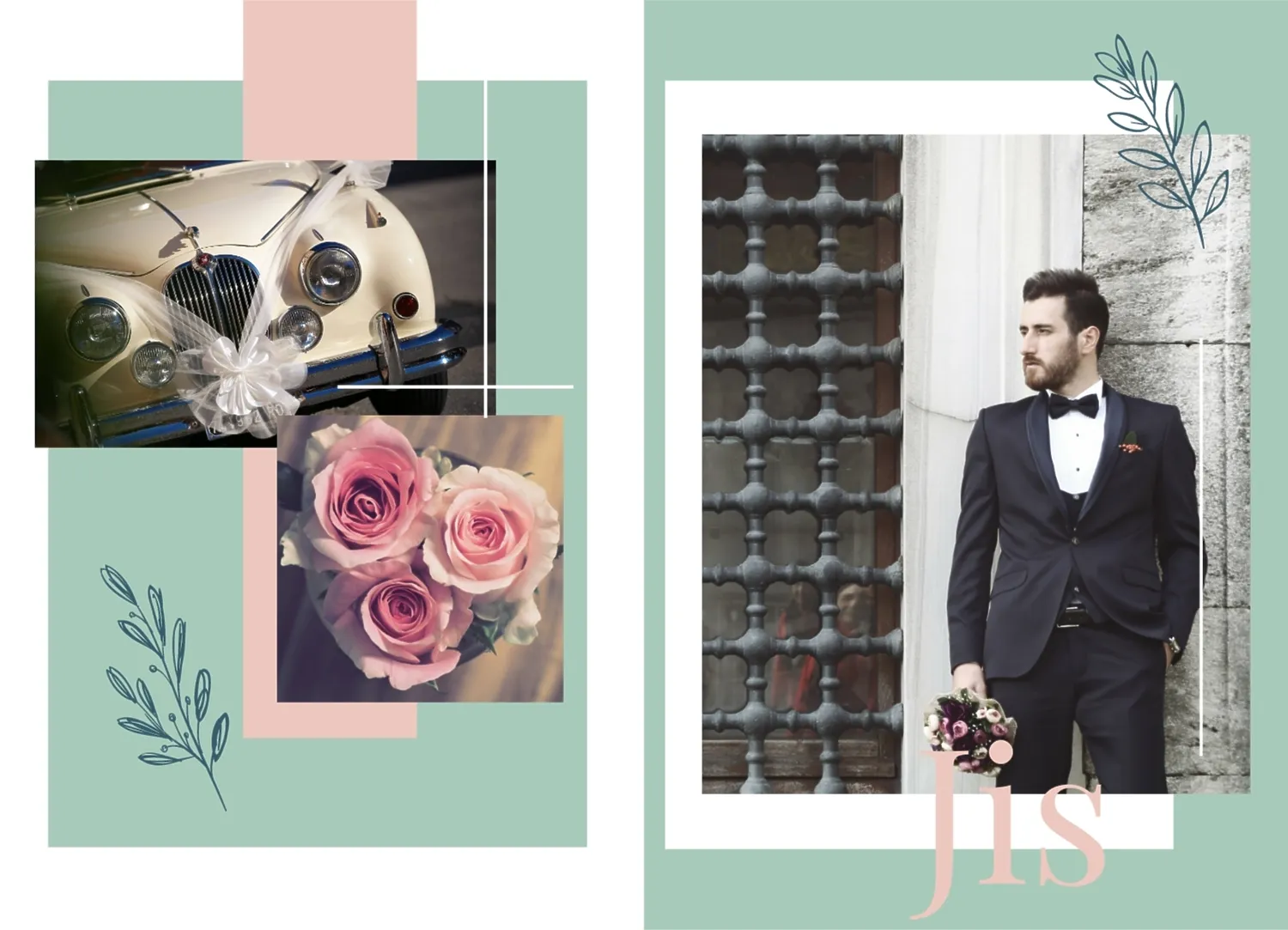 Vestuvių fotografijų fotoknygos šablonas yra paruoštas dizainas, kurį galite naudoti internetiniame dizaineryje, kad sukurtumėte savo unikalų vestuvių nuotraukų albumą. Šis šablonas suteikia pagrindą jūsų albumui apipavidalinti, įskaitant nuotraukų talpinimą, šriftų stilių pasirinkimą, elementų paskirstymą ir bendros estetikos kūrimą. Šablonas apima įvairius nuotraukų išdėstymo maketus. Galite pridėti parašus į nuotraukas, vestuvių momentų aprašymus. Naudodami šį šabloną galite lengvai sukurti savo unikalią vestuvių fotoknygą kietu viršeliu. Tiesiog įkelkite savo nuotraukas, įklijuokite tekstą ir pritaikykite dizainą pagal savo pageidavimus. Internetinis dizaineris turi platų šablonų ir įrankių pasirinkimą, kad jūsų fotoknyga taptų tikrai ypatinga ir įsimintina.