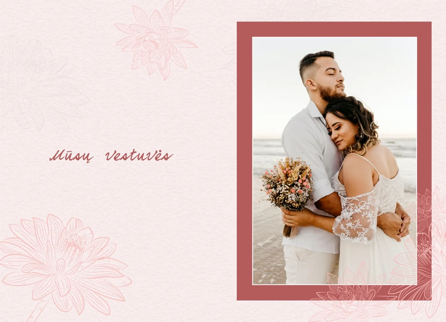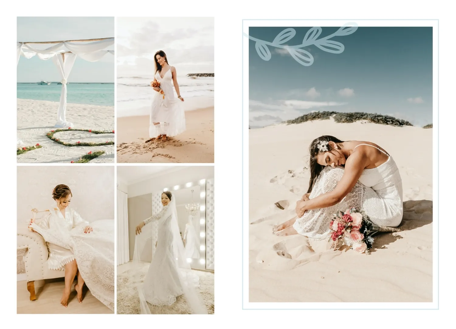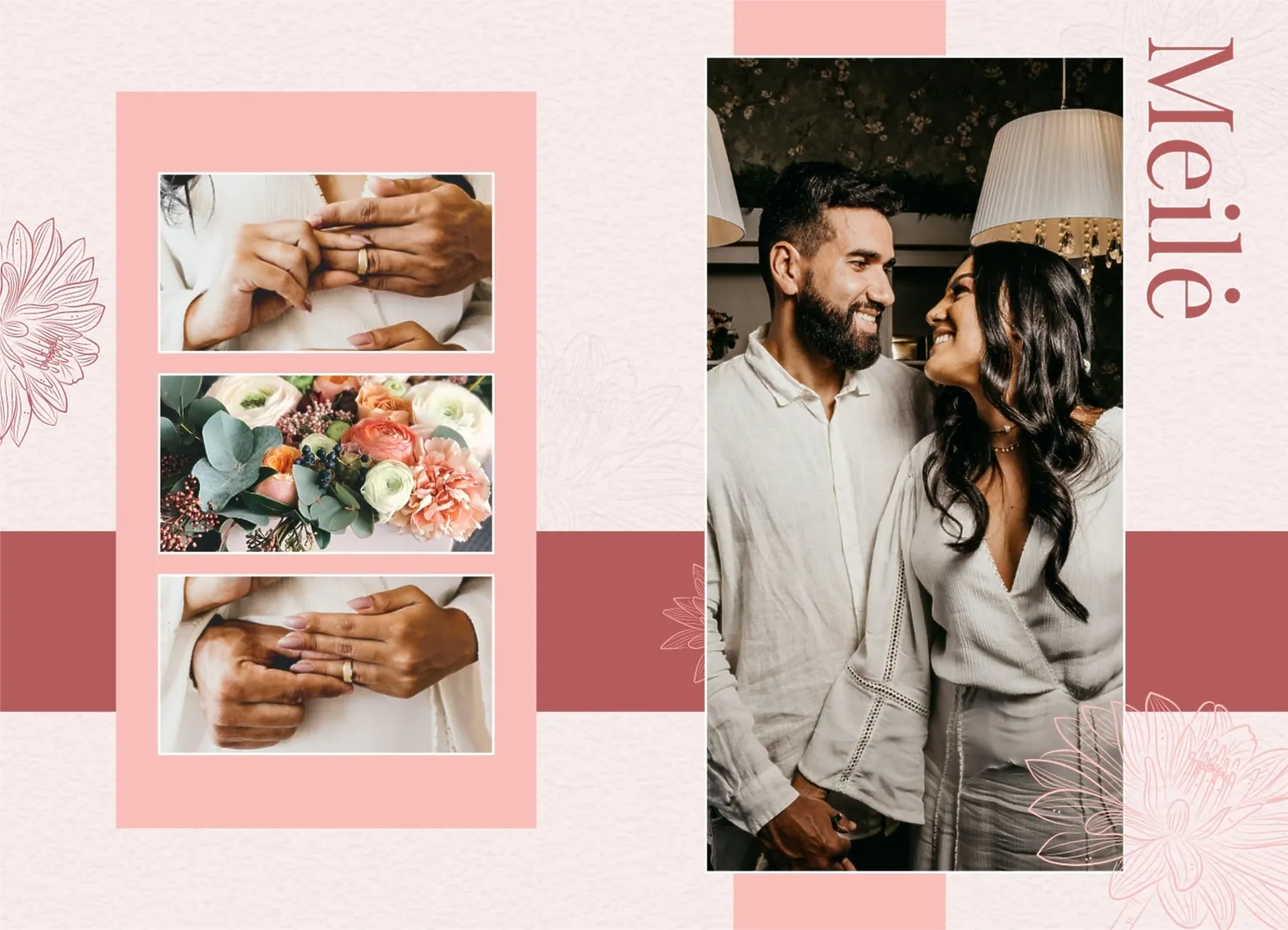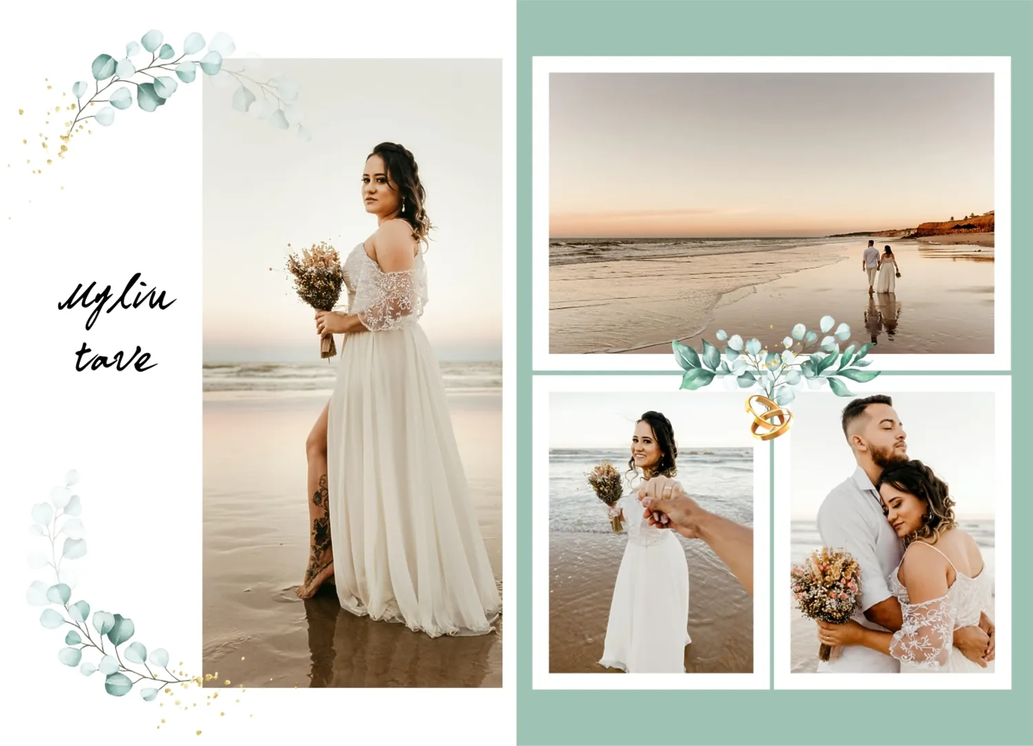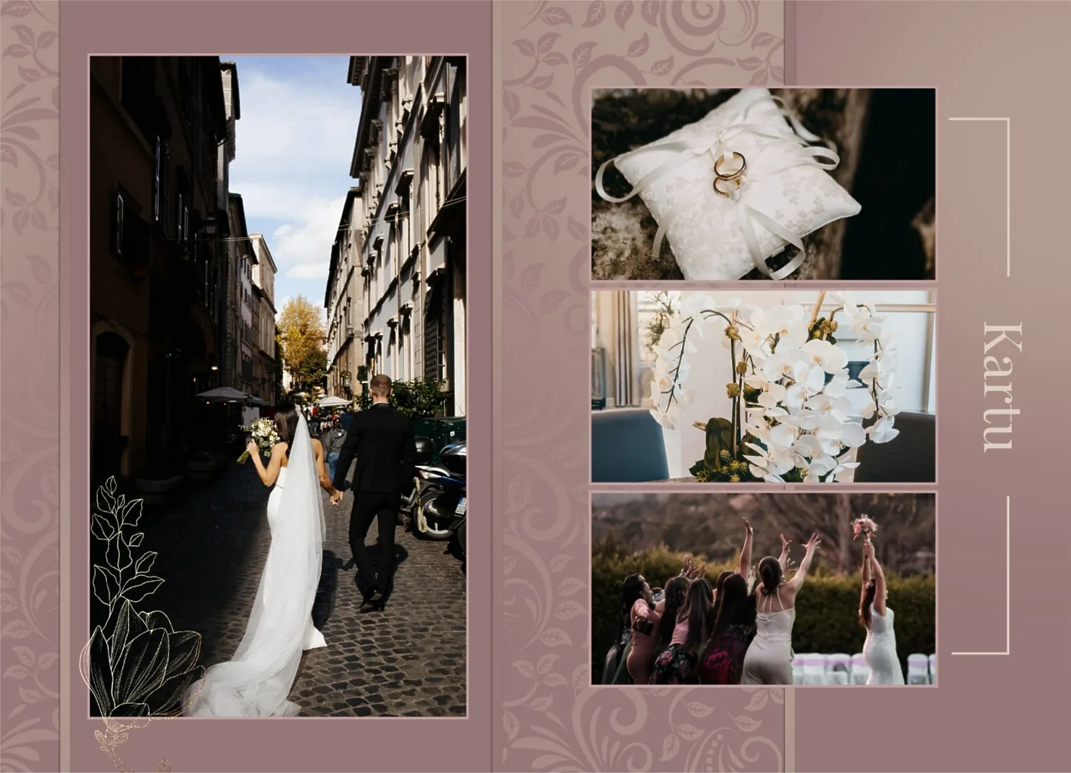 Vestuvių fotografijų fotoknygos šablonas yra paruoštas dizainas, kurį galite naudoti internetiniame dizaineryje, kad sukurtumėte savo unikalų vestuvių nuotraukų albumą. Šis šablonas suteikia pagrindą jūsų albumui apipavidalinti, įskaitant nuotraukų talpinimą, šriftų stilių pasirinkimą, elementų paskirstymą ir bendros estetikos kūrimą. Šablonas apima įvairius nuotraukų išdėstymo maketus. Galite pridėti parašus į nuotraukas, vestuvių momentų aprašymus. Naudodami šį šabloną galite lengvai sukurti savo unikalią vestuvių fotoknygą kietu viršeliu. Tiesiog įkelkite savo nuotraukas, įklijuokite tekstą ir pritaikykite dizainą pagal savo pageidavimus. Internetinis dizaineris turi platų šablonų ir įrankių pasirinkimą, kad jūsų fotoknyga taptų tikrai ypatinga ir įsimintina.