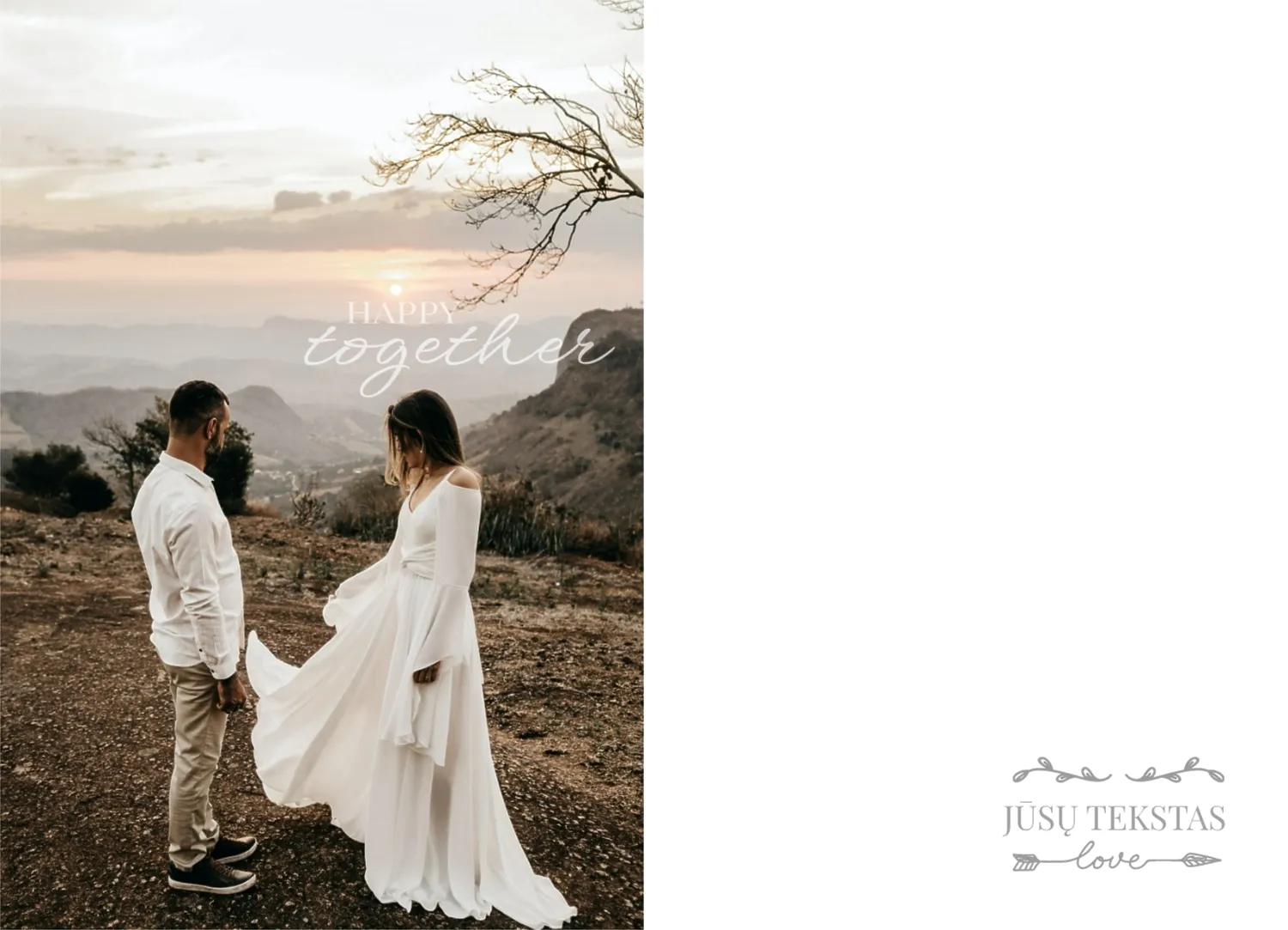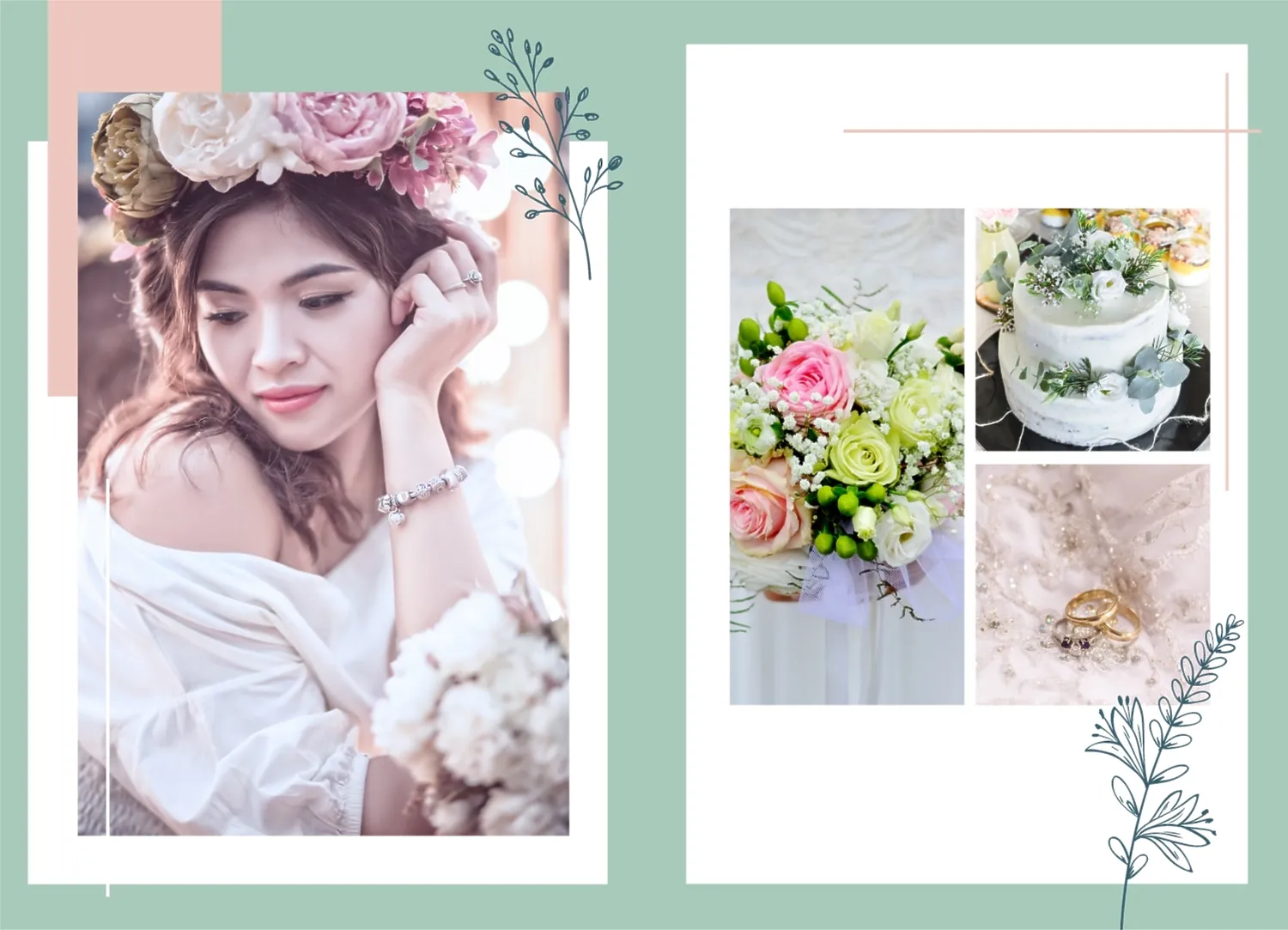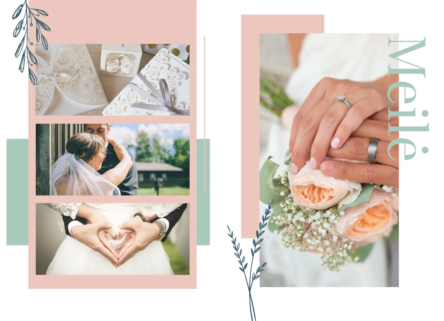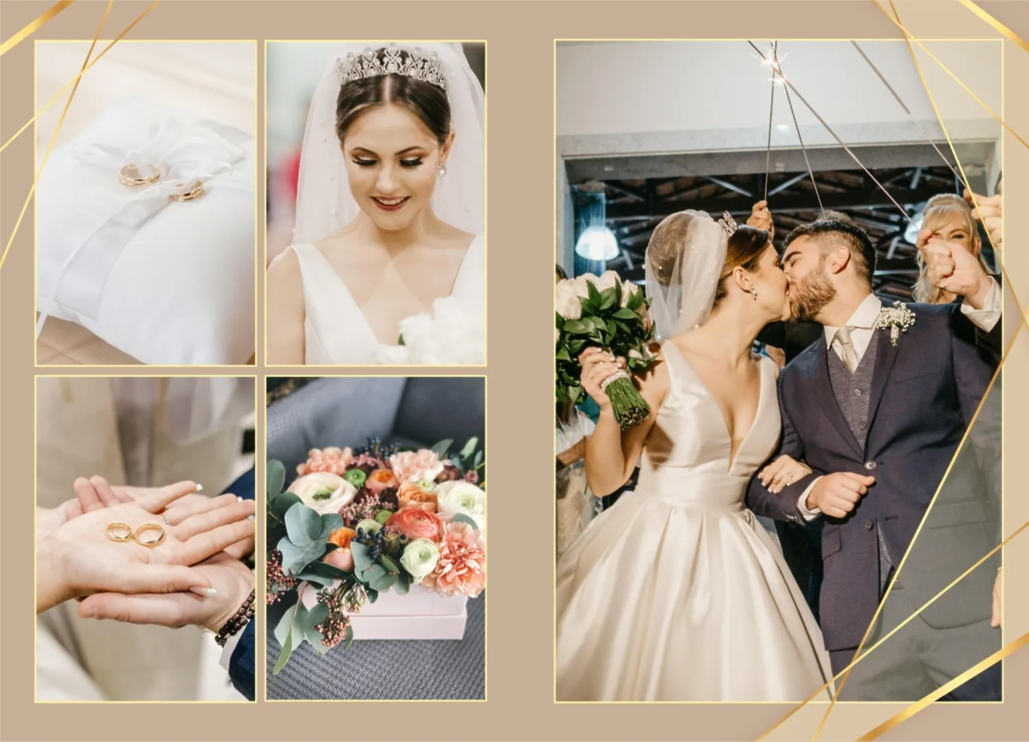 Vestuvių fotografijų fotoknygos šablonas yra paruoštas dizainas, kurį galite naudoti internetiniame dizaineryje, kad sukurtumėte savo unikalų vestuvių nuotraukų albumą. Šis šablonas suteikia pagrindą jūsų albumui apipavidalinti, įskaitant nuotraukų talpinimą, šriftų stilių pasirinkimą, elementų paskirstymą ir bendros estetikos kūrimą. Šablonas apima įvairius nuotraukų išdėstymo maketus. Galite pridėti parašus į nuotraukas, vestuvių momentų aprašymus. Naudodami šį šabloną galite lengvai sukurti savo unikalią vestuvių fotoknygą kietu viršeliu. Tiesiog įkelkite savo nuotraukas, įklijuokite tekstą ir pritaikykite dizainą pagal savo pageidavimus. Internetinis dizaineris turi platų šablonų ir įrankių pasirinkimą, kad jūsų fotoknyga taptų tikrai ypatinga ir įsimintina.