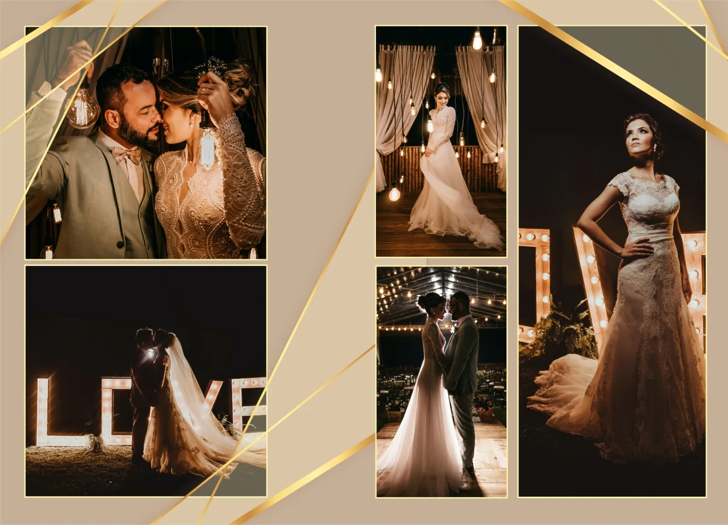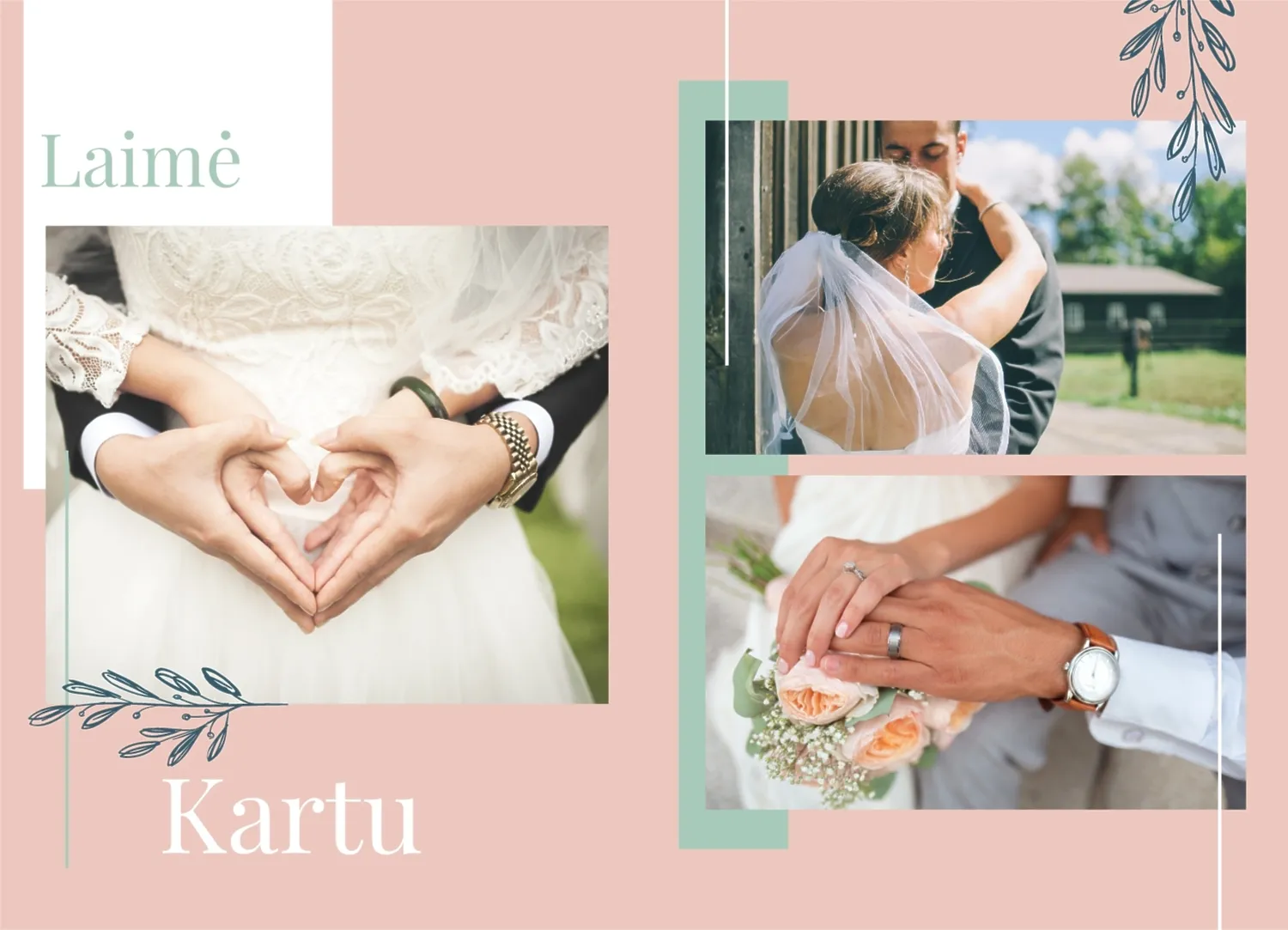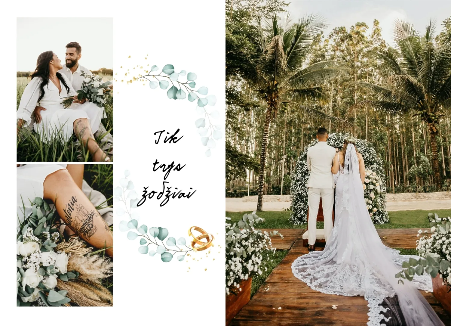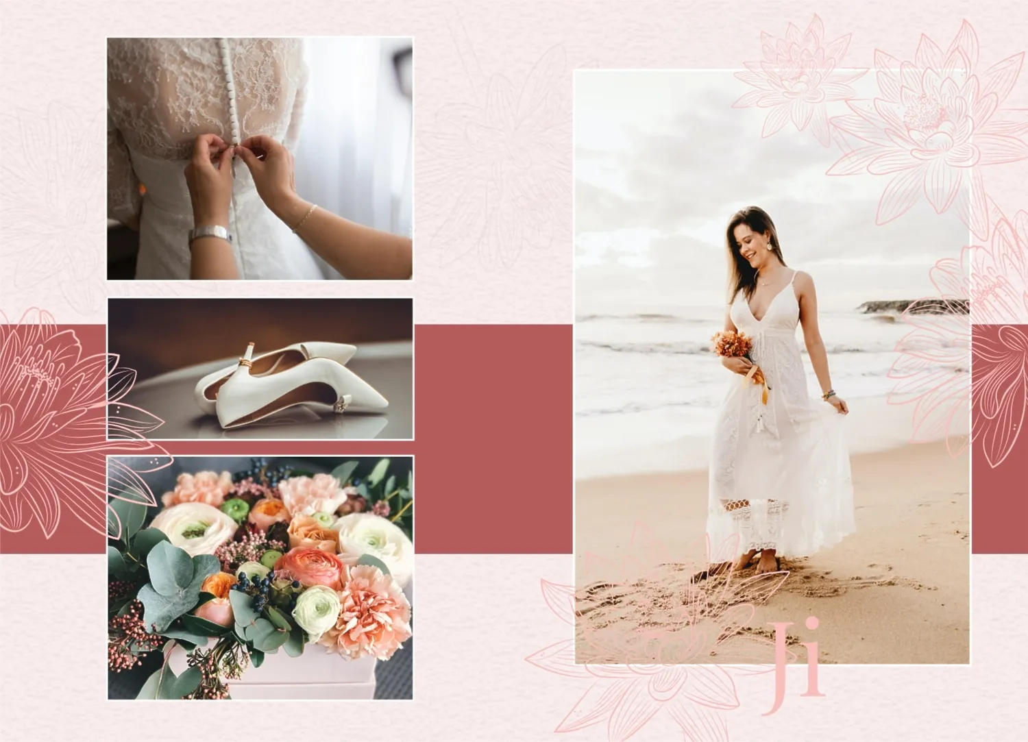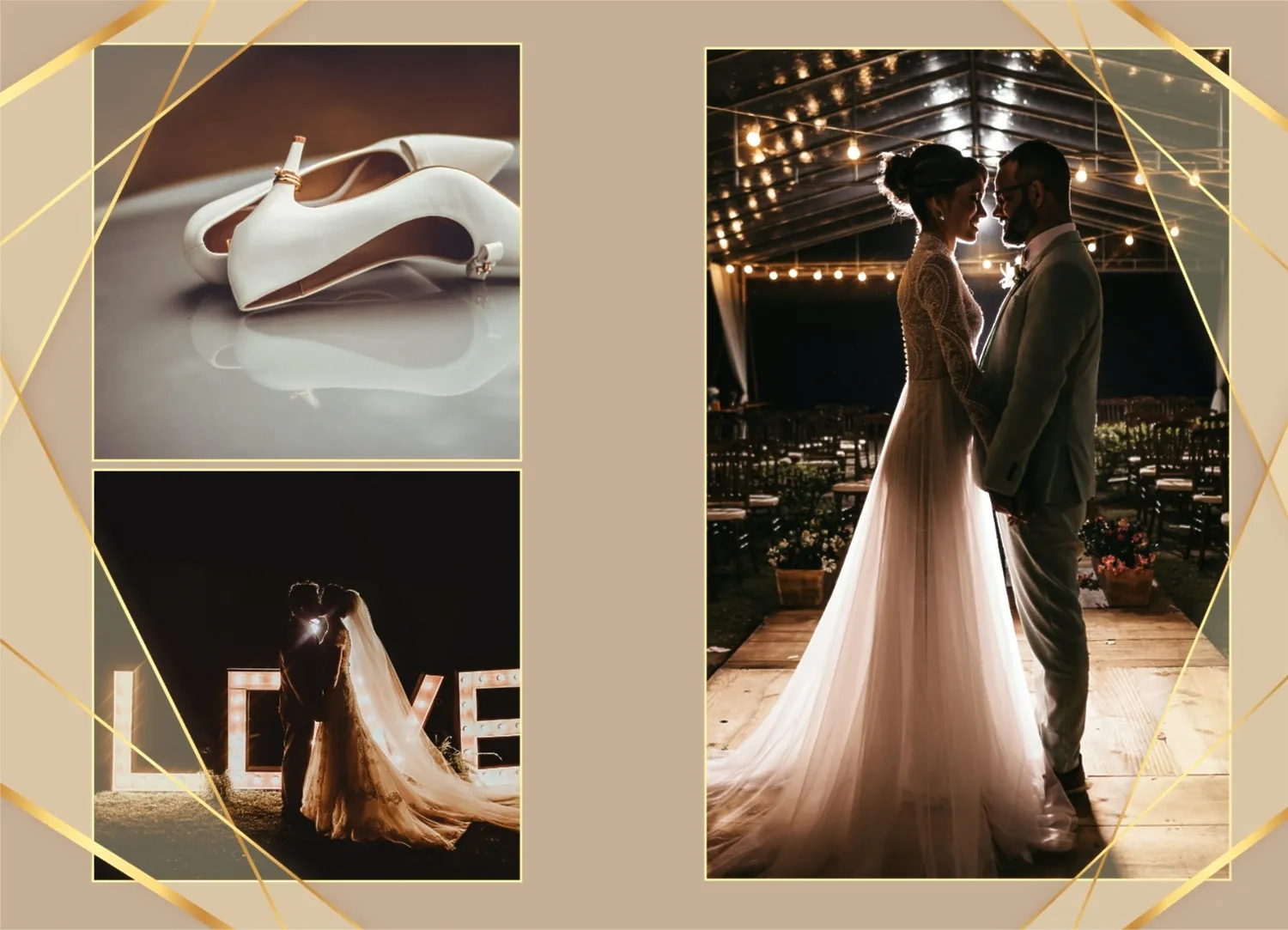 Vestuvių fotografijų fotoknygos šablonas yra paruoštas dizainas, kurį galite naudoti internetiniame dizaineryje, kad sukurtumėte savo unikalų vestuvių nuotraukų albumą. Šis šablonas suteikia pagrindą jūsų albumui apipavidalinti, įskaitant nuotraukų talpinimą, šriftų stilių pasirinkimą, elementų paskirstymą ir bendros estetikos kūrimą. Šablonas apima įvairius nuotraukų išdėstymo maketus. Galite pridėti parašus į nuotraukas, vestuvių momentų aprašymus. Naudodami šį šabloną galite lengvai sukurti savo unikalią vestuvių fotoknygą kietu viršeliu. Tiesiog įkelkite savo nuotraukas, įklijuokite tekstą ir pritaikykite dizainą pagal savo pageidavimus. Internetinis dizaineris turi platų šablonų ir įrankių pasirinkimą, kad jūsų fotoknyga taptų tikrai ypatinga ir įsimintina.