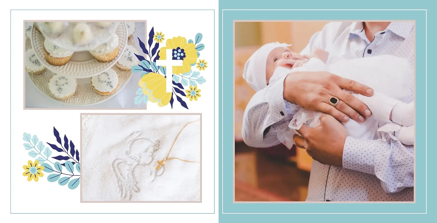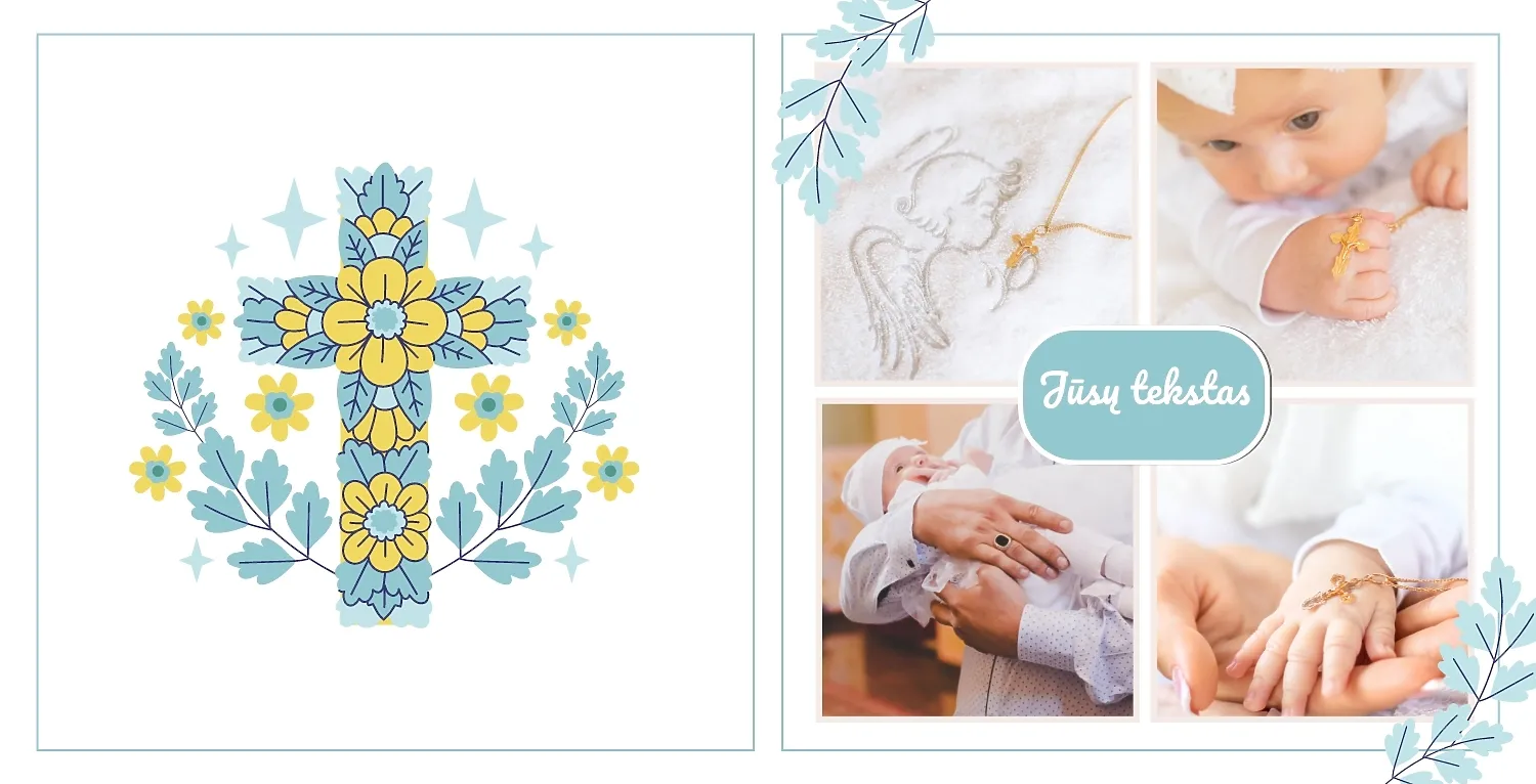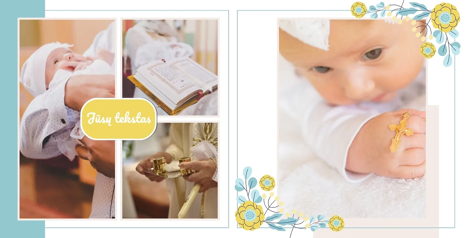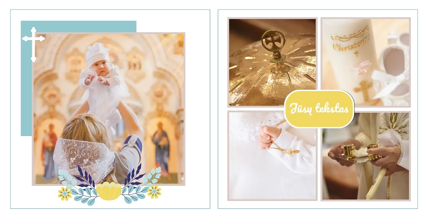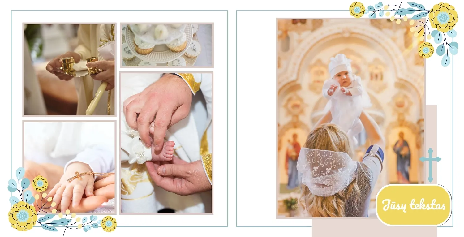 Krikštas yra ypač svarbus ir šventas įvykis mažo žmogaus gyvenime, ir daugelis tėvų nori jį išsaugoti atmintinose nuotraukose. Unikalios fotoknygos, skirtos šiai dienai, sukūrimas padės jums amžinai išsaugoti ceremonijos prisiminimus ir pasidalinti jais su artimaisiais. Mūsų internetiniame dizaineryje siūlome pakeisti paruoštą kvadratinės fotoknygos šabloną kietame viršelyje, specialiai pritaikytą jūsų pageidavimams. Šis šablonas, sukurtas krikšto nuotraukai, turi rafinuotą ir subtilų dizainą, kuris puikiai tinka šio momento iškilmingumui ir džiaugsmui parodyti. Fotoknygos viršelyje galite įdėti savo kūdikio vaizdą gražioje krikšto aprangoje, taip pat ceremonijos datą. Fotoknygos viduje rasite įvairius nuotraukų maketus su krikštatėviais ir svečiais, taip pat vietą įrašams ir pageidavimams. Šablono elementų fonas ir dekoras pabrėžs šio įvykio svarbą ir sukurs šventės atmosferą. Kurdami unikalią fotoknygą apie krikštą, jūs darote kažką ypatingo savo šeimai. Ši knyga bus vertingas palikimas ir paminklas jūsų rūpesčiui ir meilei mažam jūsų šeimos nariui.
