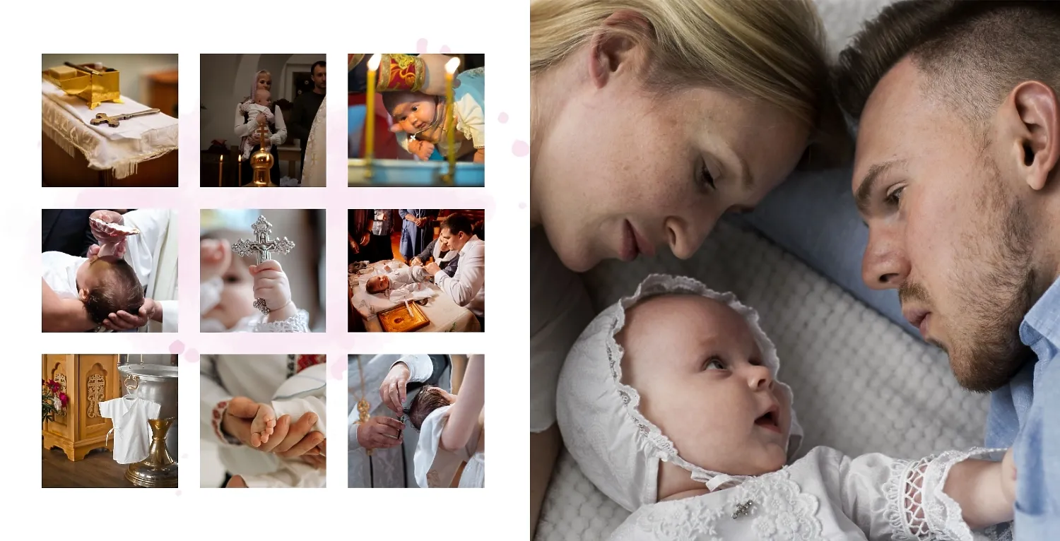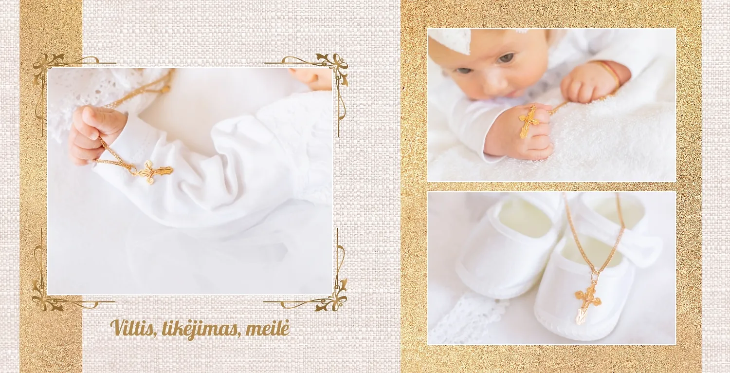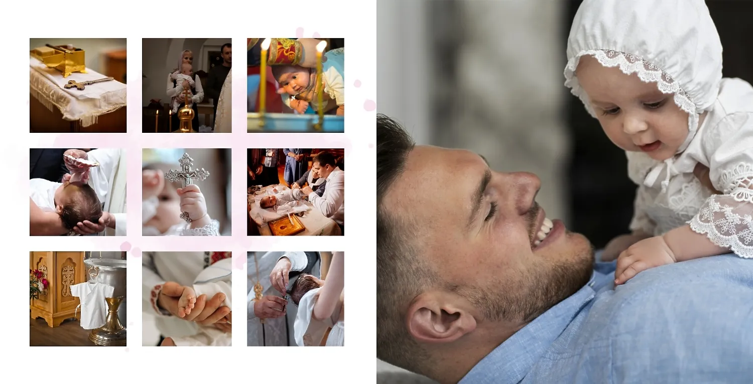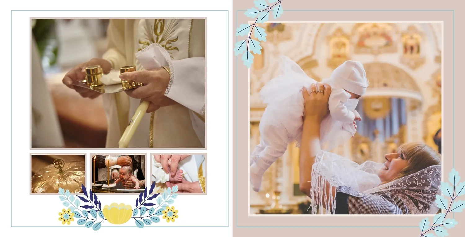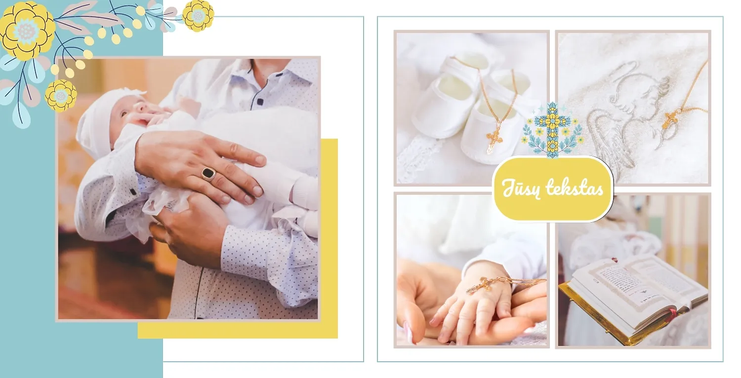 Krikštas yra ypač svarbus ir šventas įvykis mažo žmogaus gyvenime, ir daugelis tėvų nori jį išsaugoti atmintinose nuotraukose. Unikalios fotoknygos, skirtos šiai dienai, sukūrimas padės jums amžinai išsaugoti ceremonijos prisiminimus ir pasidalinti jais su artimaisiais. Mūsų internetiniame dizaineryje siūlome pakeisti paruoštą kvadratinės fotoknygos šabloną kietame viršelyje, specialiai pritaikytą jūsų pageidavimams. Šis šablonas, sukurtas krikšto nuotraukai, turi rafinuotą ir subtilų dizainą, kuris puikiai tinka šio momento iškilmingumui ir džiaugsmui parodyti. Fotoknygos viršelyje galite įdėti savo kūdikio vaizdą gražioje krikšto aprangoje, taip pat ceremonijos datą. Fotoknygos viduje rasite įvairius nuotraukų maketus su krikštatėviais ir svečiais, taip pat vietą įrašams ir pageidavimams. Šablono elementų fonas ir dekoras pabrėžs šio įvykio svarbą ir sukurs šventės atmosferą. Kurdami unikalią fotoknygą apie krikštą, jūs darote kažką ypatingo savo šeimai. Ši knyga bus vertingas palikimas ir paminklas jūsų rūpesčiui ir meilei mažam jūsų šeimos nariui.