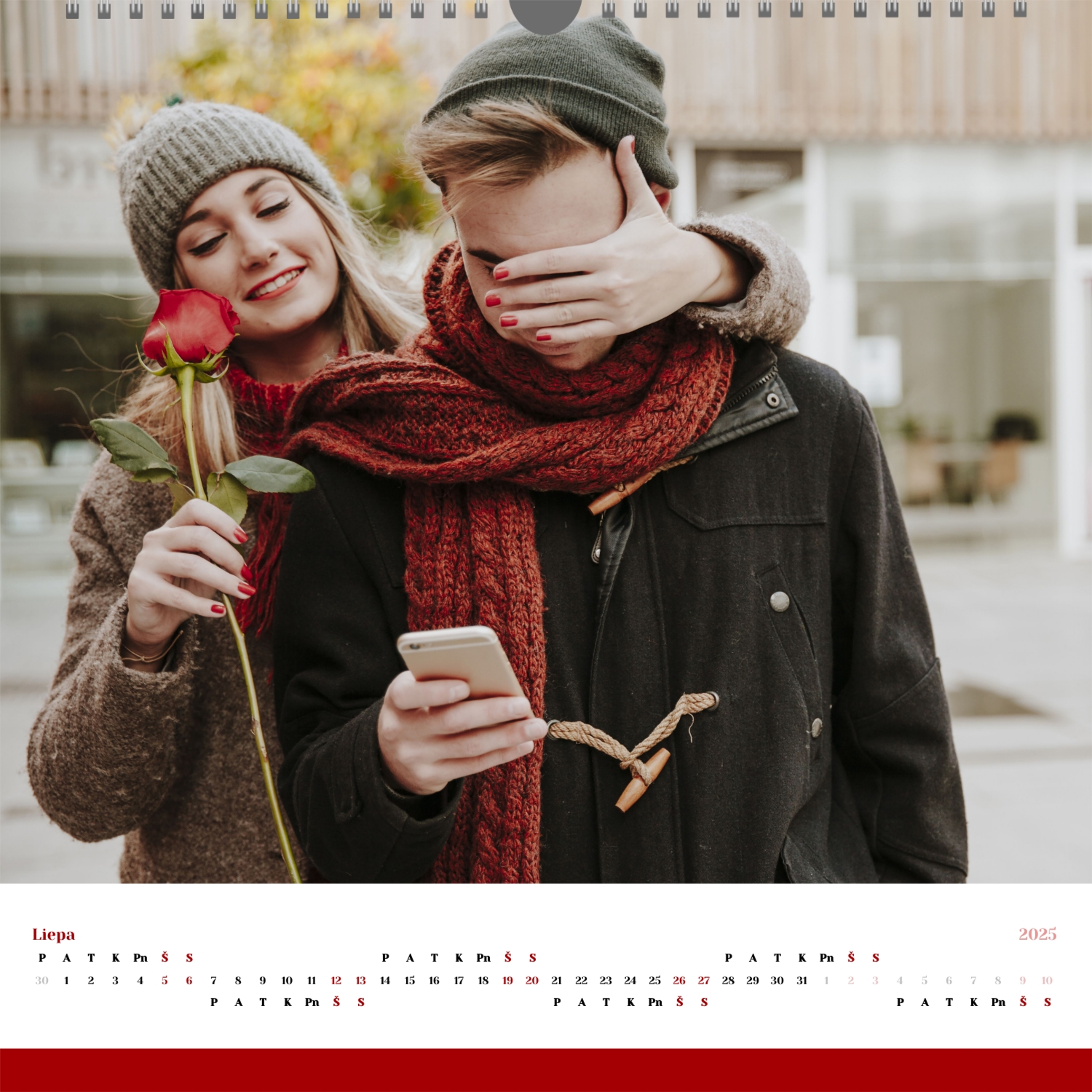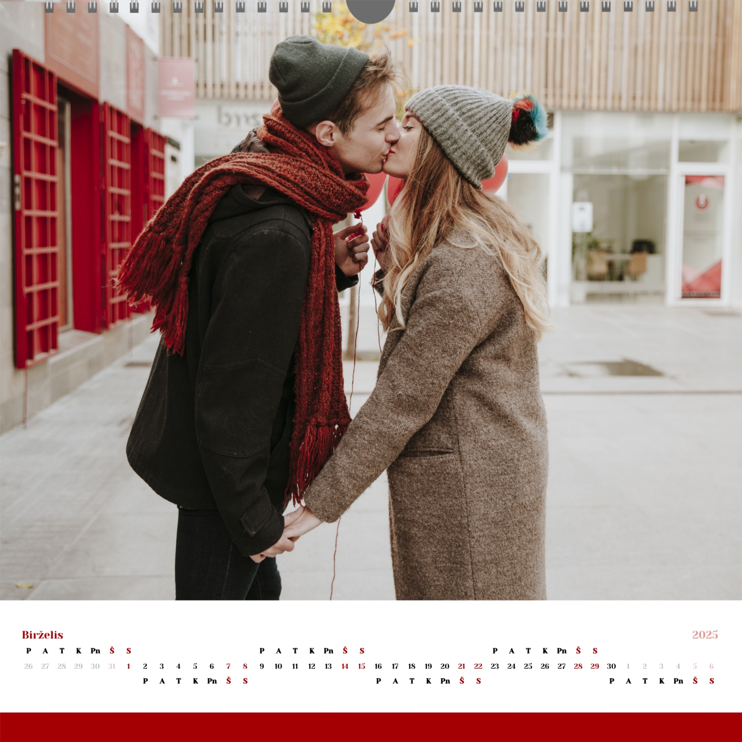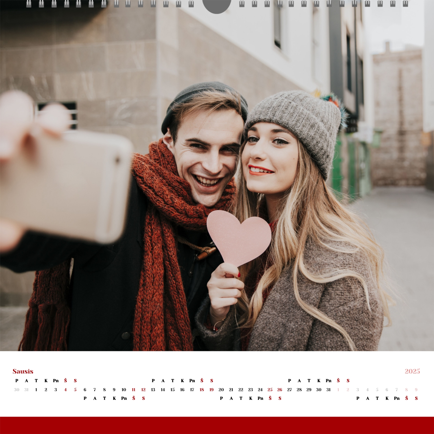Žiemos magija paversta elegantišku sieninio kvadratinio kalendoriaus šablonu "laiminga žiema", sukurtu specialiai įsimylėjėliams. Šis unikalus dizainas sujungia subtilius žiemos spindesio atspalvius ir šiltas meilės pastabas. Jis skirtas tapti ne tik praktišku laiko apskaitos įrankiu, bet ir švelniu priminimu apie svarbiausias jūsų dienas. Naudokite įvairius dekoratyvinius elementus, integruotus į dizainerį, kad pabrėžtumėte sezono atmosferą. Specialūs skyriai svarbioms datoms ir įvykiams leidžia pažymėti svarbius jūsų meilės istorijos momentus. Čia gali būti ikoninių susitikimų dienos, bučinių dienos po pūgomis arba tiesiog akimirkos, kurios tapo svarbiausiomis jūsų gyvenime. Lengva redaguoti mūsų internetinį dizainerį leidžia jums išreikšti savo jausmus ir sukurti kalendorių, kuris atspindės jūsų unikalią meilę.