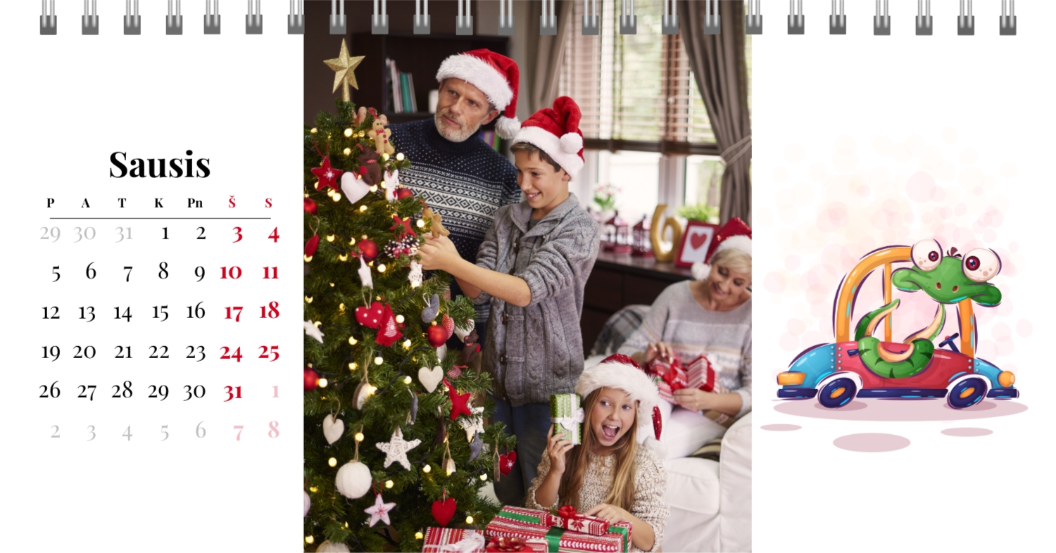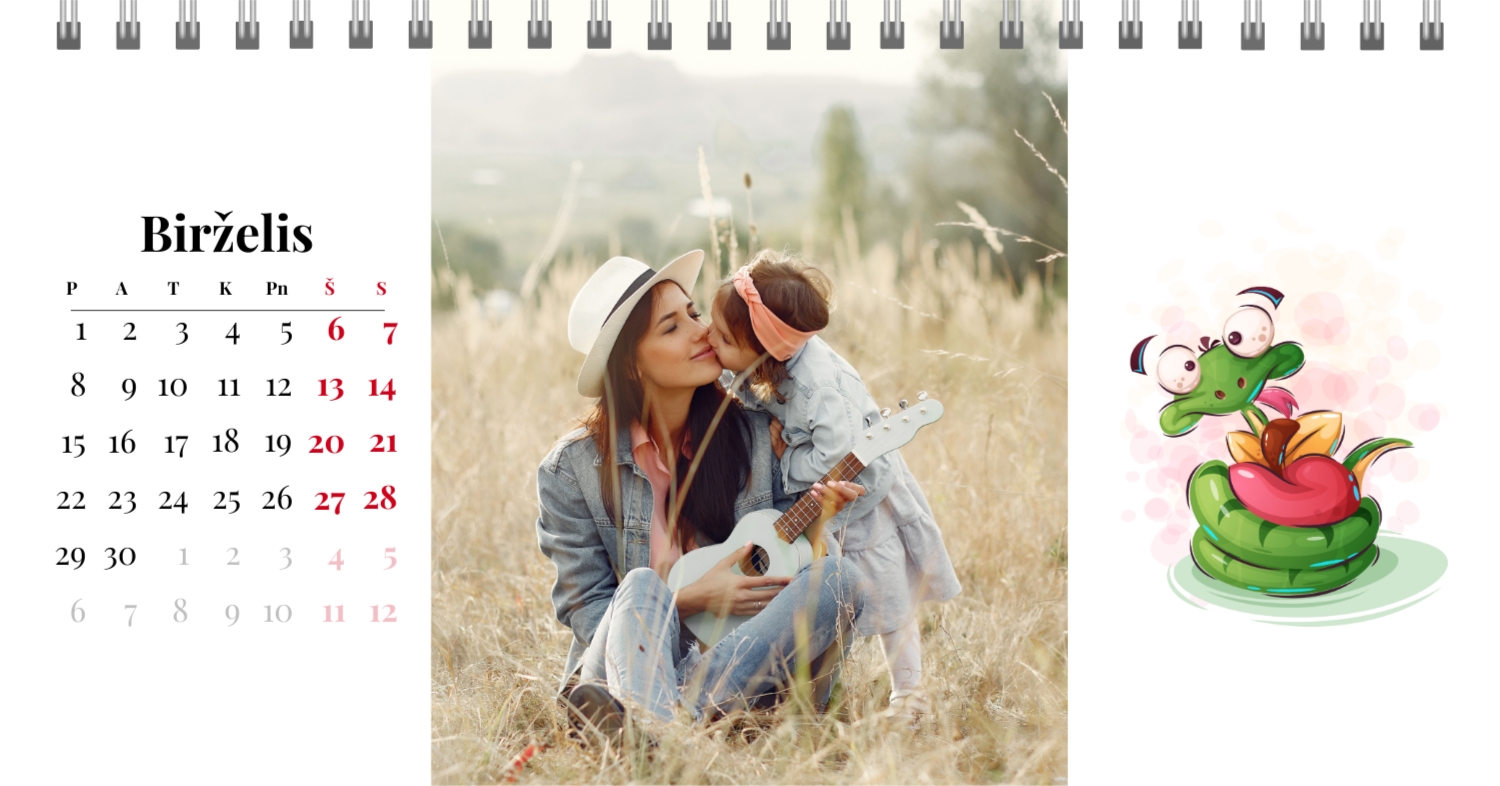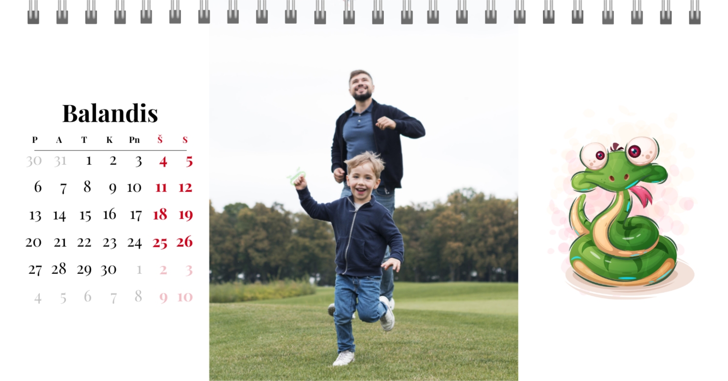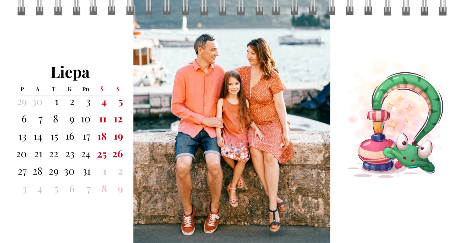 Paruoštas šeimos atostogų kalendoriaus šablonas yra idealus sprendimas tiems, kurie nori sukurti šiltą ir unikalią dovaną, užpildytą emocijomis. Mūsų internetiniame dizaineryje galite ne tik naudoti šį stilingą ir praktišką išdėstymą, bet ir visiškai pritaikyti jį savo norams ir poreikiams. Mūsų dizaineryje jūs lengvai pridėsite nuotraukas, pakeisite šriftus, spalvas ir parašus, kad jūsų darbalaukio kalendorius būtų toks, kokį jį pateikiate. Pavyzdžiui, galite pažymėti visas svarbias šeimos datas, pridėti Atmintinų įvykių vaizdus, pritaikyti išvaizdą pagal jūsų namų stilių.