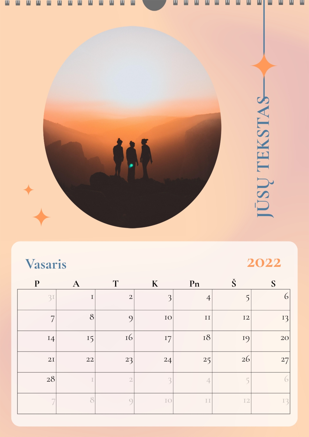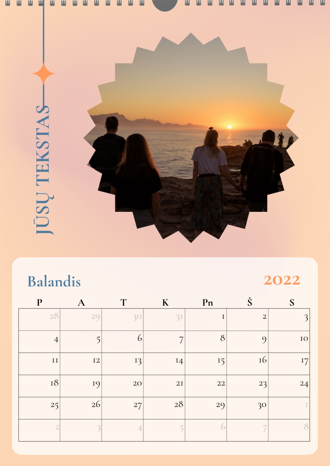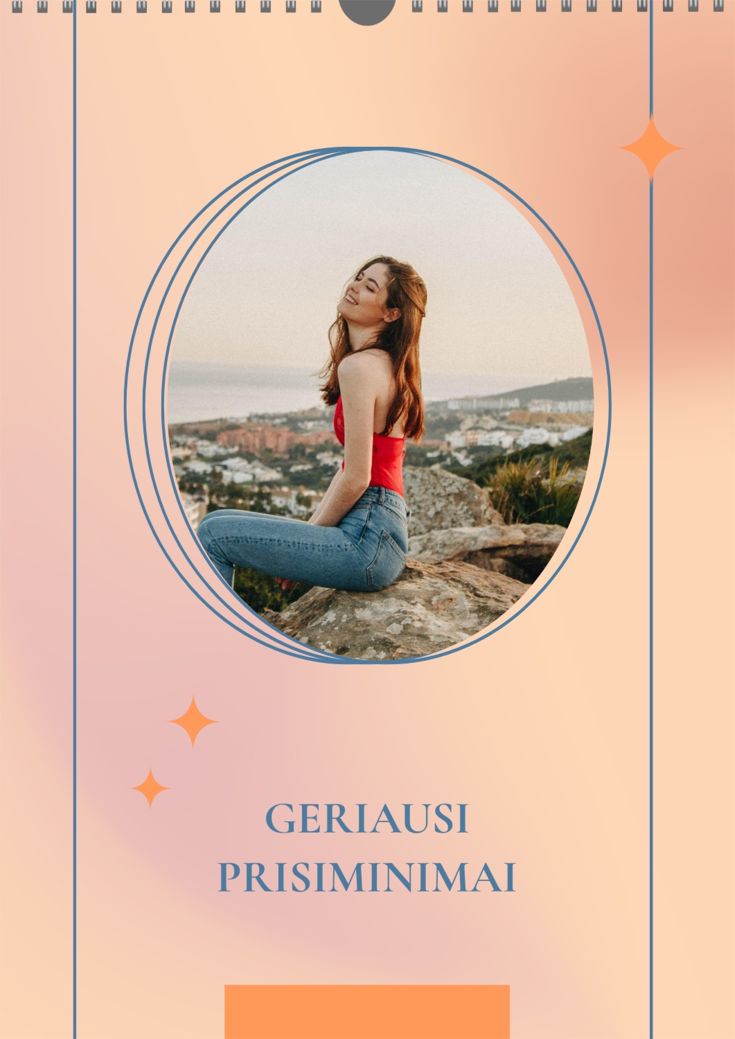 Kalendoriaus Šablonas "geriausi prisiminimai" yra idealus pagrindas sukurti asmeninį sieninį kalendorių, kuris atspindės svarbiausius jūsų gyvenimo momentus. Šis šablonas tinka bet kuriam vartotojui, norinčiam pabrėžti individualumą ir išsaugoti svarbius įvykius stilingu ir funkcionaliu formatu. Tai ypač naudinga fotografams, poroms, kūrybinių studijų ar mažų įmonių savininkams, kurie nori sukurti unikalų produktą klientams arba suteikti savo artimiesiems kažką ypatingo. Pagrindinis šablono "geriausi prisiminimai" bruožas yra jo universalumas. Galite lengvai pritaikyti dizainą savo poreikiams naudodami mūsų patogų internetinį dizainerį. Redagavimas leidžia jums pakeisti nuotraukas, pridėti teksto blokus su svarbiomis datomis ar įkvepiančiomis citatomis, taip pat pasirinkti spalvų schemą, kuri pabrėžia jūsų nuotaiką. Dizaineris siūlo paprastą sąsają, kur jūs tiesiog sukursite unikalų kalendorių savo rankomis, pridedant asmeninius smūgius ir eksperimentuojant su dizaino elementais. Šis šablonas bus puikus sprendimas tiems, kurie nori derinti kūrybiškumą su praktiškumu. Pavyzdžiui, jogos studijų savininkai gali įklijuoti savo pamokų nuotraukas, kad motyvuotų studentus, o fotografai-naudoti šabloną savo darbams pristatyti. Dėl laisvo redagavimo galimybės "geriausi prisiminimai" tampa ne tik kalendoriumi, bet ir tikra istorija, dekoruota stilingu ir patogiu formatu.