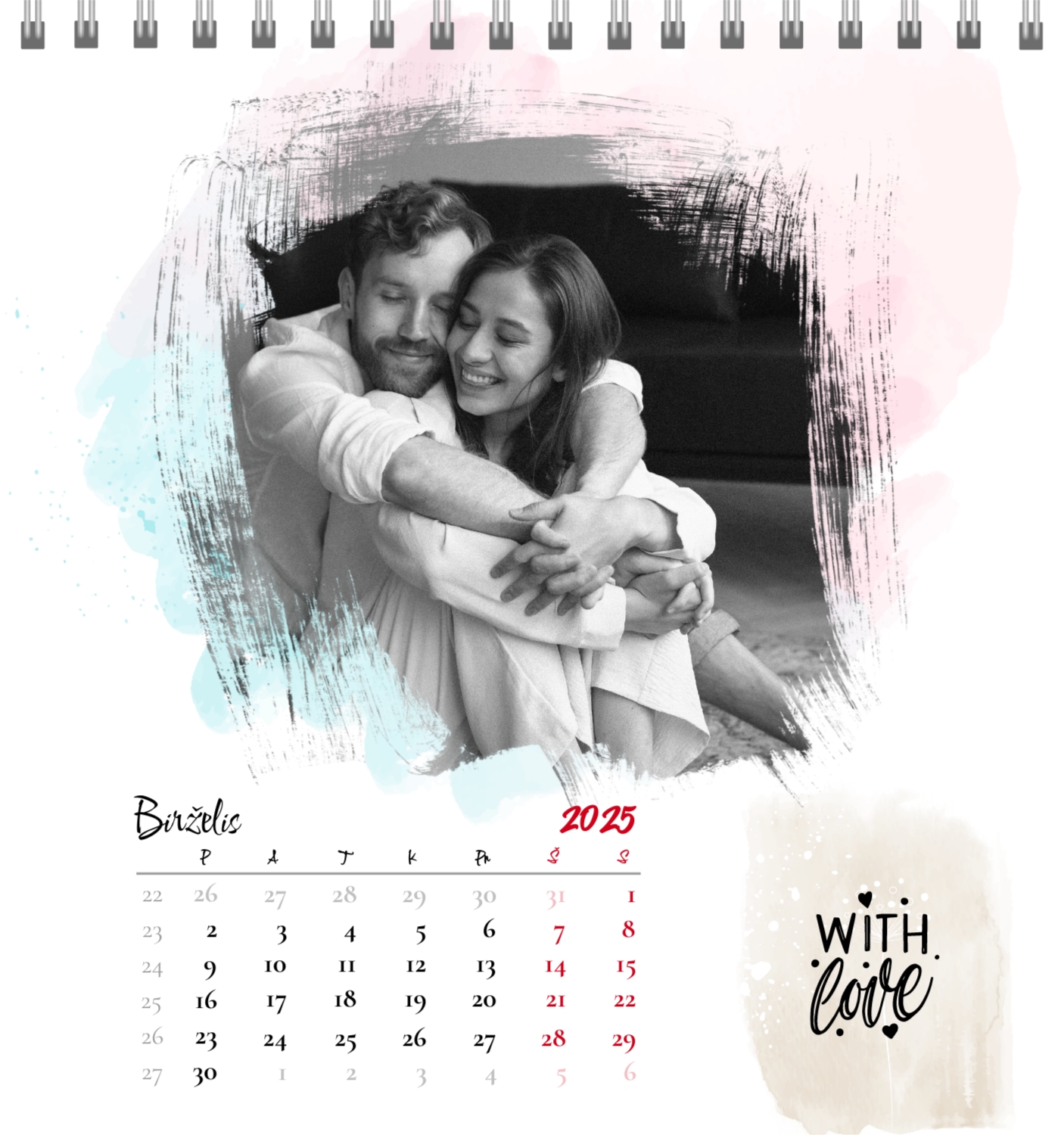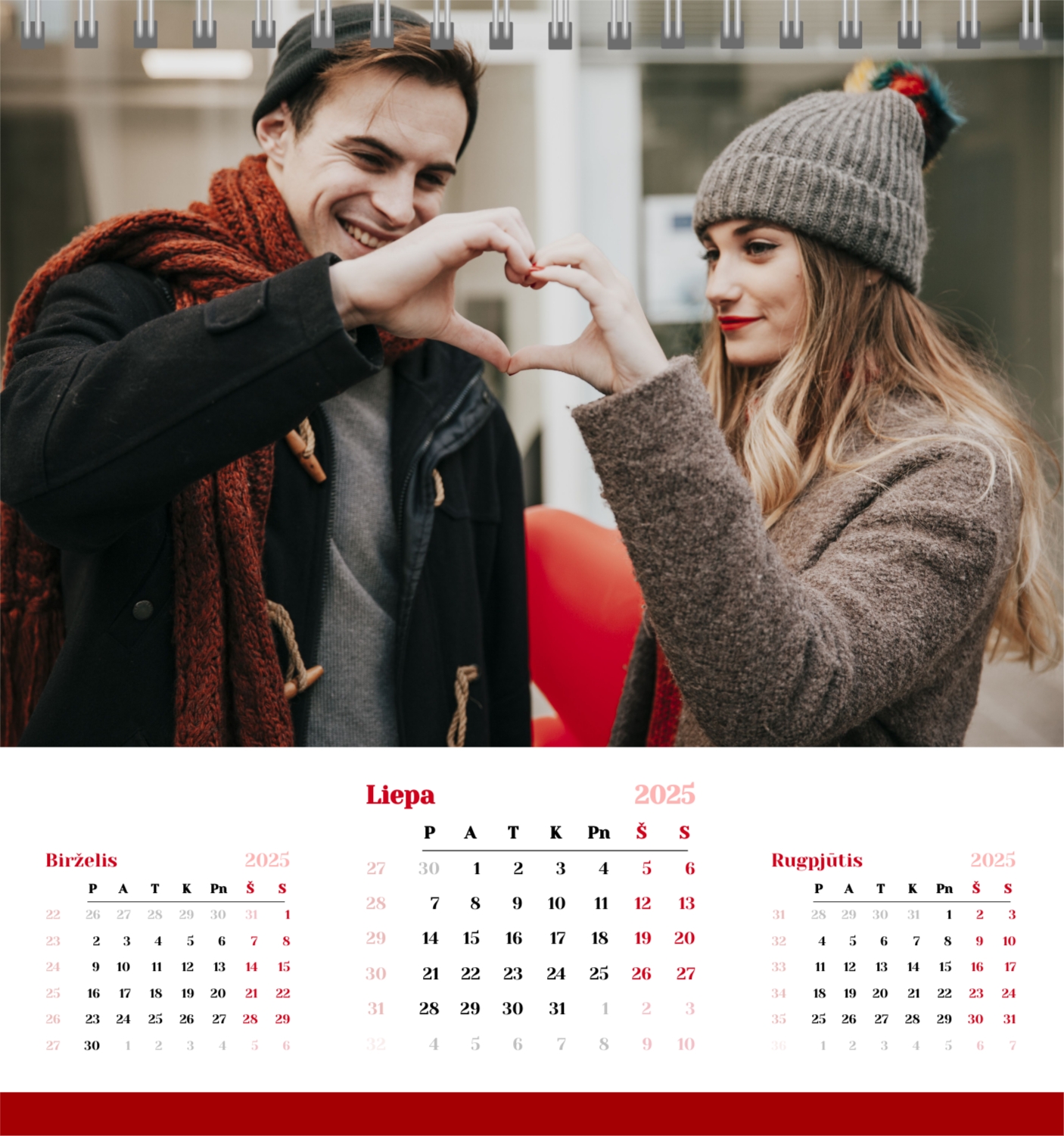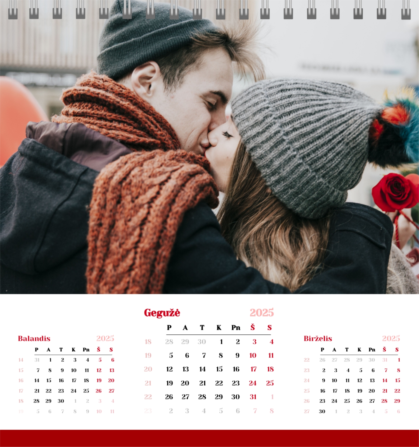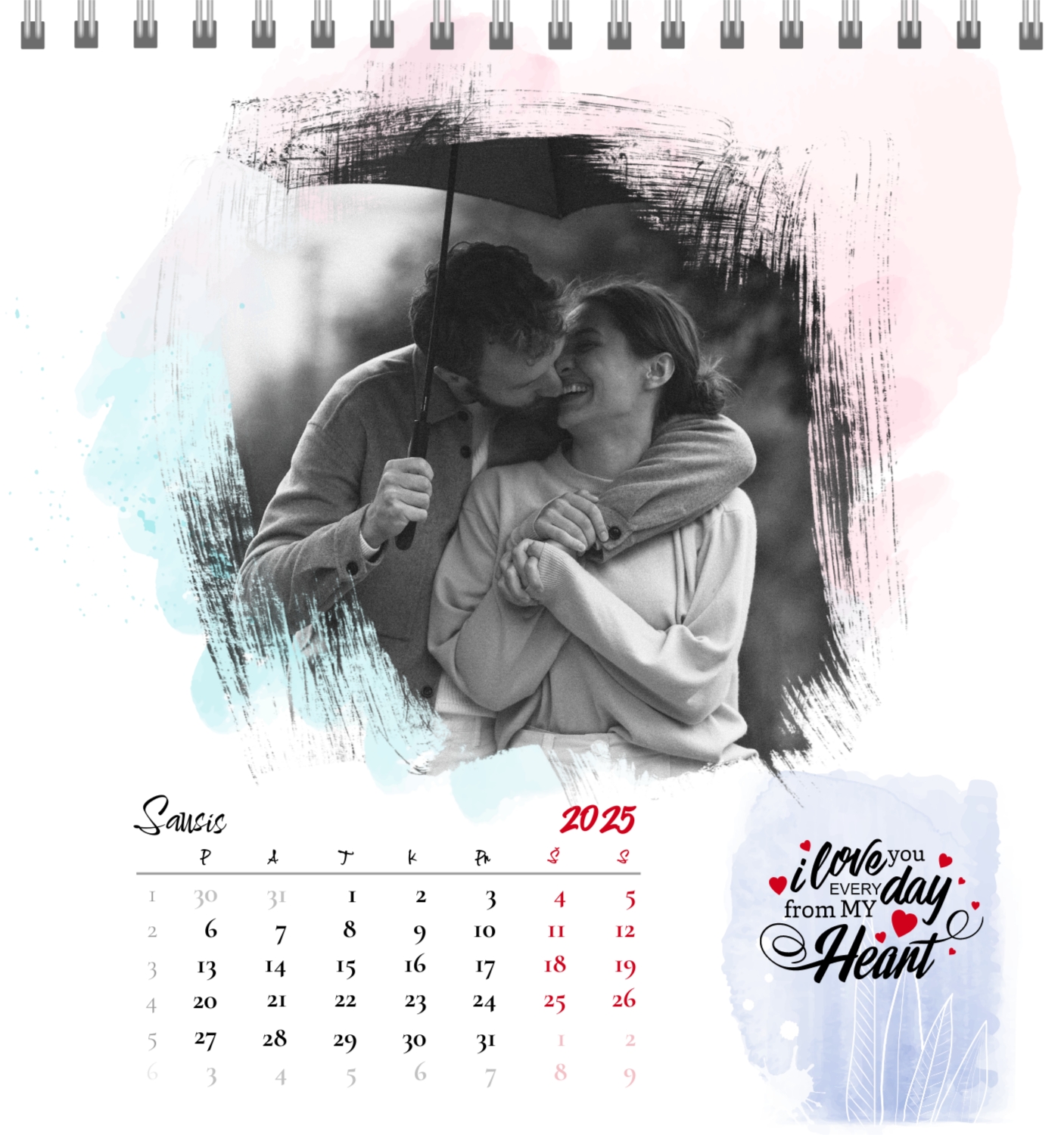 Kalendoriaus Šablonas "geriausi prisiminimai" yra idealus pagrindas sukurti asmeninį 13 puslapių darbalaukio kalendorių, kuris atspindės svarbiausius jūsų gyvenimo momentus. Šis šablonas tinka bet kuriam vartotojui, norinčiam pabrėžti individualumą ir išsaugoti svarbius įvykius stilingu ir funkcionaliu formatu. Tai ypač naudinga fotografams, poroms, kūrybinių studijų ar mažų įmonių savininkams, kurie nori sukurti unikalų produktą klientams arba suteikti savo artimiesiems kažką ypatingo. Galite lengvai pritaikyti dizainą savo poreikiams naudodami mūsų patogų internetinį dizainerį. Redagavimas leidžia jums pakeisti nuotraukas, pridėti teksto blokus su svarbiomis datomis ar įkvepiančiomis citatomis, taip pat pasirinkti spalvų schemą, kuri pabrėžia jūsų nuotaiką. Dizaineris siūlo paprastą sąsają, kur jūs tiesiog sukursite unikalų kalendorių savo rankomis, pridedant asmeninius smūgius ir eksperimentuojant su dizaino elementais.