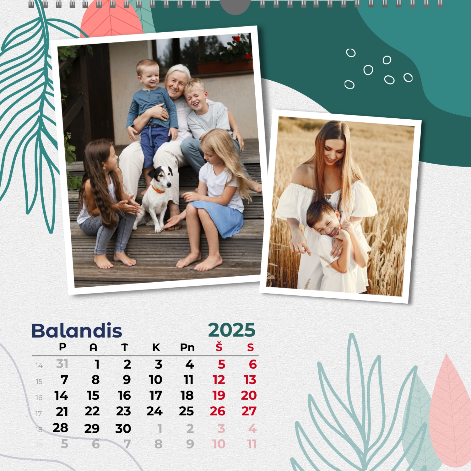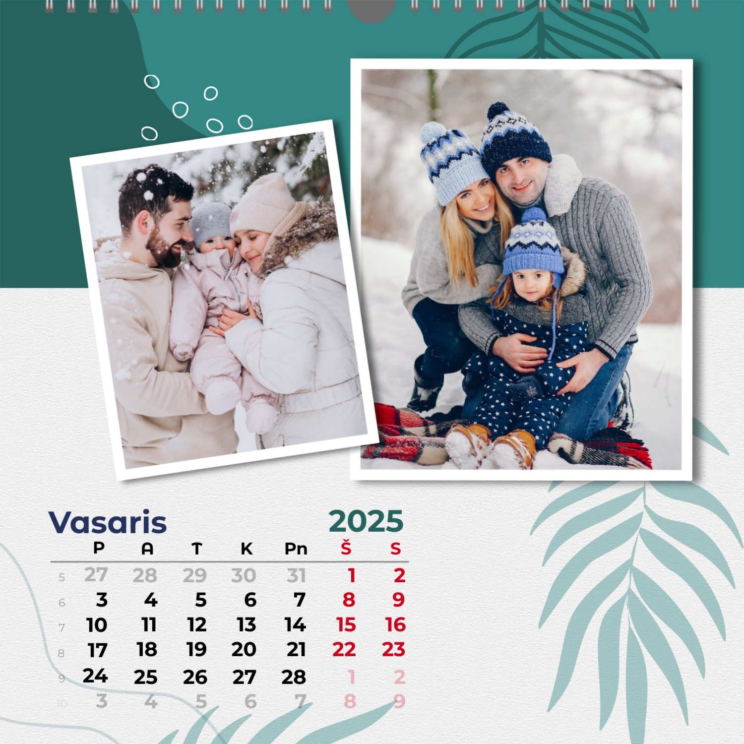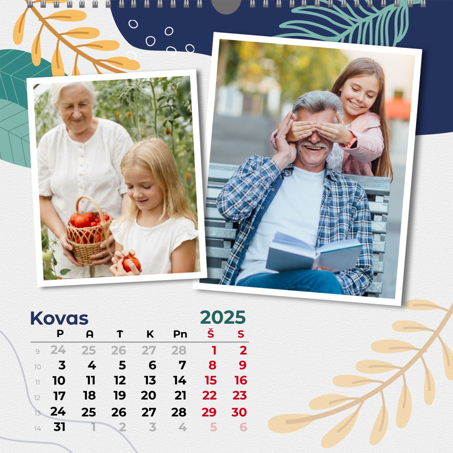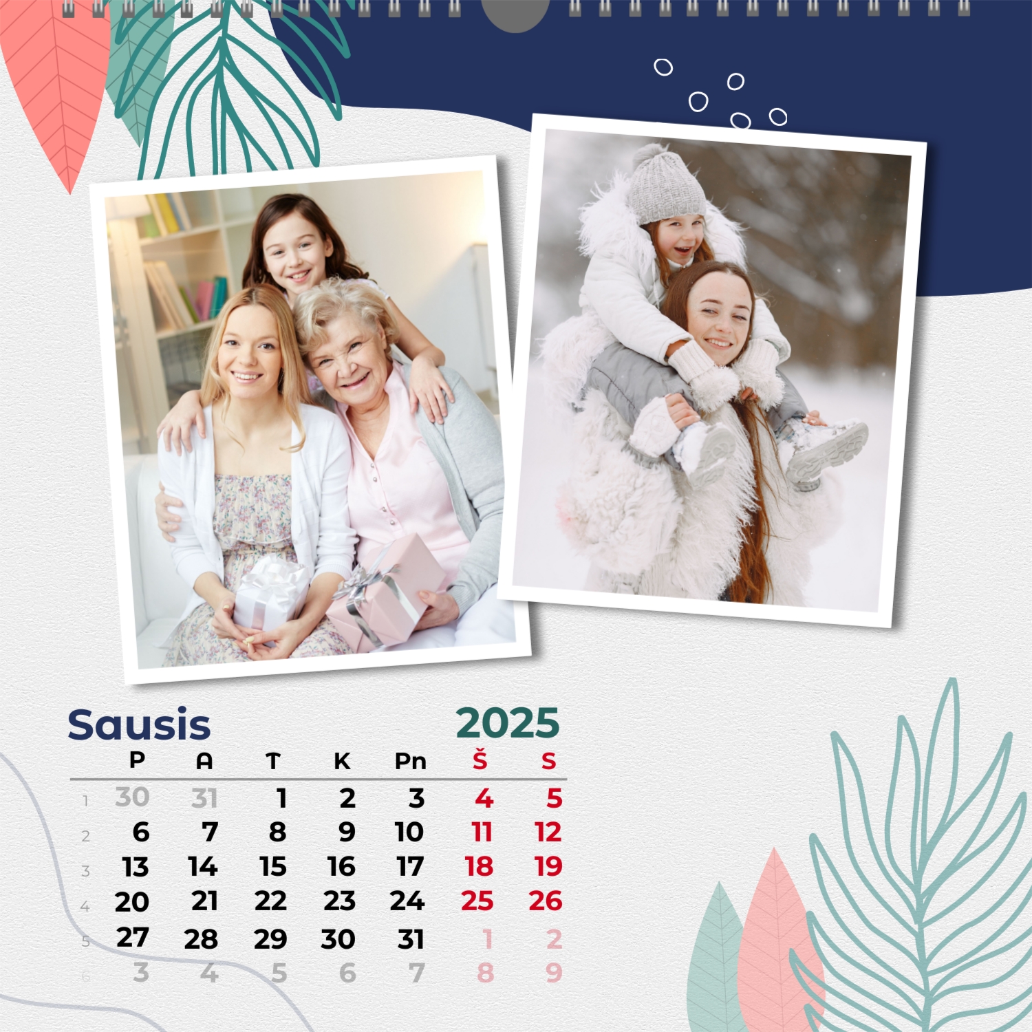 Šeimos nuotraukų kalendorius yra ne tik praktiškas planavimo įrankis, bet ir šiltas priminimas apie artimiausius žmones. Jau paruoštas šablonas leidžia lengvai sukurti unikalų sieninį kvadratinį kalendorių, kuris jus džiugins ištisus metus. Šis šablonas Idealiai tinka šeimoms, norinčioms išsaugoti prisiminimus, taip pat profesionalams, kurie vertina individualumą ir nori pridėti asmeninį dėmesį į savo projektus. Kalendorius su šeimos nuotraukomis gali būti naudojamas įvairiose srityse. Tai bus puikus sprendimas pedagogams ir pedagogams, kurie kuria individualizuotas dovanas tėvams. Fotografai gali pasiūlyti klientams originalų būdą išsaugoti šeimos fotografijas. Tai taip pat bus naudinga dizaineriams ir rinkodaros specialistams, dirbantiems su asmeniniais produktais dovanoms ar akcijoms. Mūsų internetiniame dizaineryje galite pridėti savo nuotraukas, keisti elementų vietą, pasirinkti šriftų stilių ir net pasirinkti spalvų schemą pagal savo skonį. Dizaineris turi patogius įrankius, kad galėtumėte kuo tiksliau pritaikyti kalendorių pagal savo poreikius. Norite palikti daugiau vietos pastaboms ar pabrėžti svarbias datas? Tai lengva padaryti dėl lankstumo nustatymų.