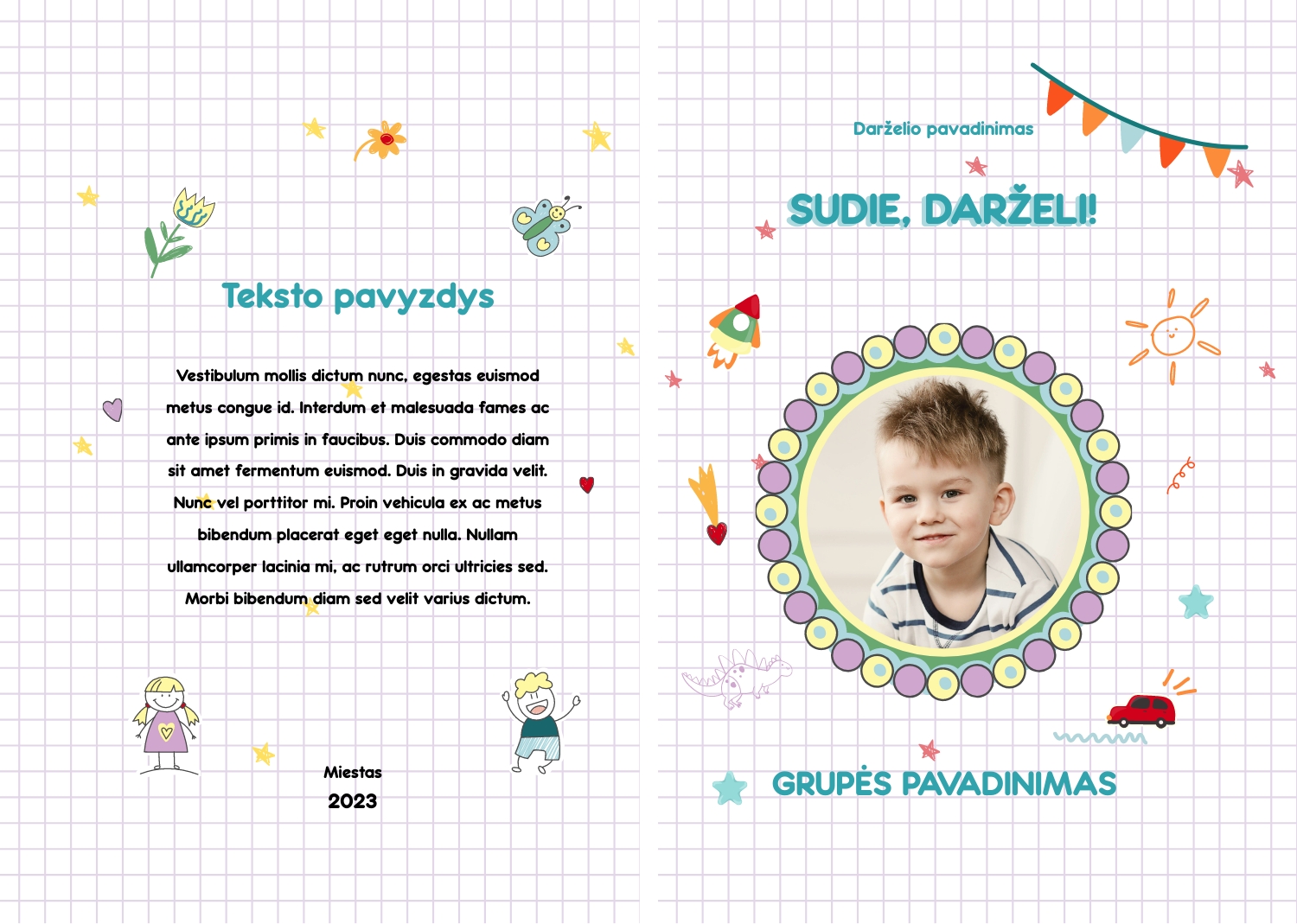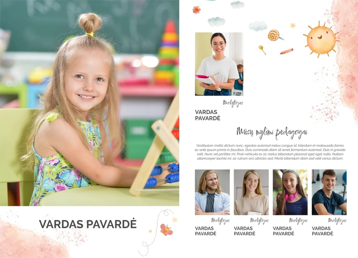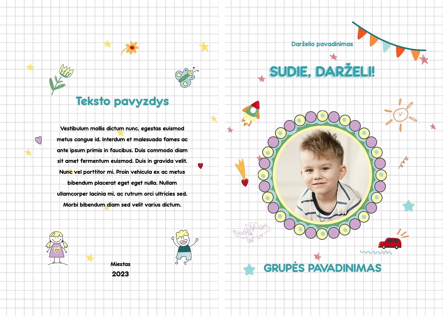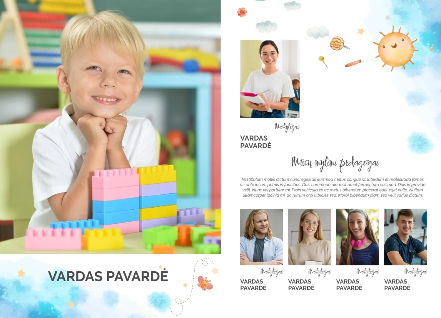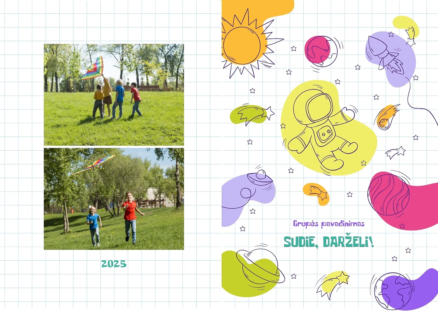 Baigtas kieto viršelio vaikų darželio fotoknygos su kosminiu dizainu šablonas yra originalus atminimo albumo dizaino sprendimas. Ryškios žvaigždžių, planetų ir raketų iliustracijos sukuria įspūdingos kelionės atmosferą, pabrėžiant šio svarbaus momento ypatumą vaikų gyvenime. Šis stilius patiks ne tik vaikams, bet ir tėvams, nes jis daro fotoknygą ryškią, dinamišką ir nepanašią į standartinius albumus. Šis šablonas yra specialiai sukurtas naudoti mūsų internetiniame dizaineryje, kur kiekvienas gali lengvai pritaikyti išdėstymą pagal savo pageidavimus. Galite pakeisti foną, pasirinkti kitus dekoratyvinius elementus, pridėti mokinių ir mokytojų vardus, įterpti asmeninius parašus ir pageidavimus. Toks modelis gali būti tinkamas ne tik darželiui, bet ir mokytojams, dirbantiems ikimokykliniame ugdyme, pedagogams ir animatoriams.