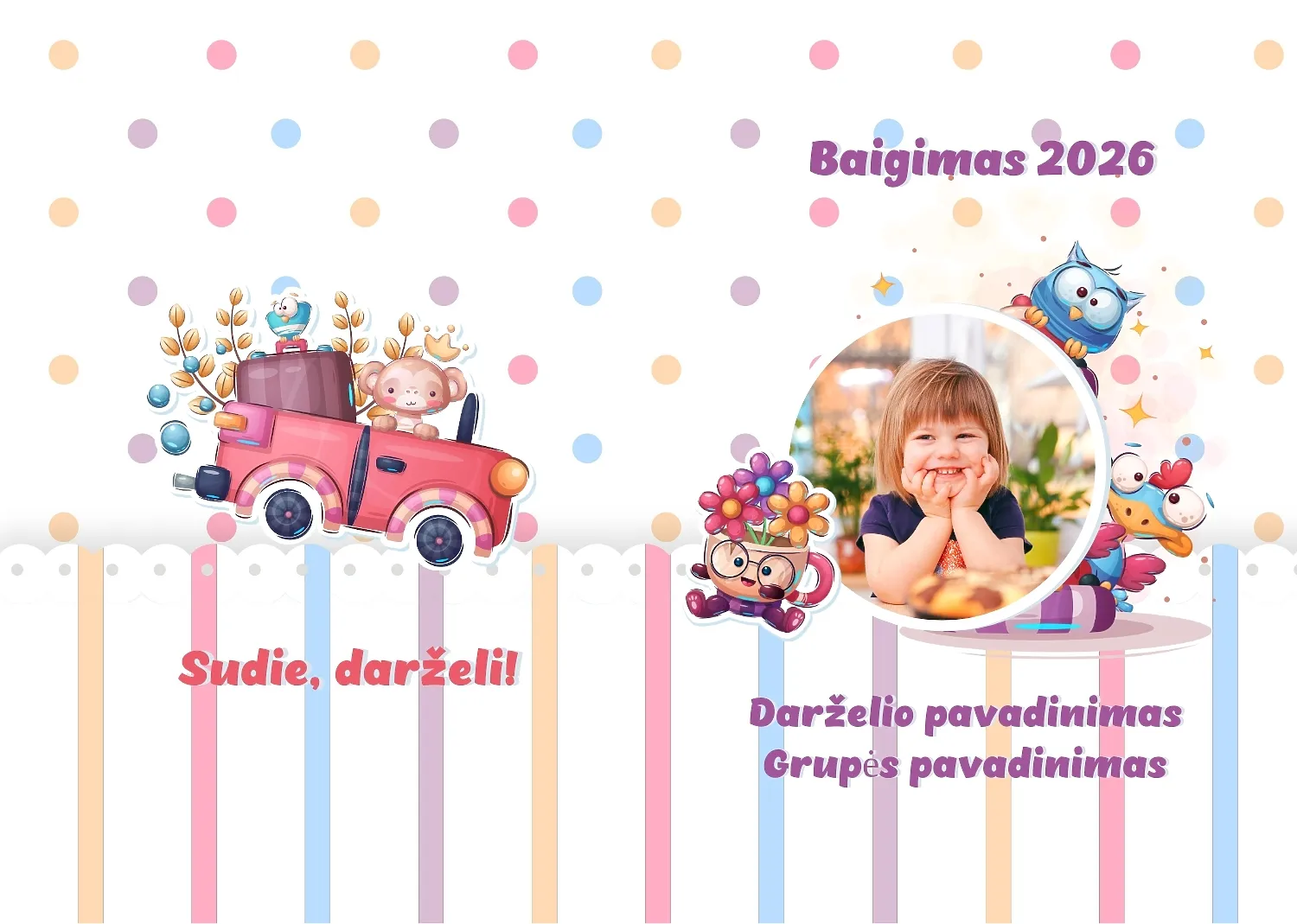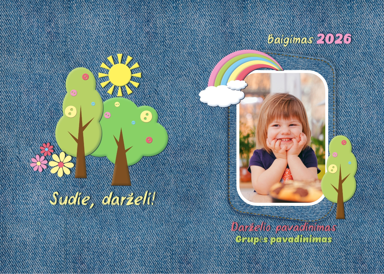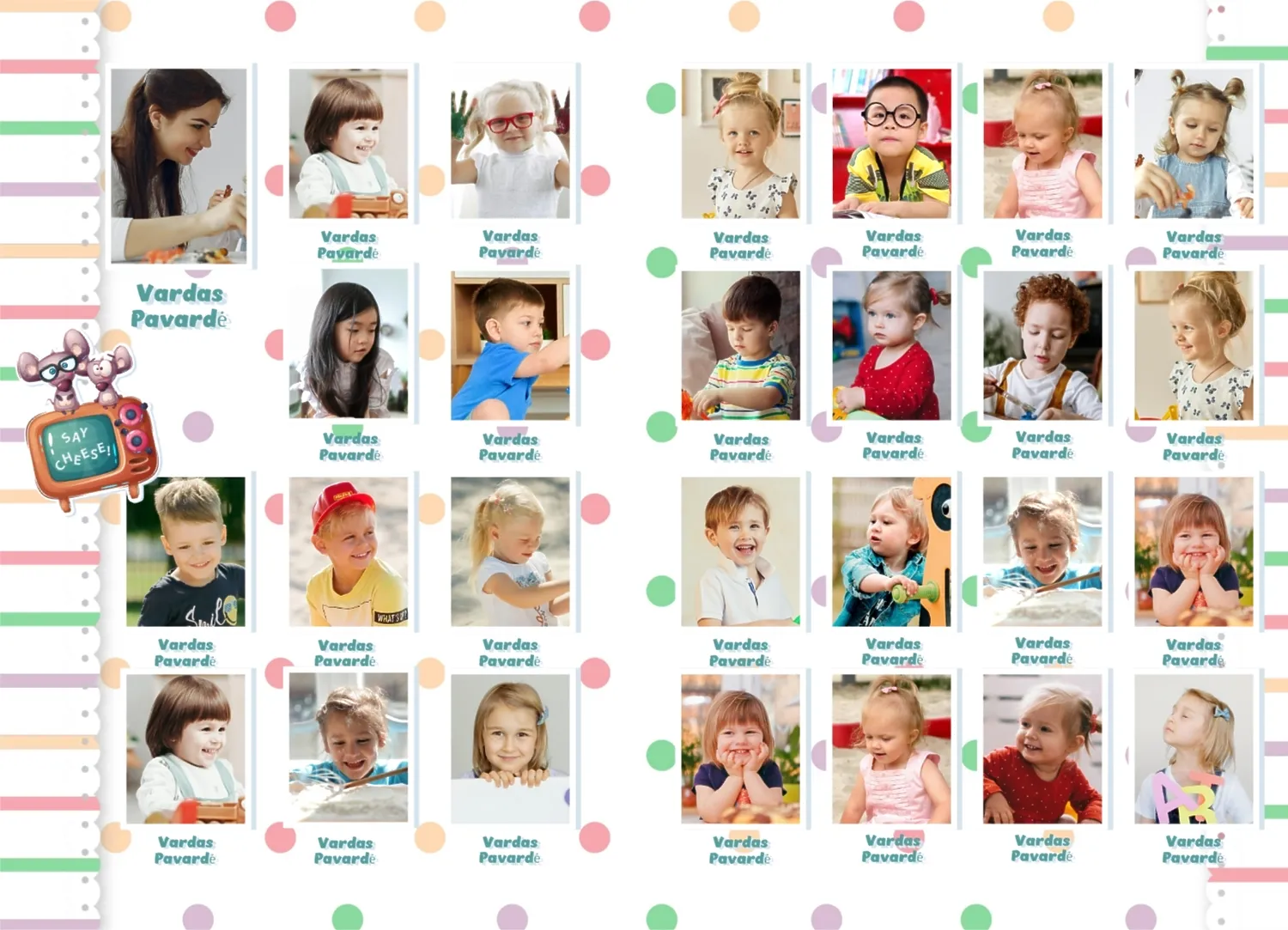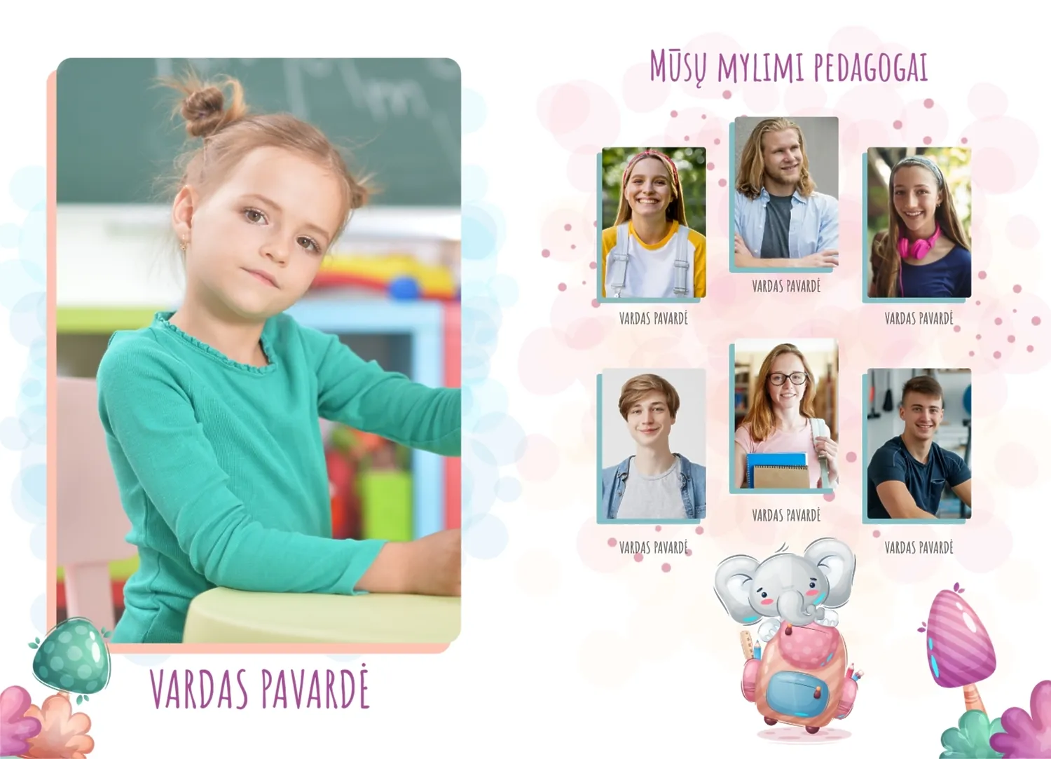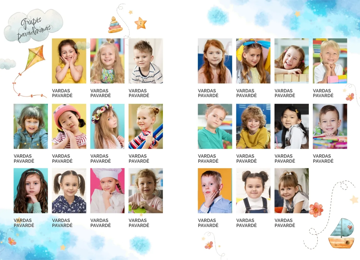Baigtas kieto viršelio vaikų darželio fotoknygos su kosminiu dizainu šablonas yra originalus atminimo albumo dizaino sprendimas. Ryškios žvaigždžių, planetų ir raketų iliustracijos sukuria įspūdingos kelionės atmosferą, pabrėžiant šio svarbaus momento ypatumą vaikų gyvenime. Šis stilius patiks ne tik vaikams, bet ir tėvams, nes jis daro fotoknygą ryškią, dinamišką ir nepanašią į standartinius albumus. Šis šablonas yra specialiai sukurtas naudoti mūsų internetiniame dizaineryje, kur kiekvienas gali lengvai pritaikyti išdėstymą pagal savo pageidavimus. Galite pakeisti foną, pasirinkti kitus dekoratyvinius elementus, pridėti mokinių ir mokytojų vardus, įterpti asmeninius parašus ir pageidavimus. Toks modelis gali būti tinkamas ne tik darželiui, bet ir mokytojams, dirbantiems ikimokykliniame ugdyme, pedagogams ir animatoriams.