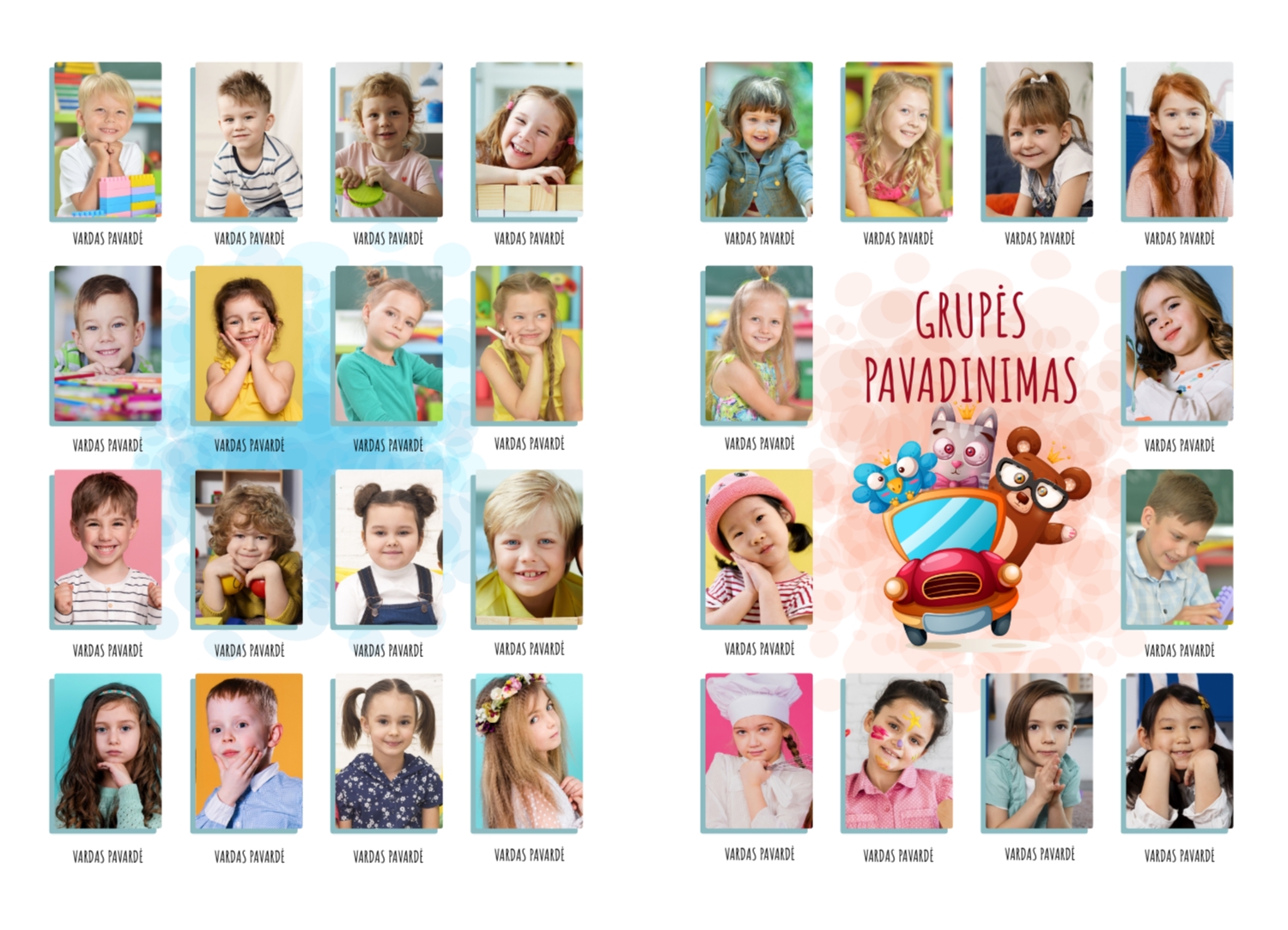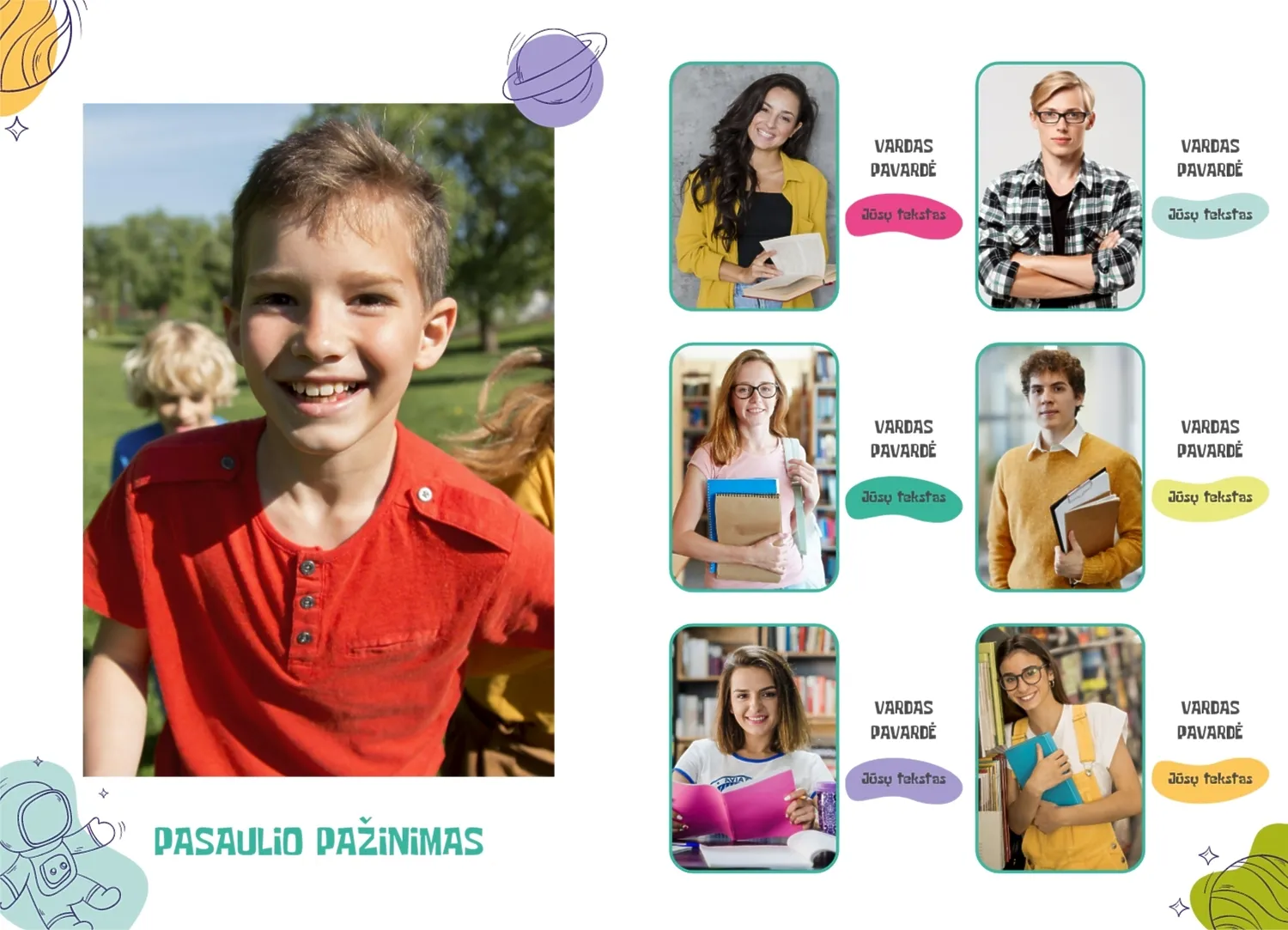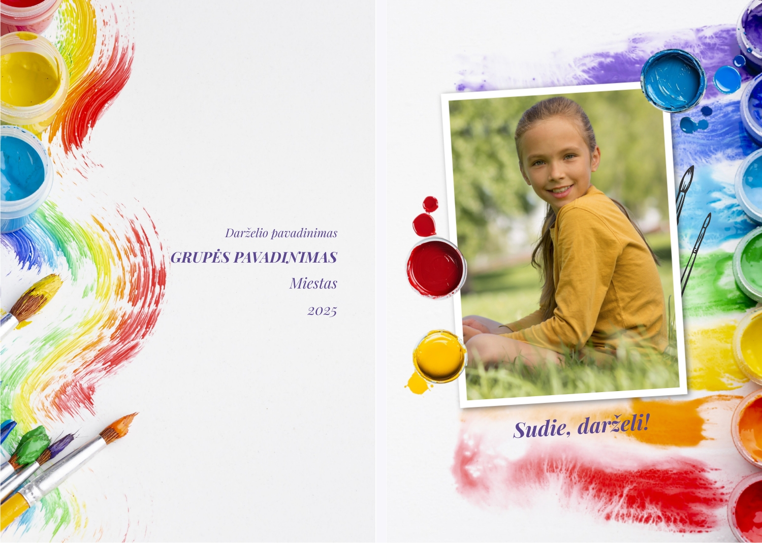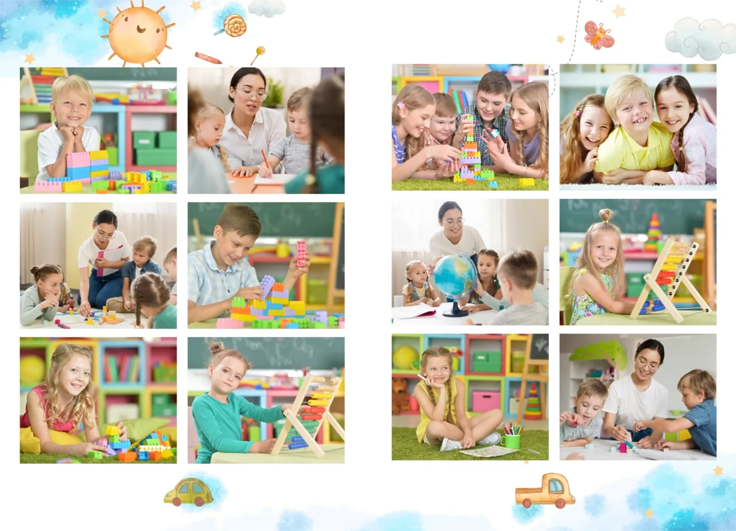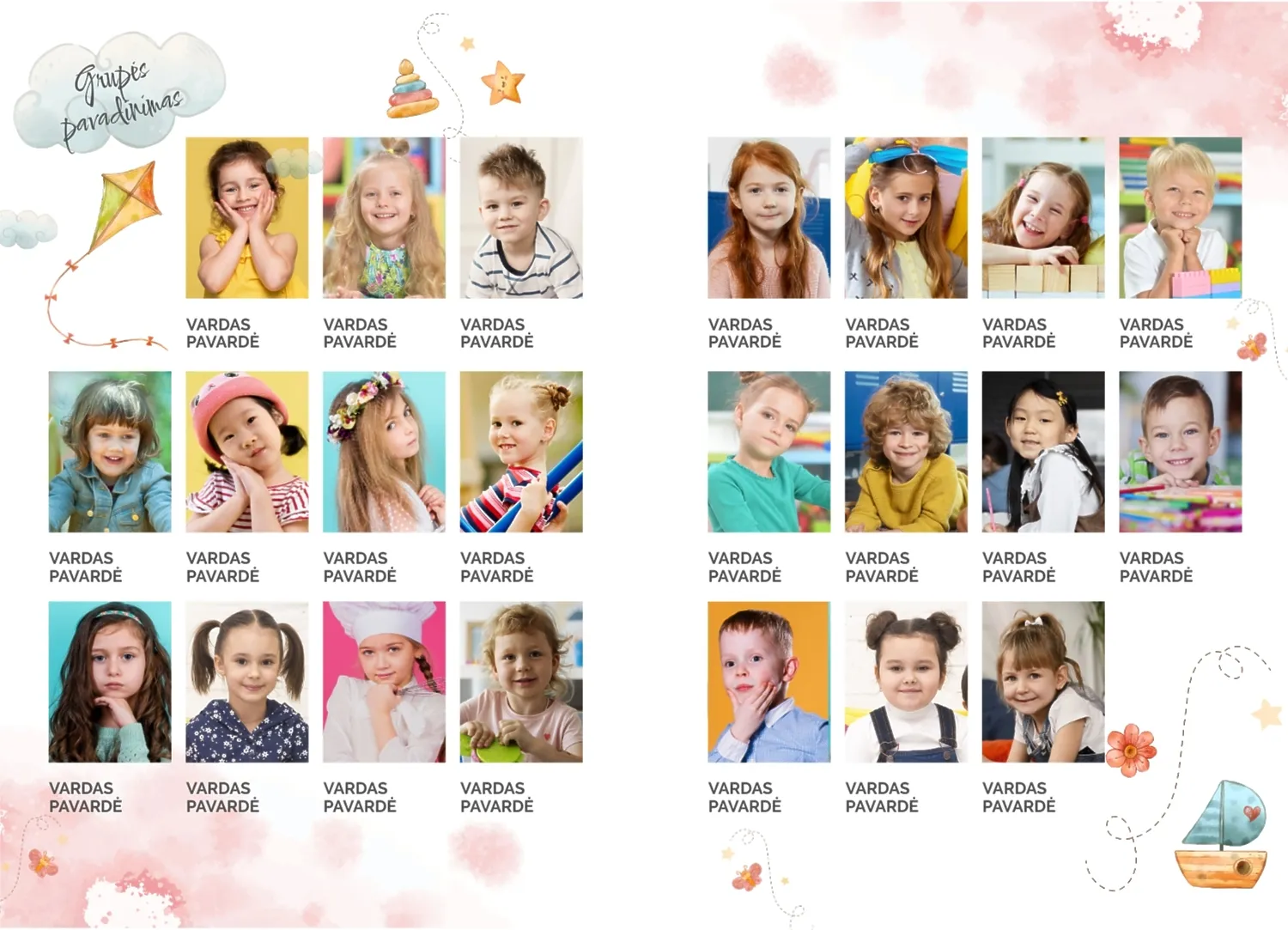 Baigtas kieto viršelio vaikų darželio fotoknygos su kosminiu dizainu šablonas yra originalus atminimo albumo dizaino sprendimas. Ryškios žvaigždžių, planetų ir raketų iliustracijos sukuria įspūdingos kelionės atmosferą, pabrėžiant šio svarbaus momento ypatumą vaikų gyvenime. Šis stilius patiks ne tik vaikams, bet ir tėvams, nes jis daro fotoknygą ryškią, dinamišką ir nepanašią į standartinius albumus. Šis šablonas yra specialiai sukurtas naudoti mūsų internetiniame dizaineryje, kur kiekvienas gali lengvai pritaikyti išdėstymą pagal savo pageidavimus. Galite pakeisti foną, pasirinkti kitus dekoratyvinius elementus, pridėti mokinių ir mokytojų vardus, įterpti asmeninius parašus ir pageidavimus. Toks modelis gali būti tinkamas ne tik darželiui, bet ir mokytojams, dirbantiems ikimokykliniame ugdyme, pedagogams ir animatoriams.