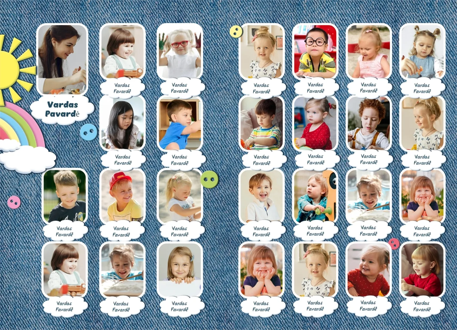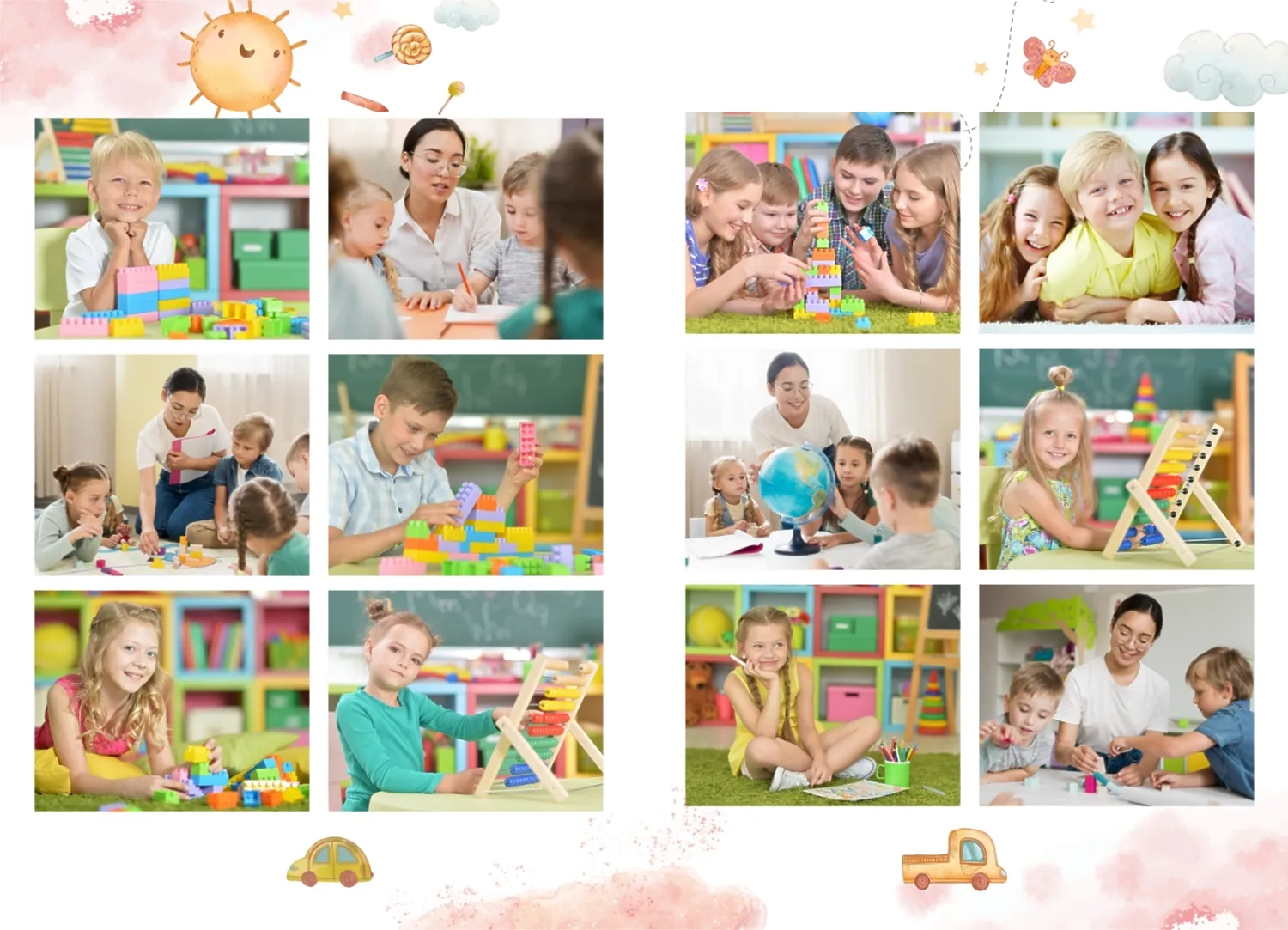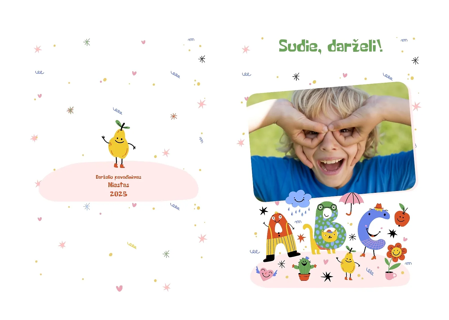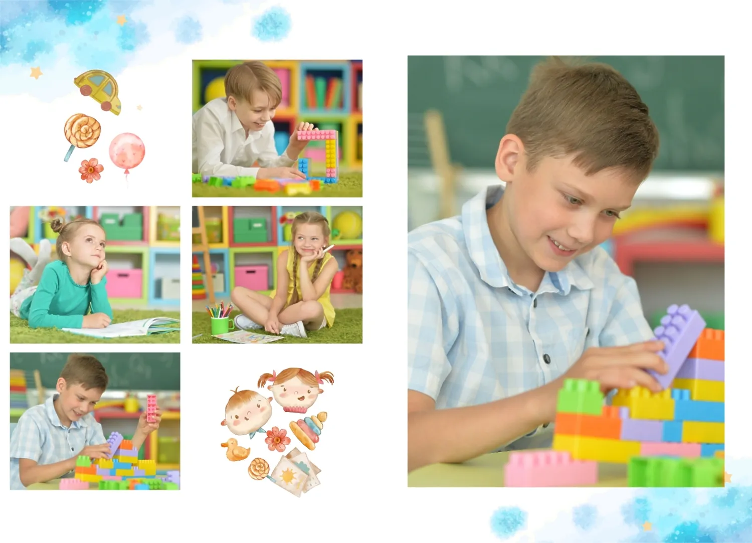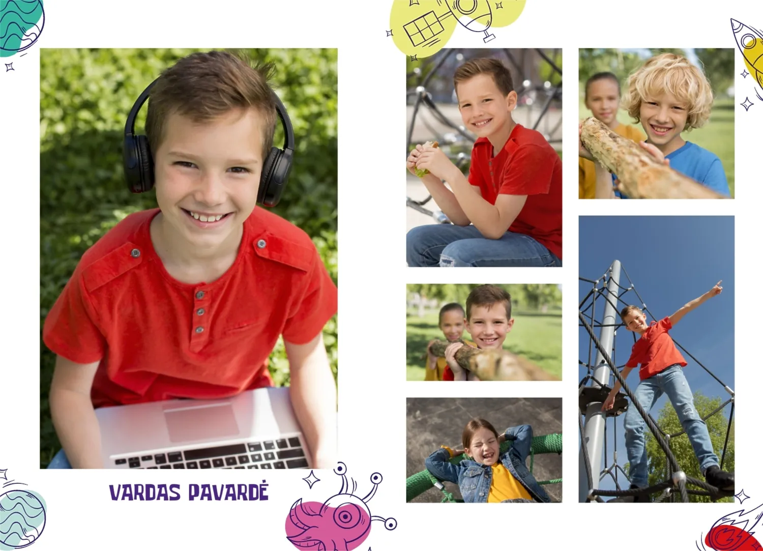 Baigtas kieto viršelio vaikų darželio fotoknygos su kosminiu dizainu šablonas yra originalus atminimo albumo dizaino sprendimas. Ryškios žvaigždžių, planetų ir raketų iliustracijos sukuria įspūdingos kelionės atmosferą, pabrėžiant šio svarbaus momento ypatumą vaikų gyvenime. Šis stilius patiks ne tik vaikams, bet ir tėvams, nes jis daro fotoknygą ryškią, dinamišką ir nepanašią į standartinius albumus. Šis šablonas yra specialiai sukurtas naudoti mūsų internetiniame dizaineryje, kur kiekvienas gali lengvai pritaikyti išdėstymą pagal savo pageidavimus. Galite pakeisti foną, pasirinkti kitus dekoratyvinius elementus, pridėti mokinių ir mokytojų vardus, įterpti asmeninius parašus ir pageidavimus. Toks modelis gali būti tinkamas ne tik darželiui, bet ir mokytojams, dirbantiems ikimokykliniame ugdyme, pedagogams ir animatoriams.