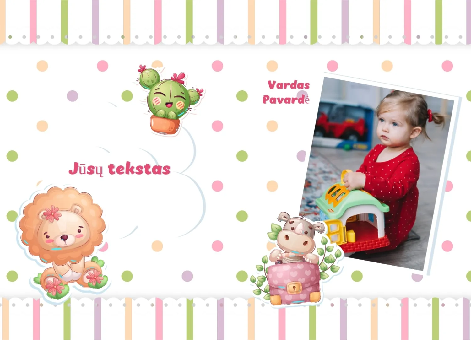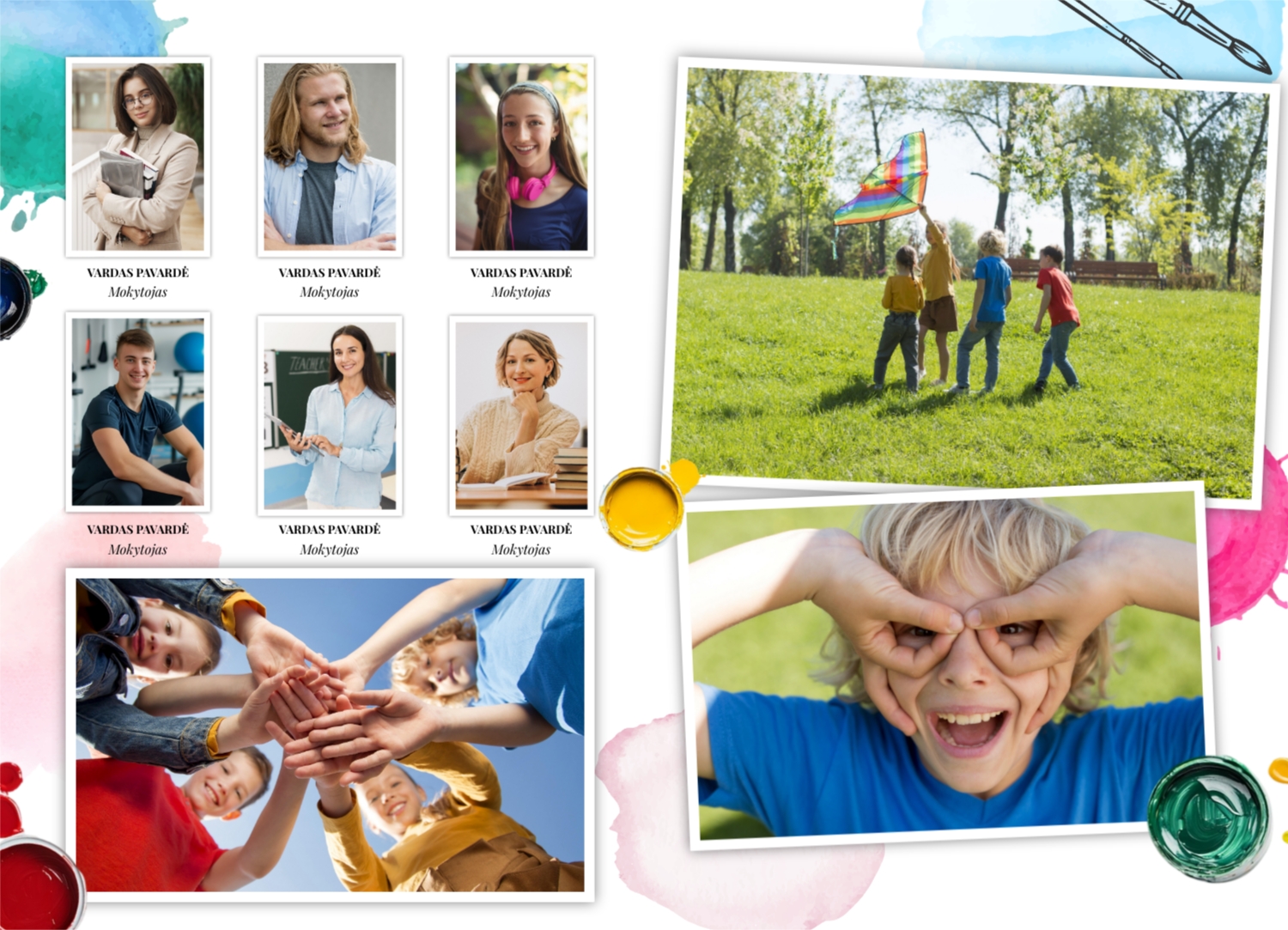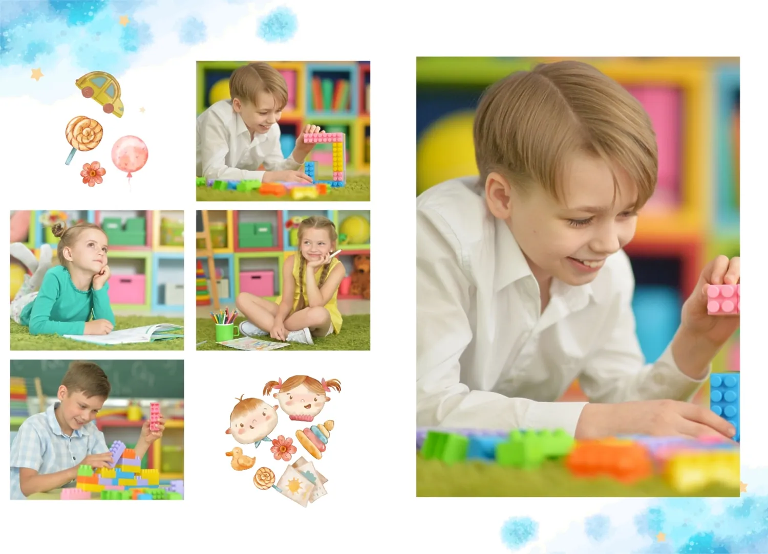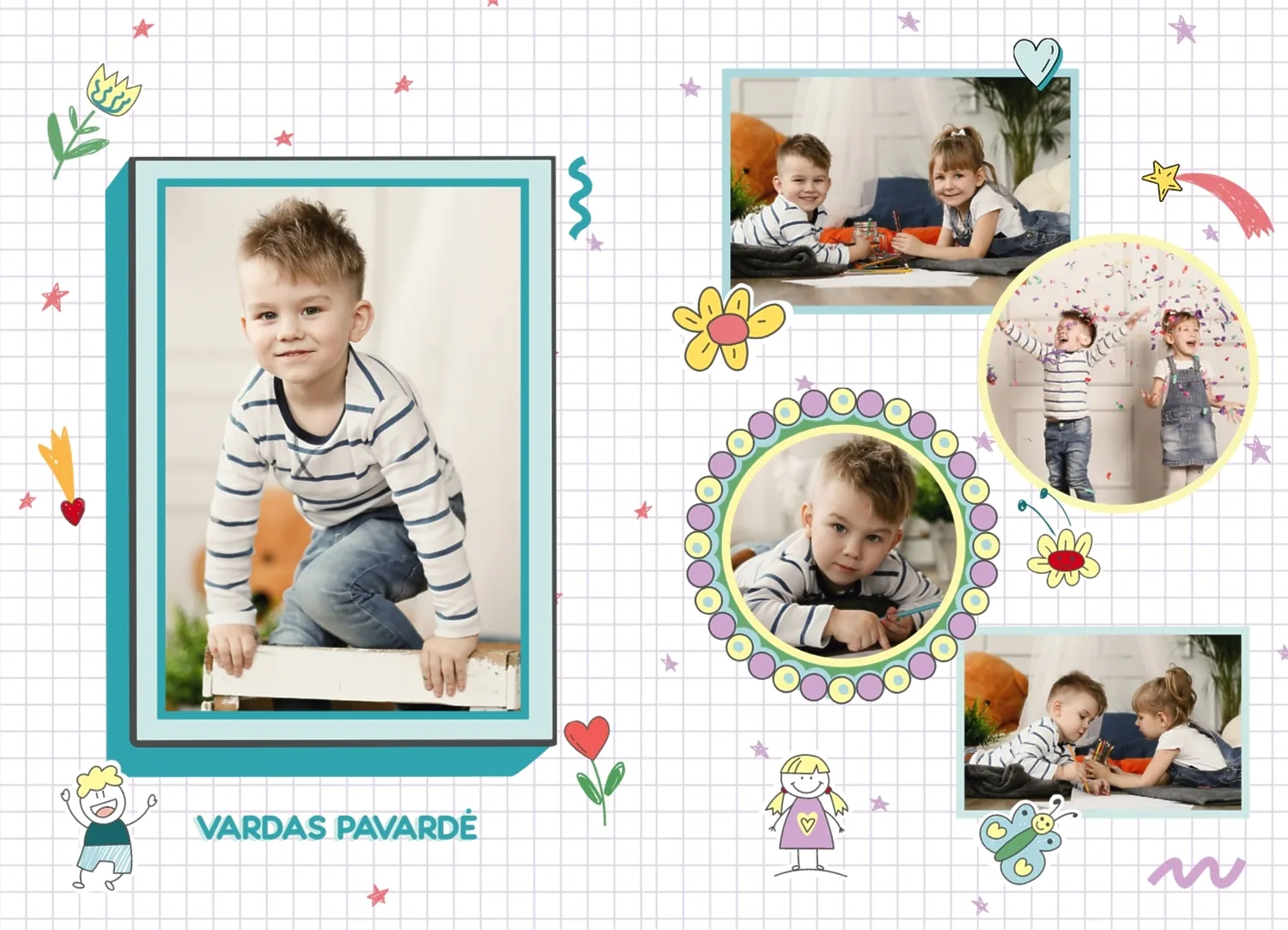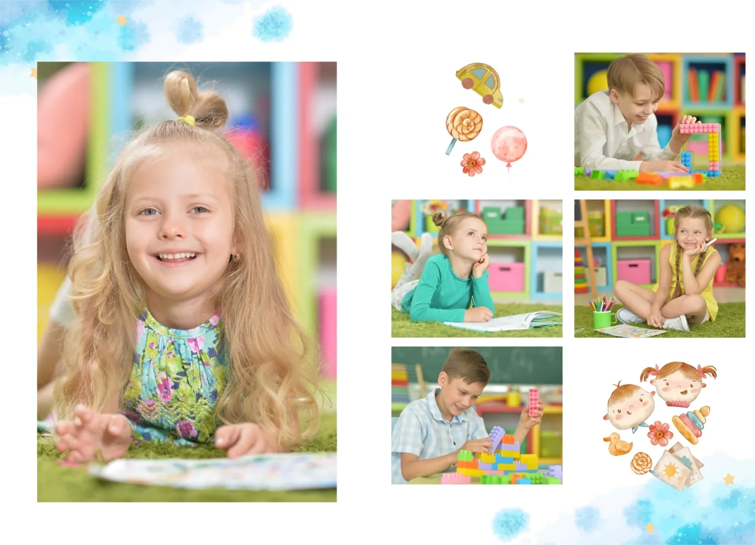 Baigtas kieto viršelio vaikų darželio fotoknygos su kosminiu dizainu šablonas yra originalus atminimo albumo dizaino sprendimas. Ryškios žvaigždžių, planetų ir raketų iliustracijos sukuria įspūdingos kelionės atmosferą, pabrėžiant šio svarbaus momento ypatumą vaikų gyvenime. Šis stilius patiks ne tik vaikams, bet ir tėvams, nes jis daro fotoknygą ryškią, dinamišką ir nepanašią į standartinius albumus. Šis šablonas yra specialiai sukurtas naudoti mūsų internetiniame dizaineryje, kur kiekvienas gali lengvai pritaikyti išdėstymą pagal savo pageidavimus. Galite pakeisti foną, pasirinkti kitus dekoratyvinius elementus, pridėti mokinių ir mokytojų vardus, įterpti asmeninius parašus ir pageidavimus. Toks modelis gali būti tinkamas ne tik darželiui, bet ir mokytojams, dirbantiems ikimokykliniame ugdyme, pedagogams ir animatoriams.
