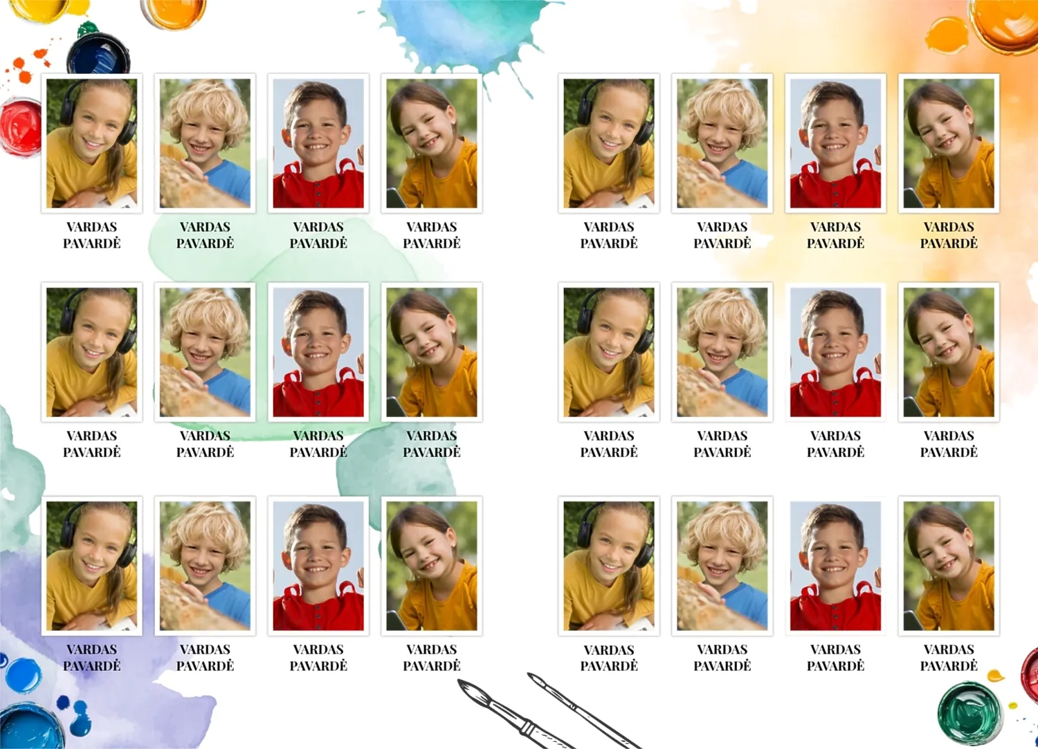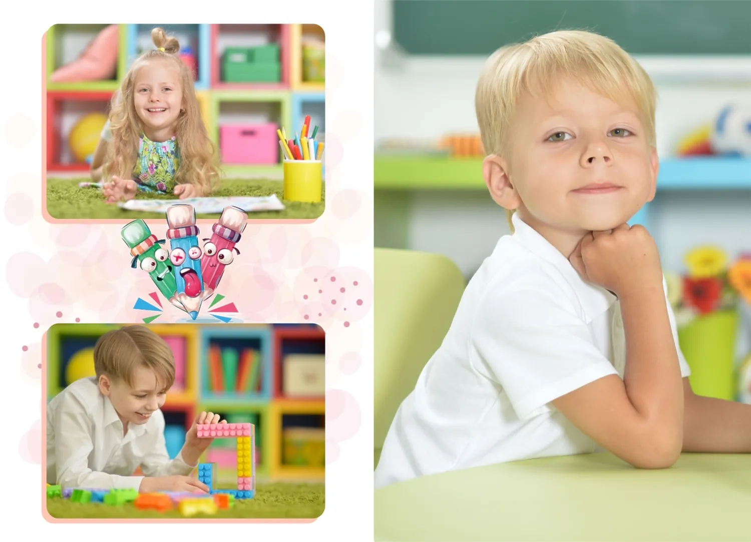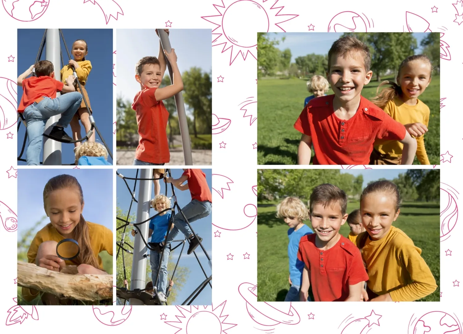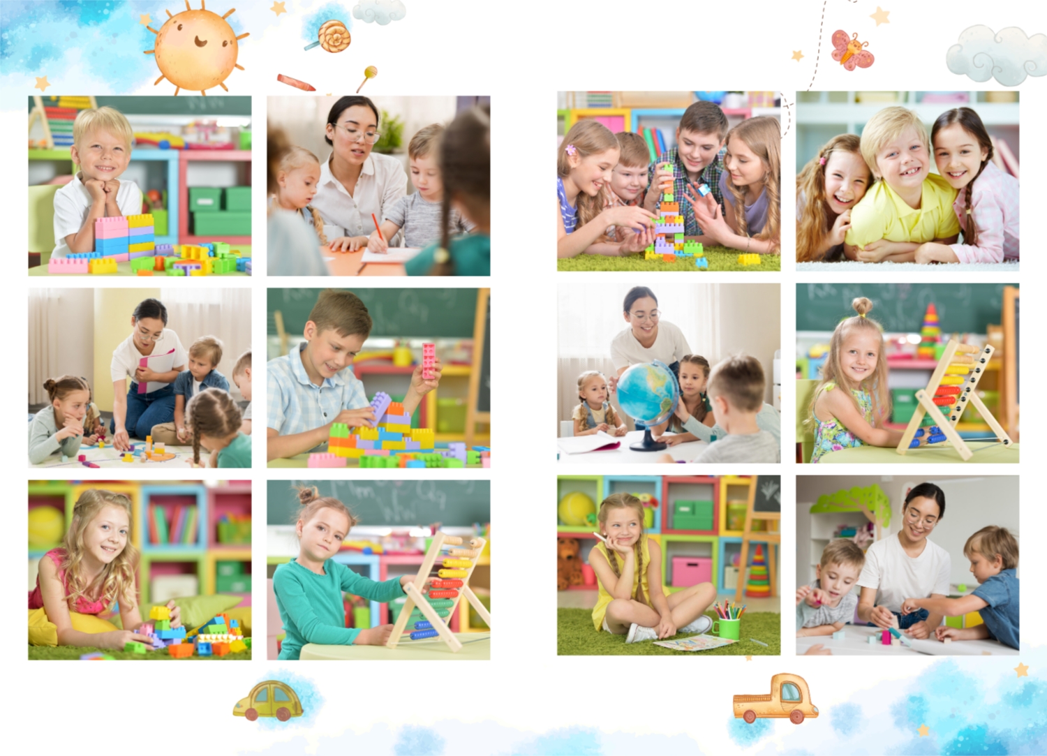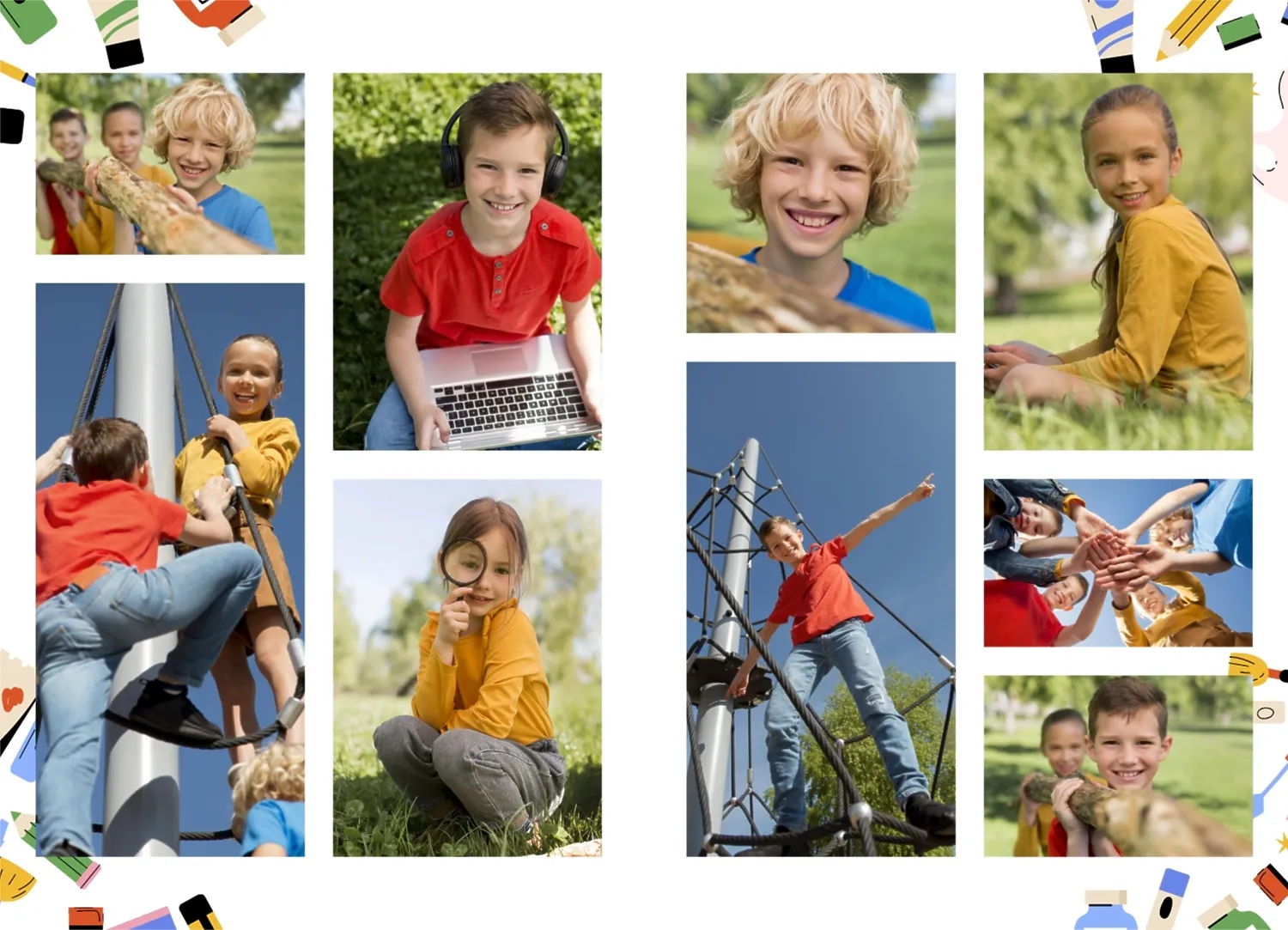 Baigtas kieto viršelio vaikų darželio fotoknygos su kosminiu dizainu šablonas yra originalus atminimo albumo dizaino sprendimas. Ryškios žvaigždžių, planetų ir raketų iliustracijos sukuria įspūdingos kelionės atmosferą, pabrėžiant šio svarbaus momento ypatumą vaikų gyvenime. Šis stilius patiks ne tik vaikams, bet ir tėvams, nes jis daro fotoknygą ryškią, dinamišką ir nepanašią į standartinius albumus. Šis šablonas yra specialiai sukurtas naudoti mūsų internetiniame dizaineryje, kur kiekvienas gali lengvai pritaikyti išdėstymą pagal savo pageidavimus. Galite pakeisti foną, pasirinkti kitus dekoratyvinius elementus, pridėti mokinių ir mokytojų vardus, įterpti asmeninius parašus ir pageidavimus. Toks modelis gali būti tinkamas ne tik darželiui, bet ir mokytojams, dirbantiems ikimokykliniame ugdyme, pedagogams ir animatoriams.