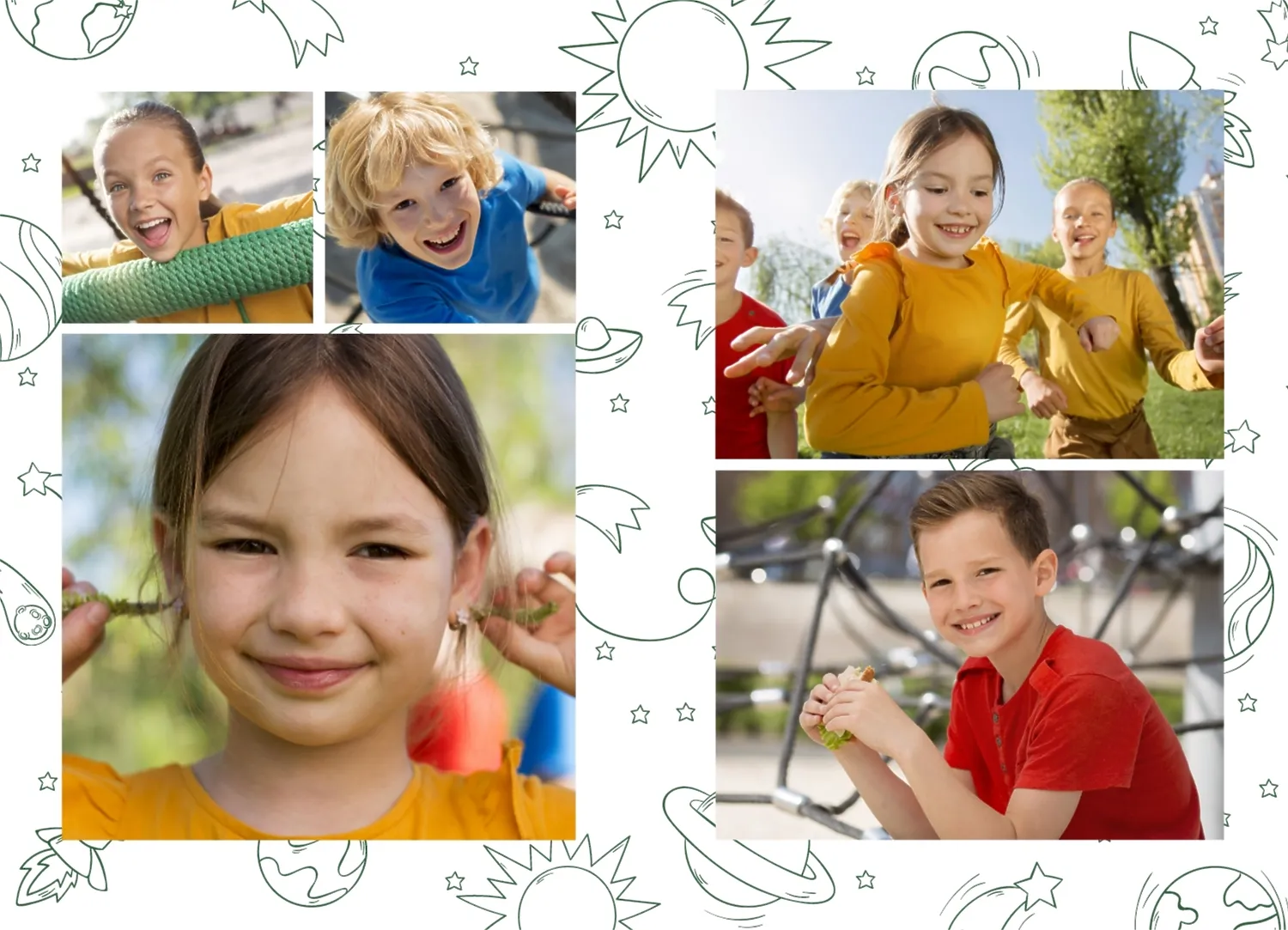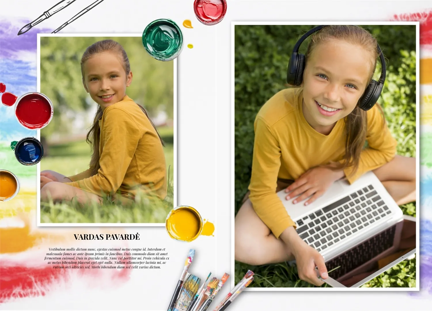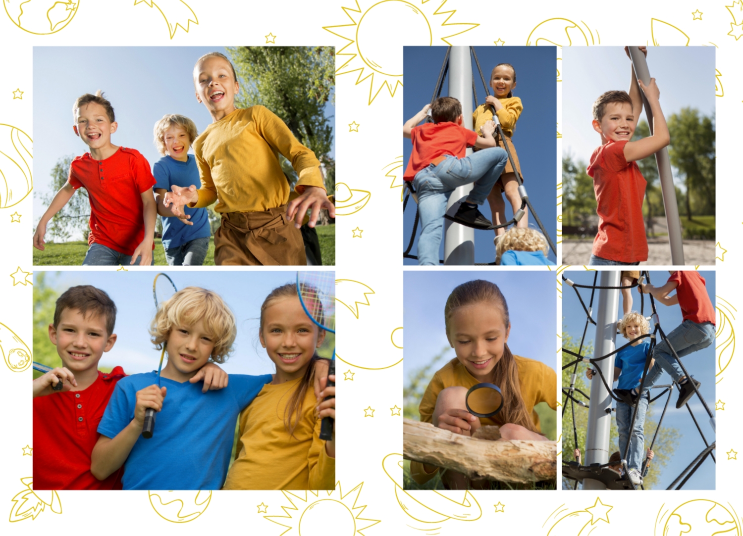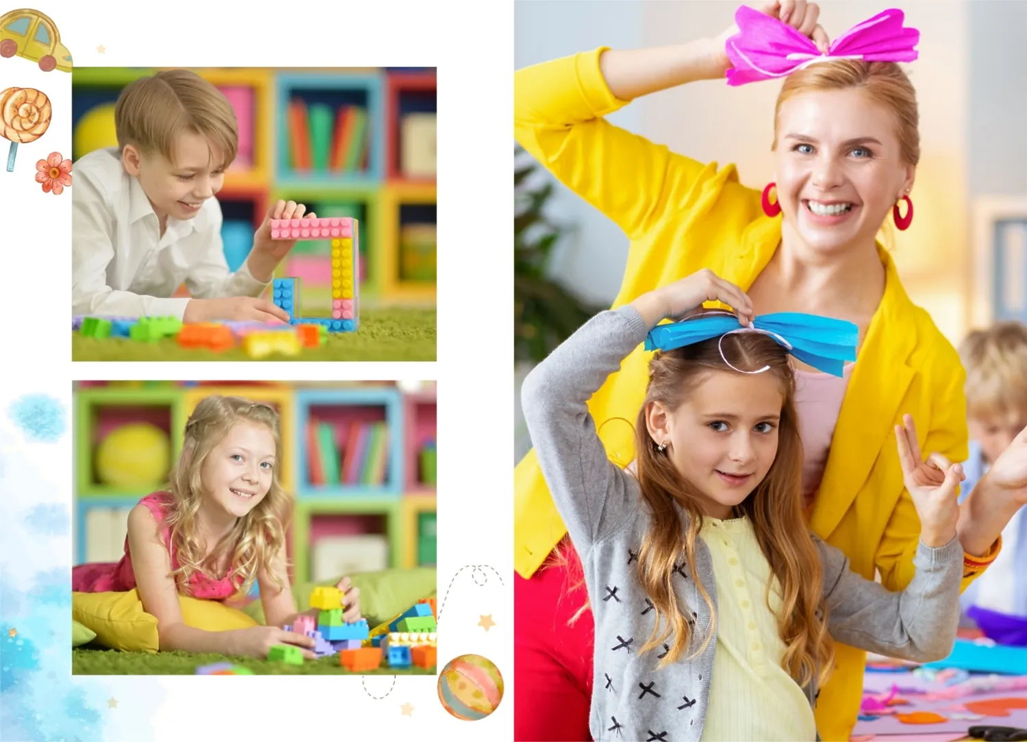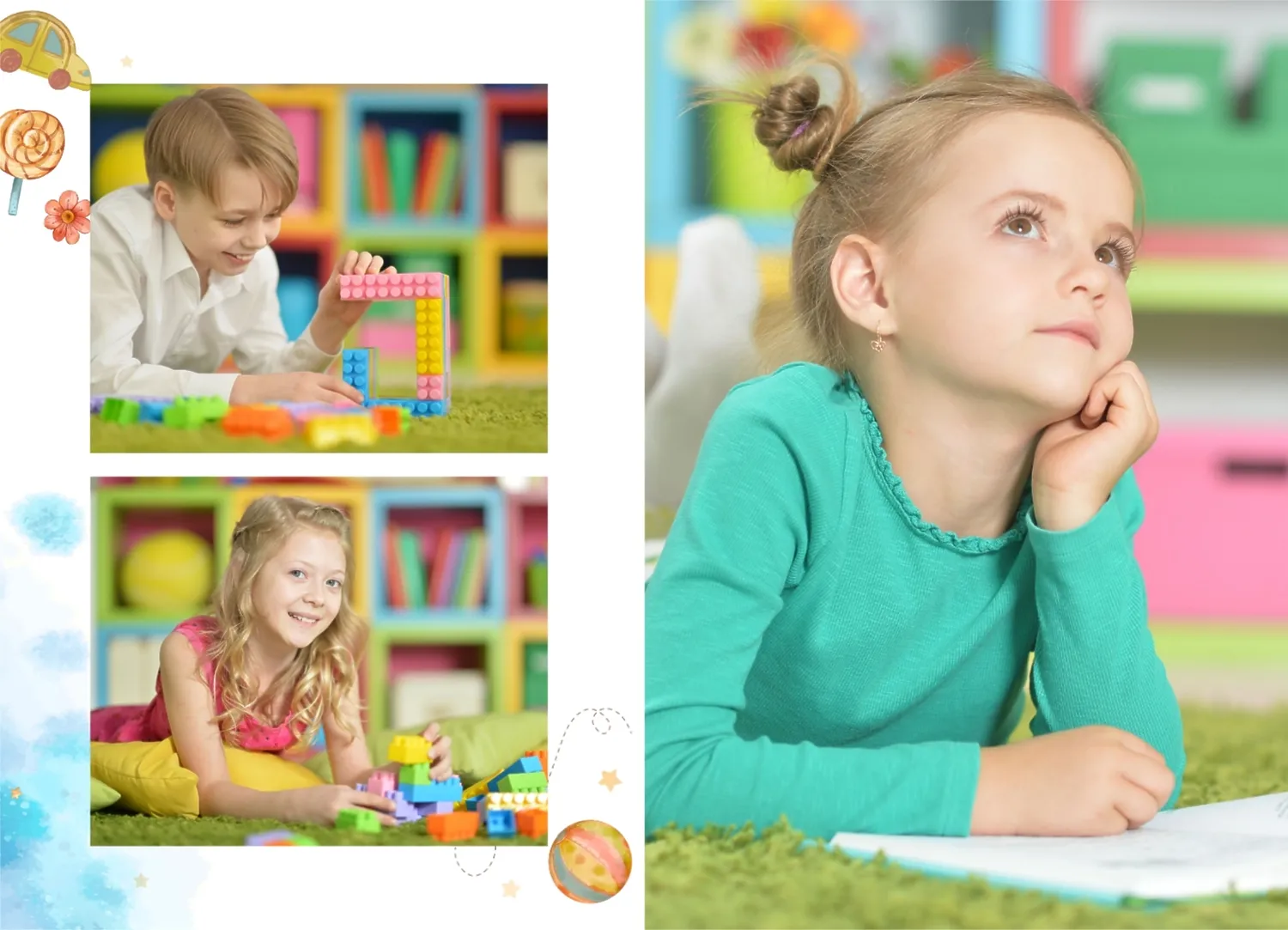 Baigtas kieto viršelio vaikų darželio fotoknygos su kosminiu dizainu šablonas yra originalus atminimo albumo dizaino sprendimas. Ryškios žvaigždžių, planetų ir raketų iliustracijos sukuria įspūdingos kelionės atmosferą, pabrėžiant šio svarbaus momento ypatumą vaikų gyvenime. Šis stilius patiks ne tik vaikams, bet ir tėvams, nes jis daro fotoknygą ryškią, dinamišką ir nepanašią į standartinius albumus. Šis šablonas yra specialiai sukurtas naudoti mūsų internetiniame dizaineryje, kur kiekvienas gali lengvai pritaikyti išdėstymą pagal savo pageidavimus. Galite pakeisti foną, pasirinkti kitus dekoratyvinius elementus, pridėti mokinių ir mokytojų vardus, įterpti asmeninius parašus ir pageidavimus. Toks modelis gali būti tinkamas ne tik darželiui, bet ir mokytojams, dirbantiems ikimokykliniame ugdyme, pedagogams ir animatoriams.