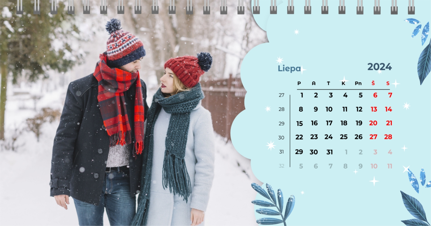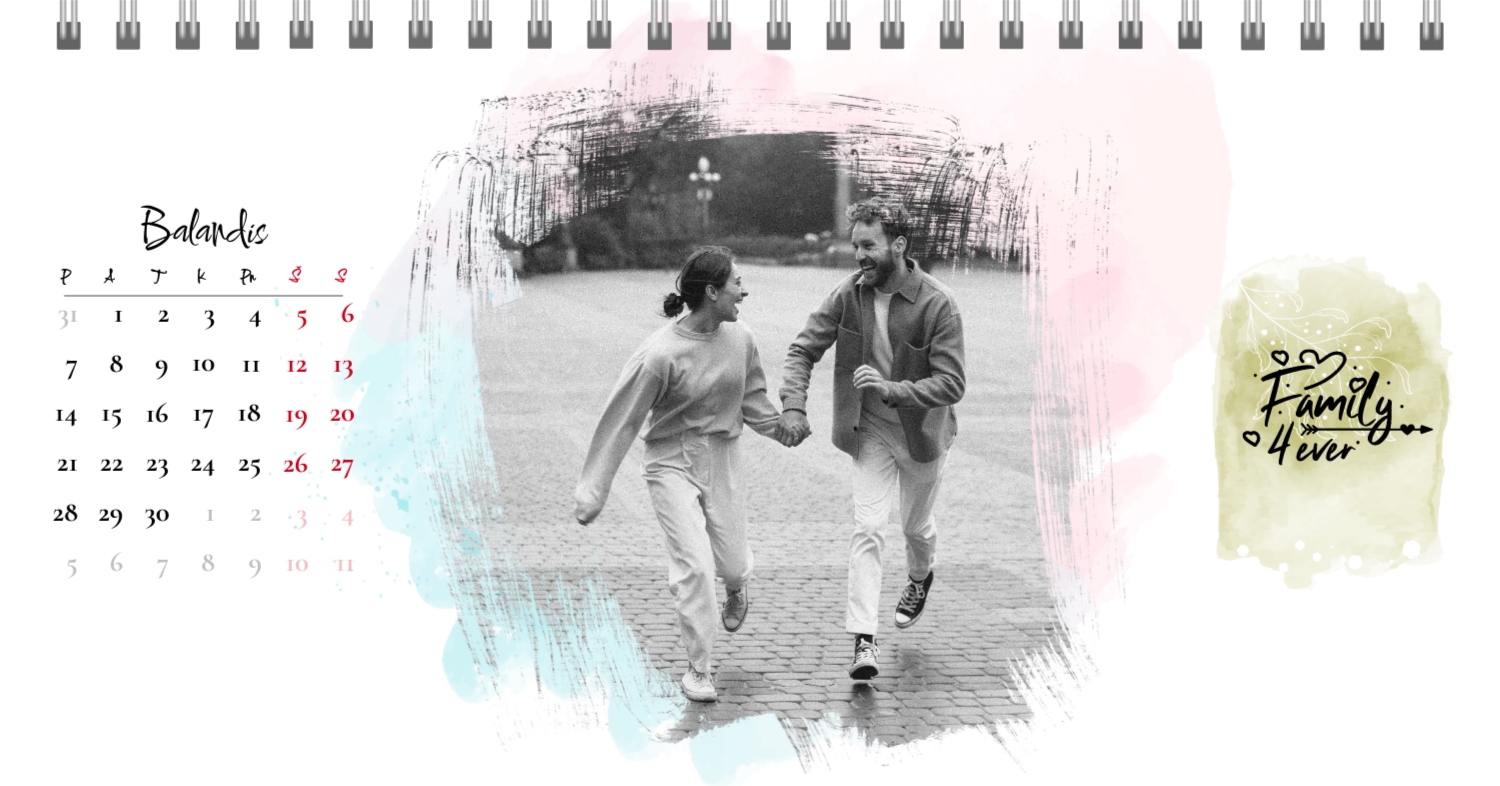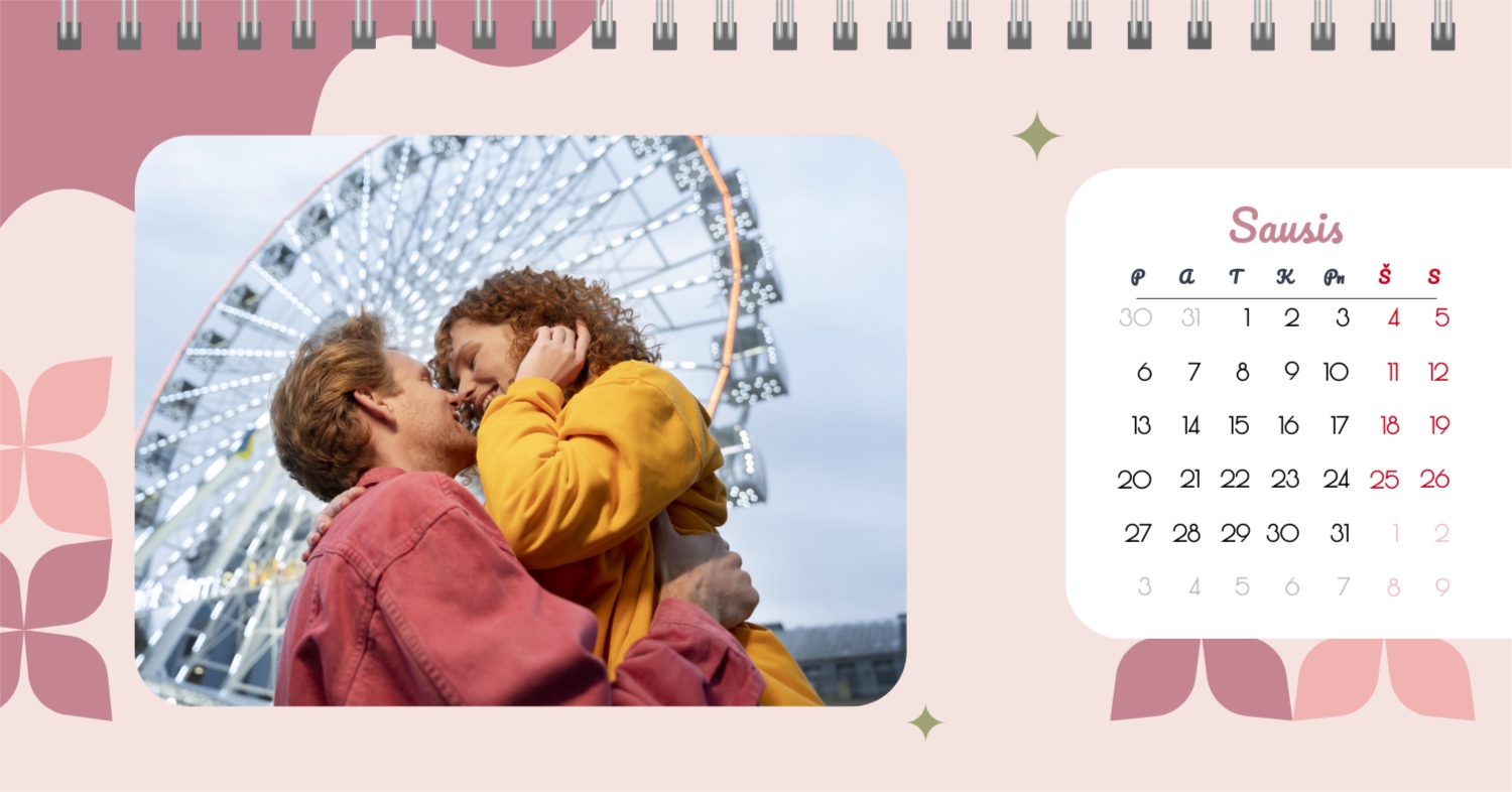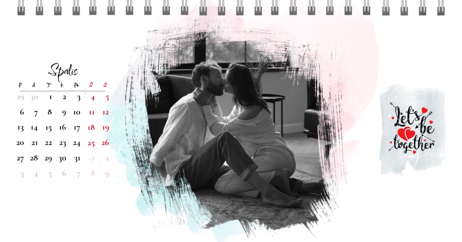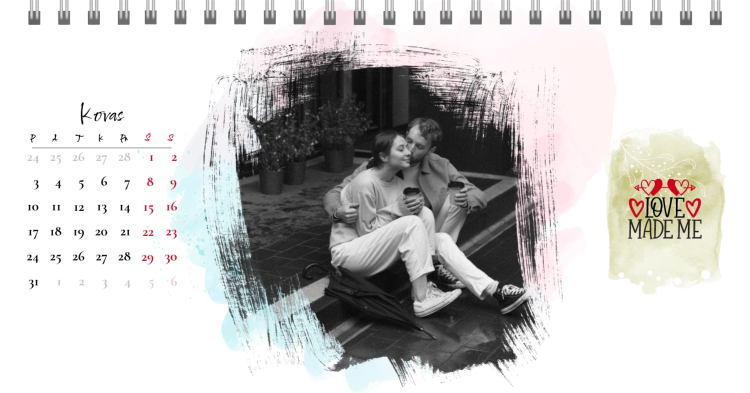 Paruoštas stalo kalendoriaus šablonas įsimylėjusioms poroms yra idealus būdas sukurti unikalią ir jaudinančią dovaną. Jame yra romantiškas dizainas, kuris pabrėžia ypatingą partnerių ryšį. Toks 13 puslapių Stalinis kalendorius gali būti ne tik malonus suvenyras, bet ir stilingas interjero elementas. Šis šablonas puikiai tinka fotografams, besispecializuojantiems love story, nes juo galima gražiai apipavidalinti profesionalias nuotraukas. Pagrindinis šio kalendoriaus privalumas yra galimybė visiškai individualizuoti mūsų internetinį dizainerį. Galite įkelti savo nuotraukas, pakeisti foną, pridėti įsimintinas datas, romantiškus užrašus ar net juokingus komentarus kiekvienam mėnesiui.