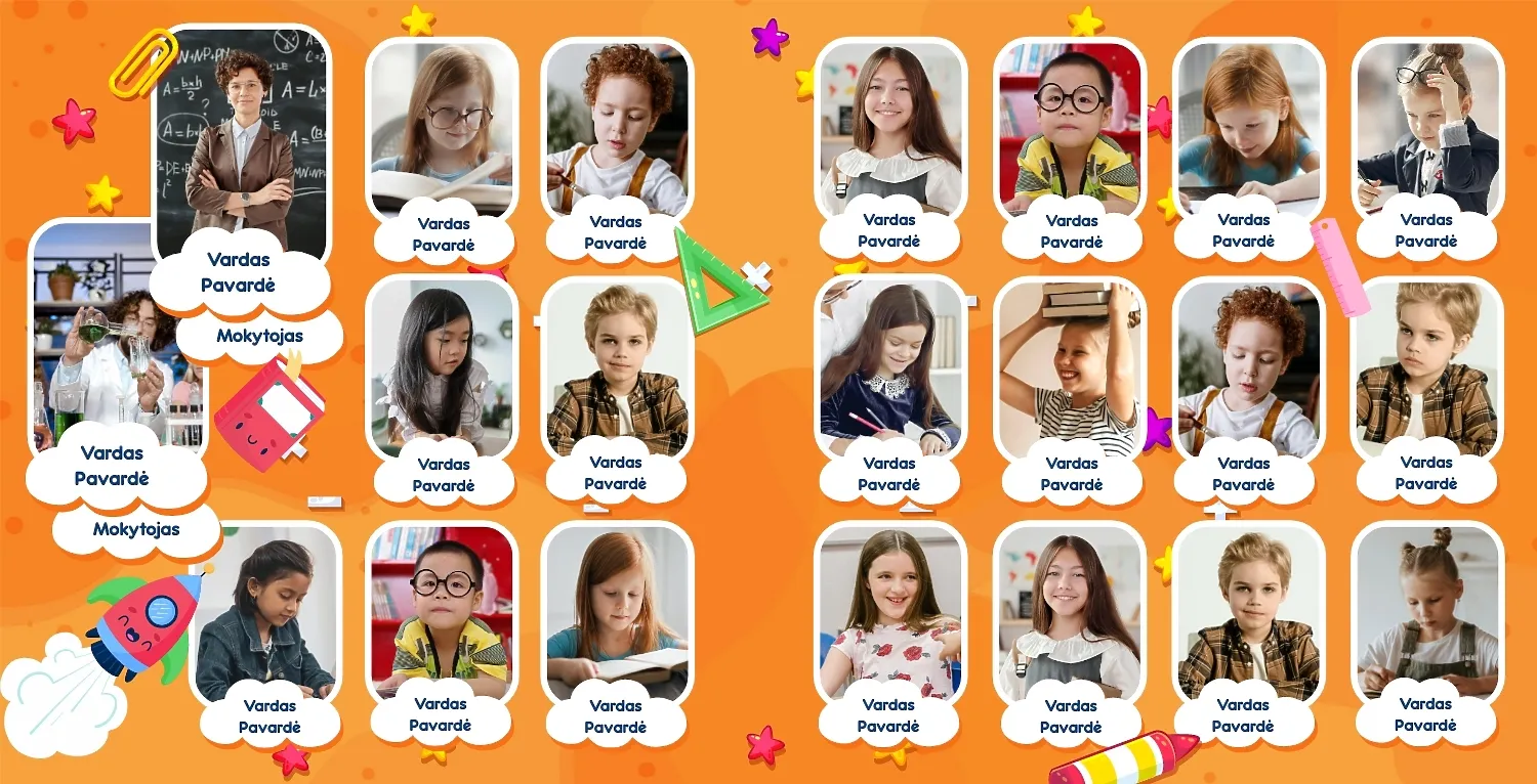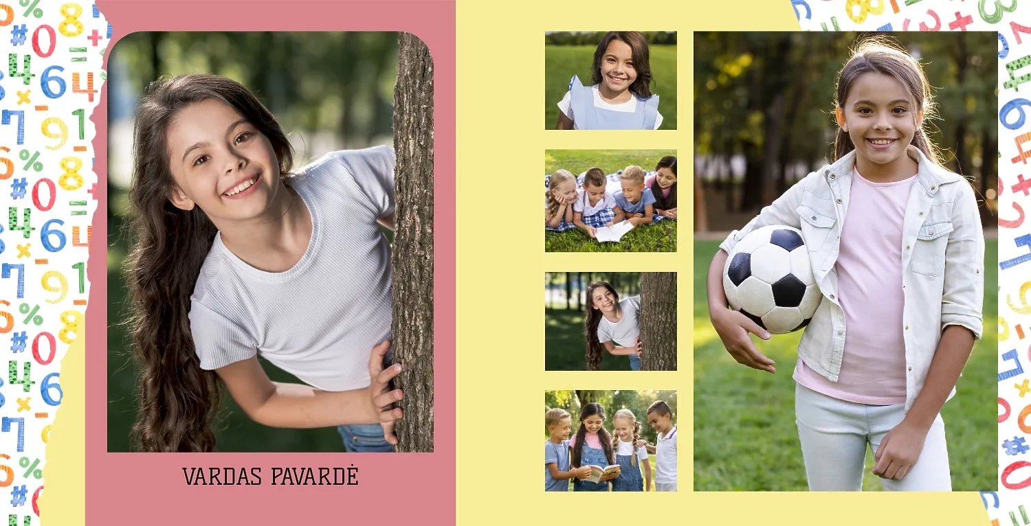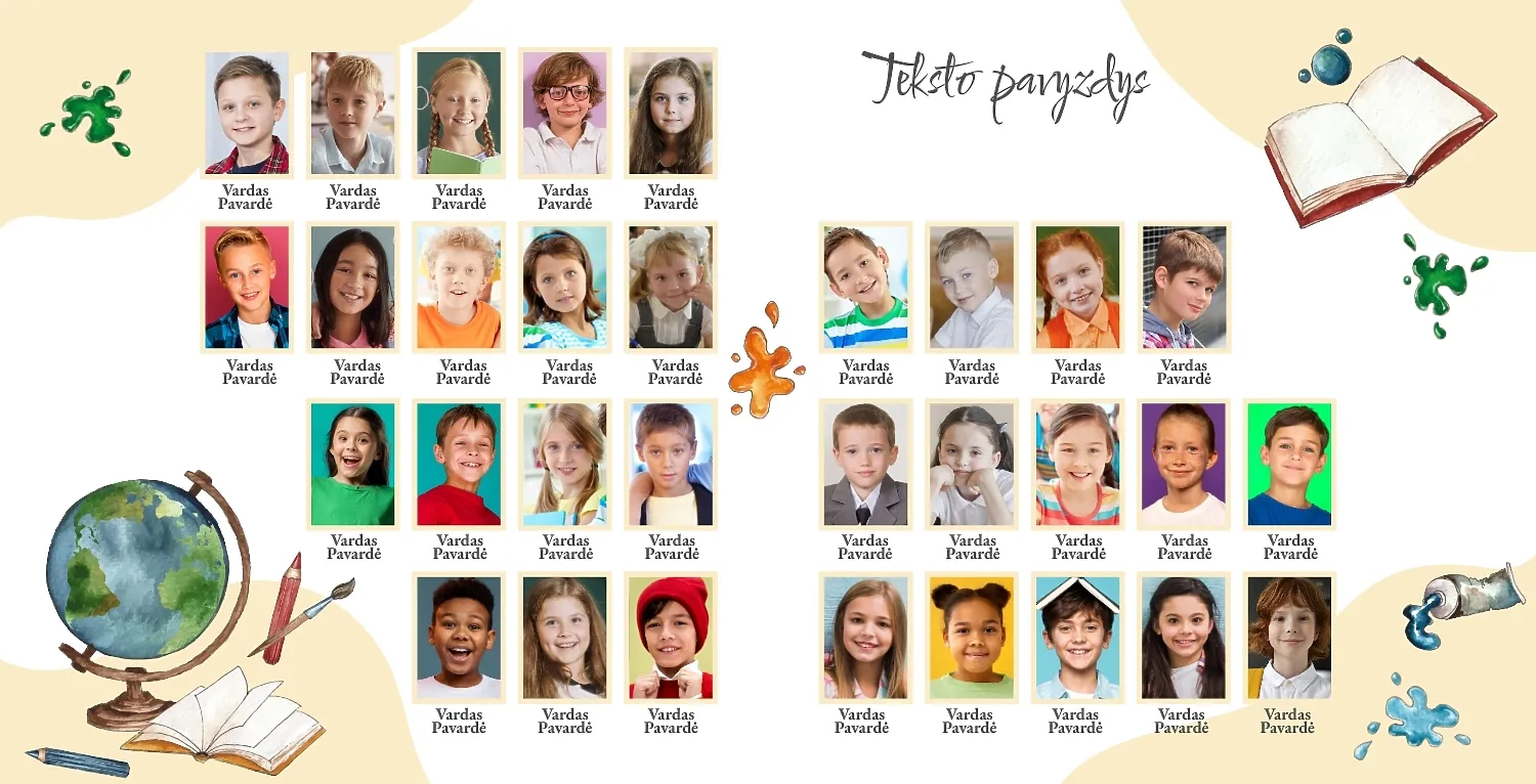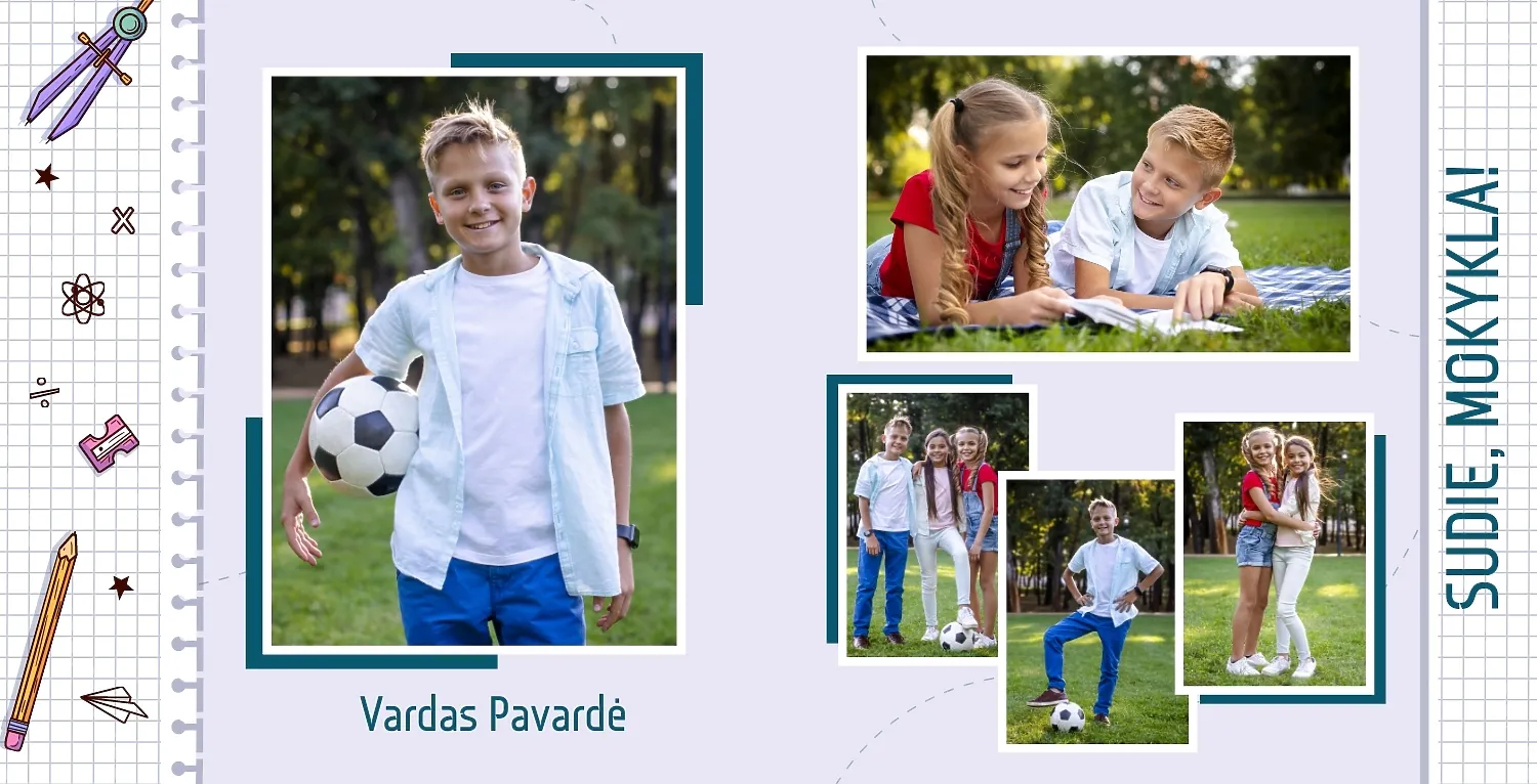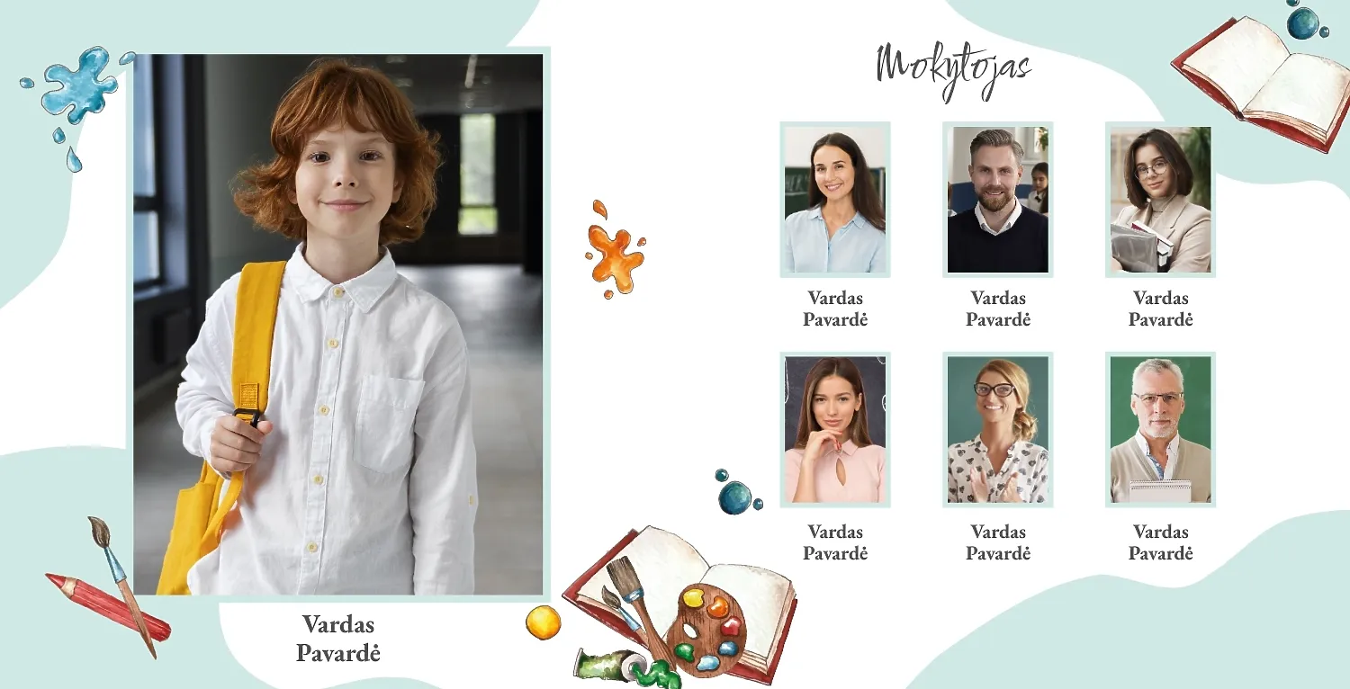 Baigimo fotoknygos šablonas jaunesniajai mokyklai-spalvingas ir jaudinantis apipavidalinimas, kuris padės išsaugoti pačius šilčiausius pirmųjų mokyklinių metų prisiminimus. Šablono dizainas sukurtas atsižvelgiant į vaikų temą: ryškios iliustracijos, subtilios spalvos, elementai, primenantys mokyklos gyvenimą – knygos, pieštukai, įrašų lentos. Internetiniame dizaineryje šį šabloną galima lengvai pakeisti, kad jis būtų unikalus. Vartotojas gali pridėti ir perkelti nuotraukas, keisti šriftus, redaguoti teksto blokus su pageidavimais ir parašais, taip pat pakeisti dekoratyvinius elementus tinkamesniu stiliumi. Galimybė pasirinkti spalvų schemą leidžia fotoknygą padaryti švelnesnę arba, atvirkščiai, prisotintą, priklausomai nuo pageidavimų. Jei pageidaujate, galite įterpti mokyklos logotipą arba individualias iliustracijas, kad pabrėžtumėte išleidimo ypatybę.