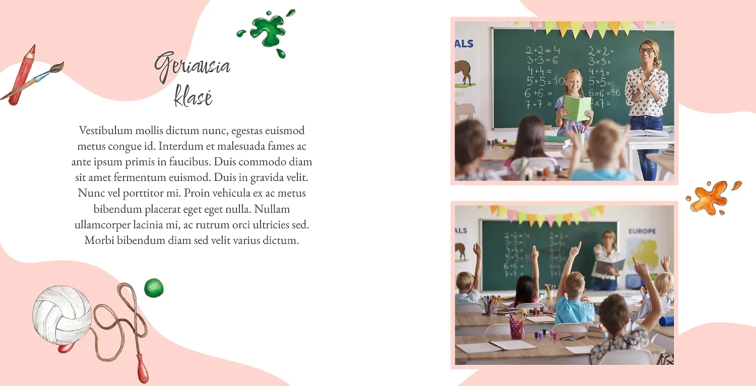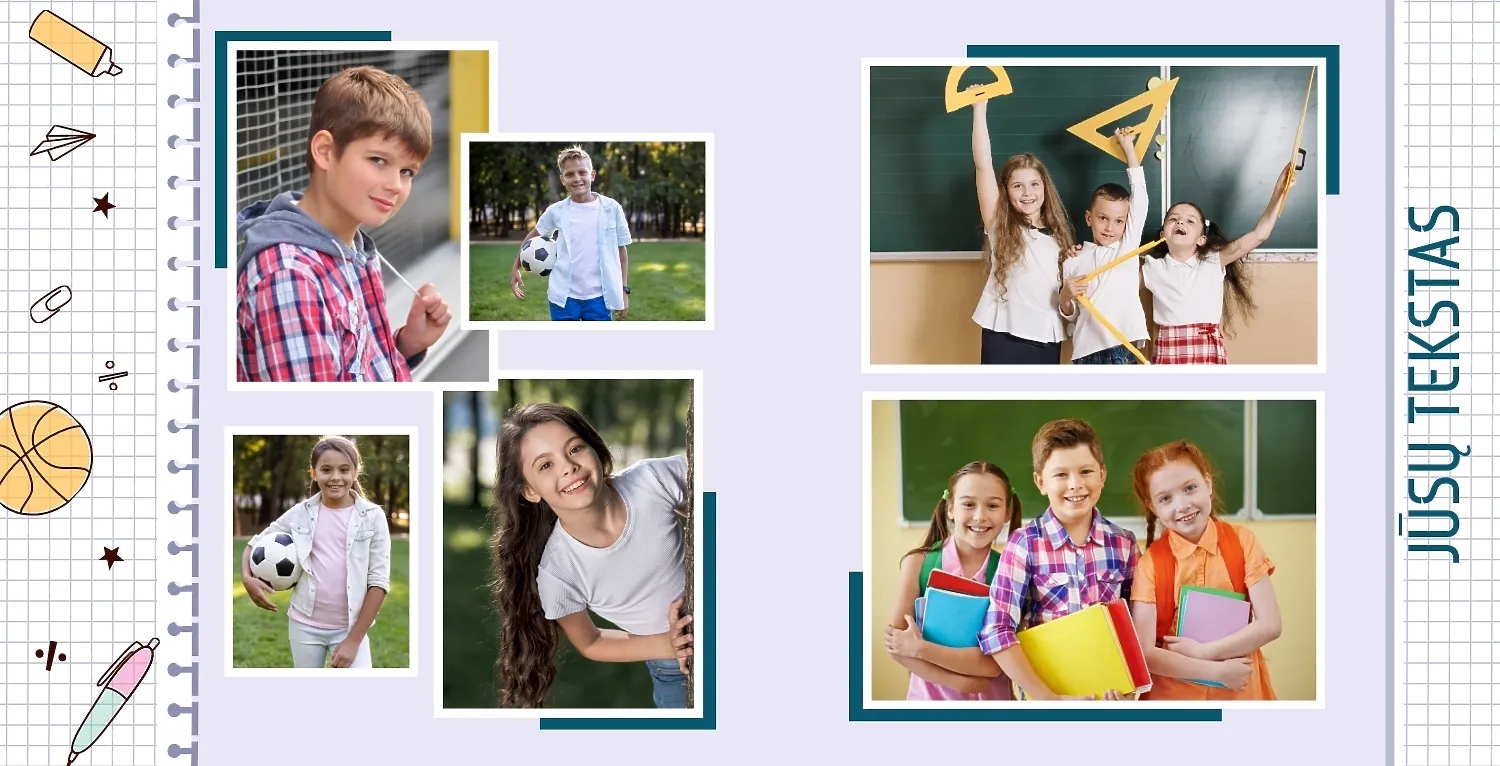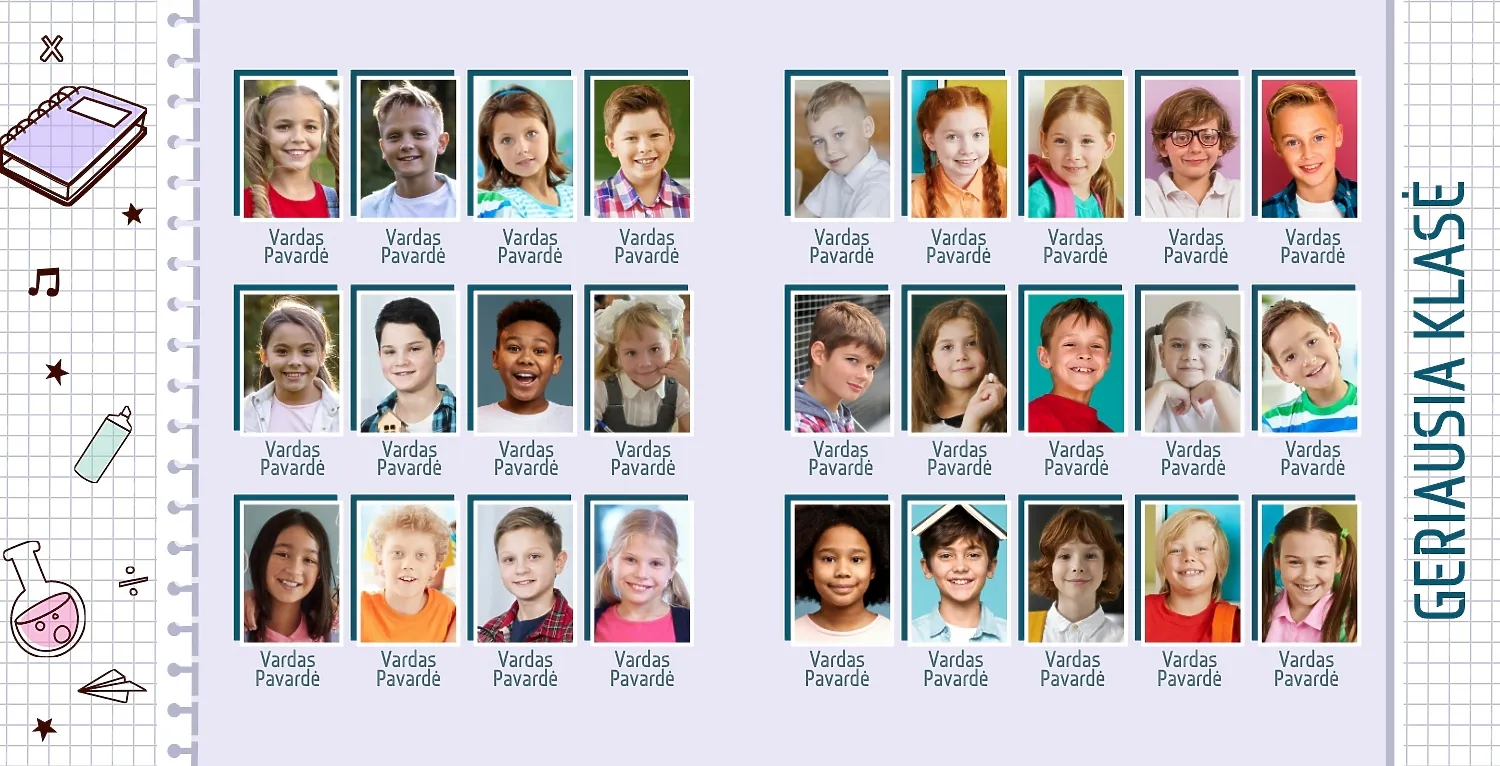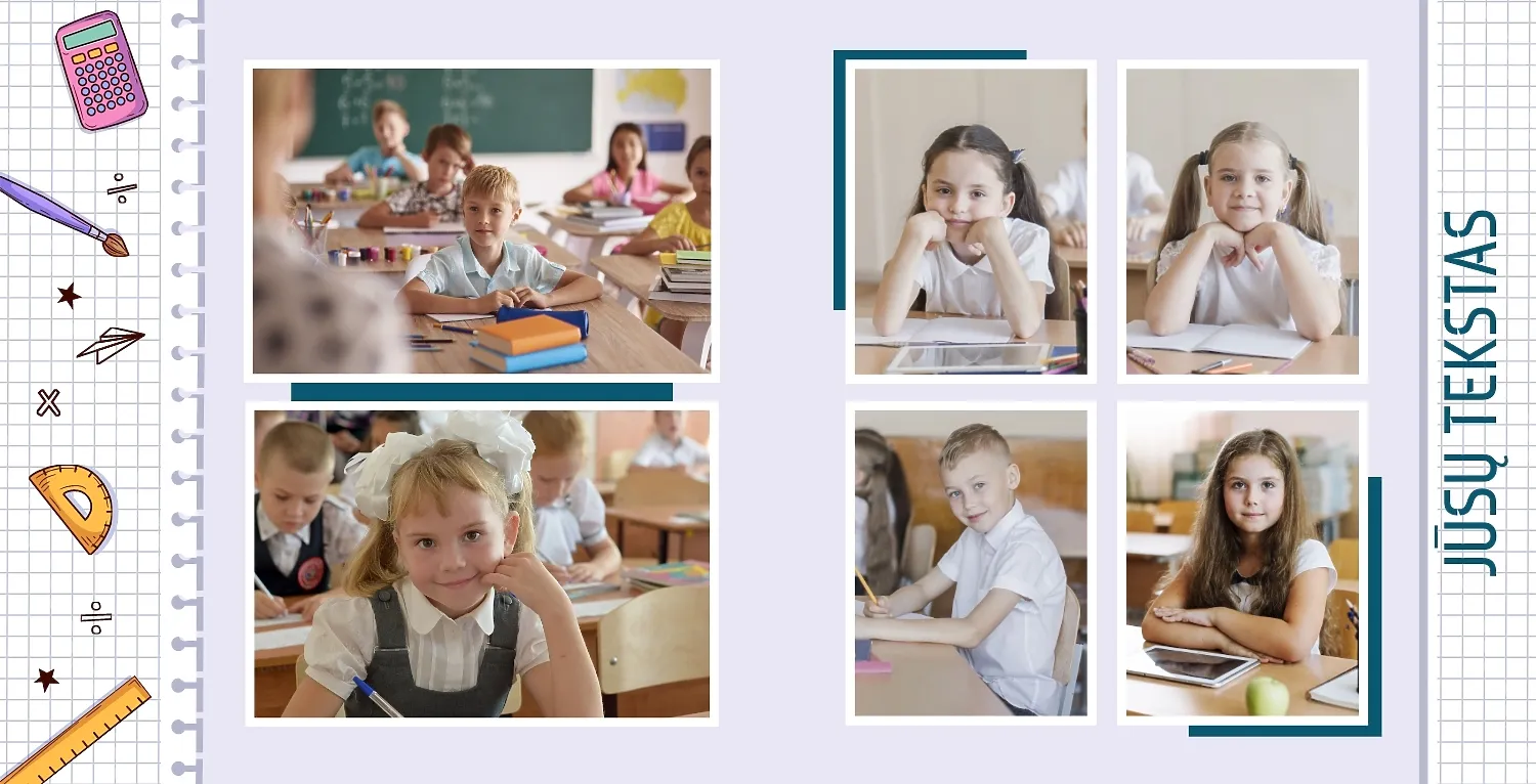 Baigimo fotoknygos šablonas jaunesniajai mokyklai-spalvingas ir jaudinantis apipavidalinimas, kuris padės išsaugoti pačius šilčiausius pirmųjų mokyklinių metų prisiminimus. Šablono dizainas sukurtas atsižvelgiant į vaikų temą: ryškios iliustracijos, subtilios spalvos, elementai, primenantys mokyklos gyvenimą – knygos, pieštukai, įrašų lentos. Internetiniame dizaineryje šį šabloną galima lengvai pakeisti, kad jis būtų unikalus. Vartotojas gali pridėti ir perkelti nuotraukas, keisti šriftus, redaguoti teksto blokus su pageidavimais ir parašais, taip pat pakeisti dekoratyvinius elementus tinkamesniu stiliumi. Galimybė pasirinkti spalvų schemą leidžia fotoknygą padaryti švelnesnę arba, atvirkščiai, prisotintą, priklausomai nuo pageidavimų. Jei pageidaujate, galite įterpti mokyklos logotipą arba individualias iliustracijas, kad pabrėžtumėte išleidimo ypatybę.